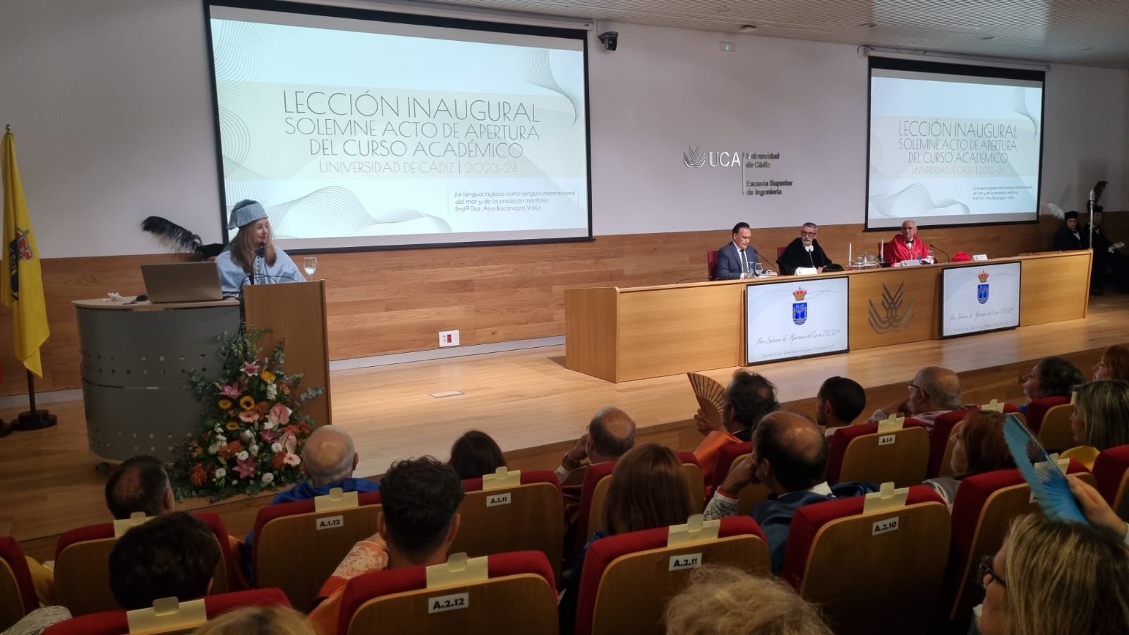 La profesora titular del área de Filología Inglesa, Ana Bocanegra Valle, ha impartido la Lección Inaugural sobre La lengua inglesa como lengua internacional del mar y de la profesión marítima. Su conferencia ha tenido por objetivos “darle visibilidad a una línea de investigación denominada Lenguas con fines académicos y profesionales y ensalzar la fuerte vinculación de nuestra universidad con el mar y los estudios marítimos en todas sus vertientes; una vinculación que le aporta a la UCA singularidad al tiempo que refuerza su identidad entre las universidades andaluzas y españolas”. En sus palabras, desde el marco del inglés como lengua franca internacional en contextos académicos y profesionales, ha puesto en valor el papel de la lengua inglesa en el ámbito profesional marítimo y su singularidad como lenguaje especializado: “en un sector fuertemente internacionalizado en el que sólo uno de cada diez tripulantes en la flota mundial es nativo en lengua inglesa, llegar a dominar esta jerga profesional no es una tarea fácil”.