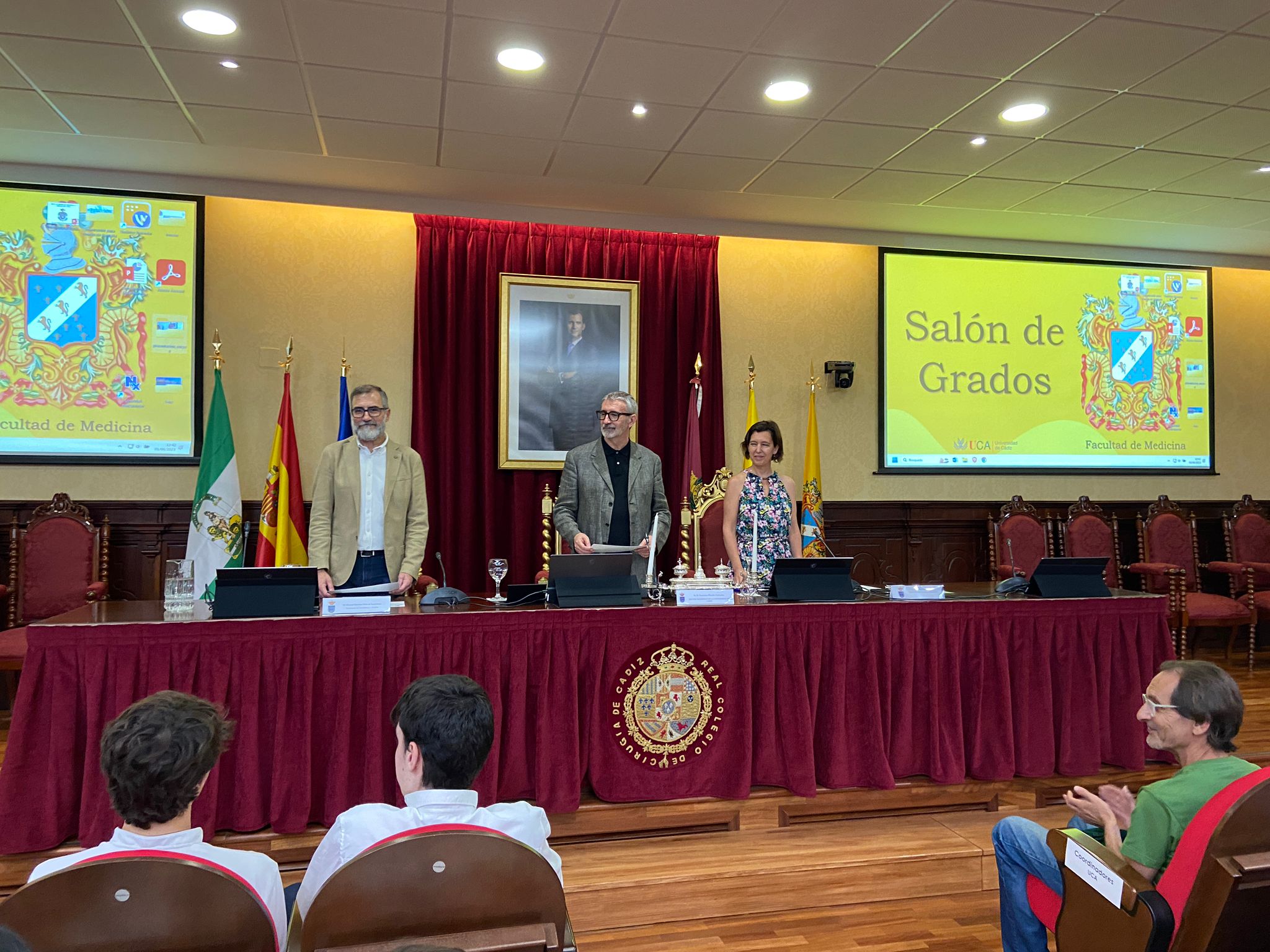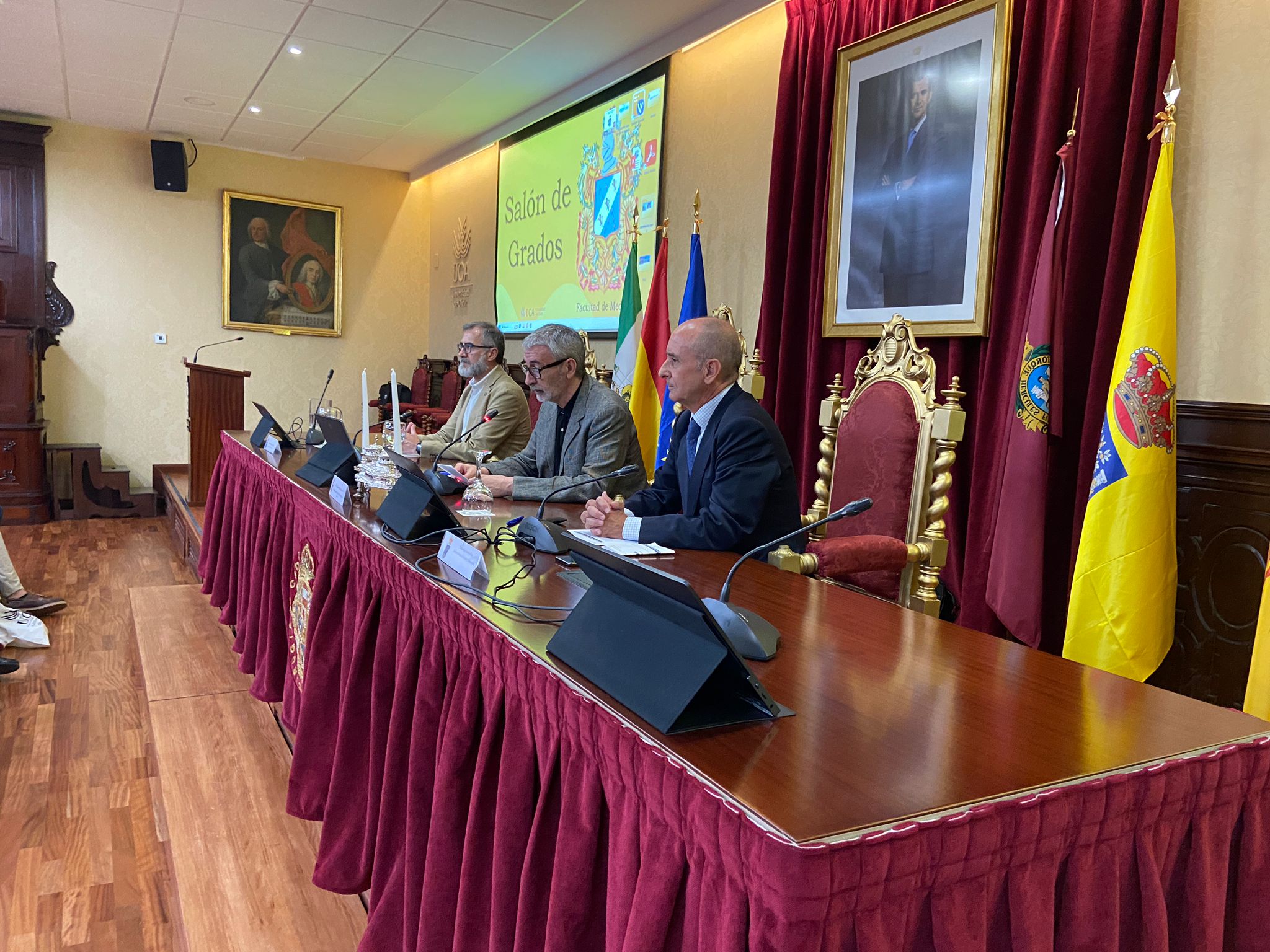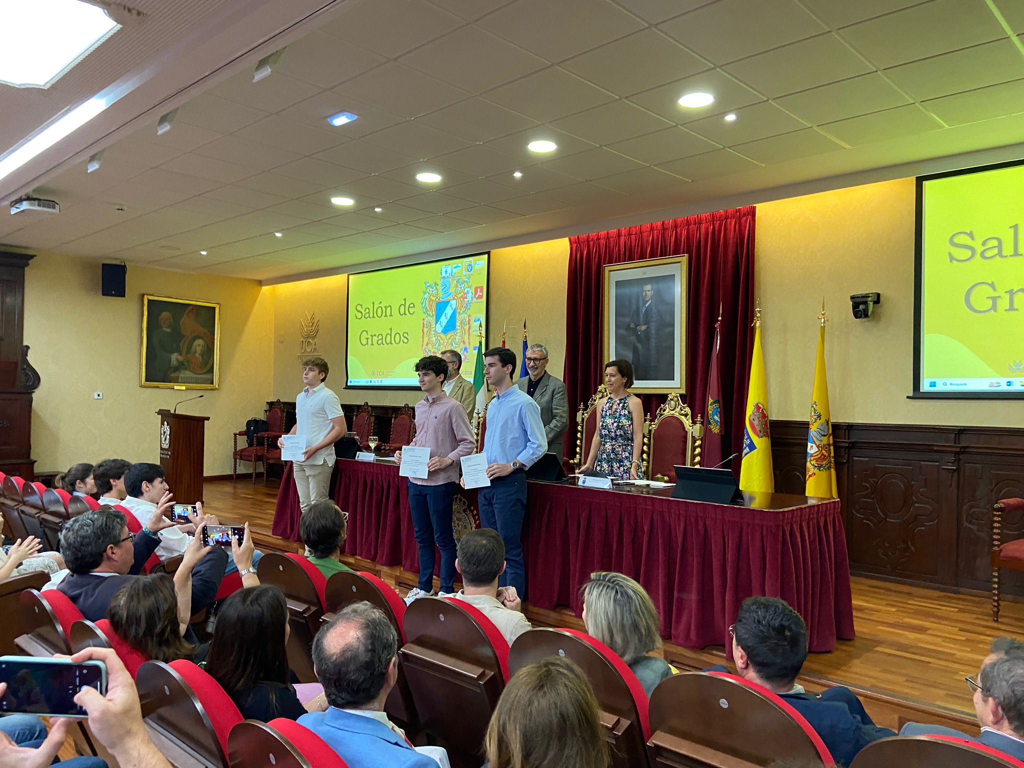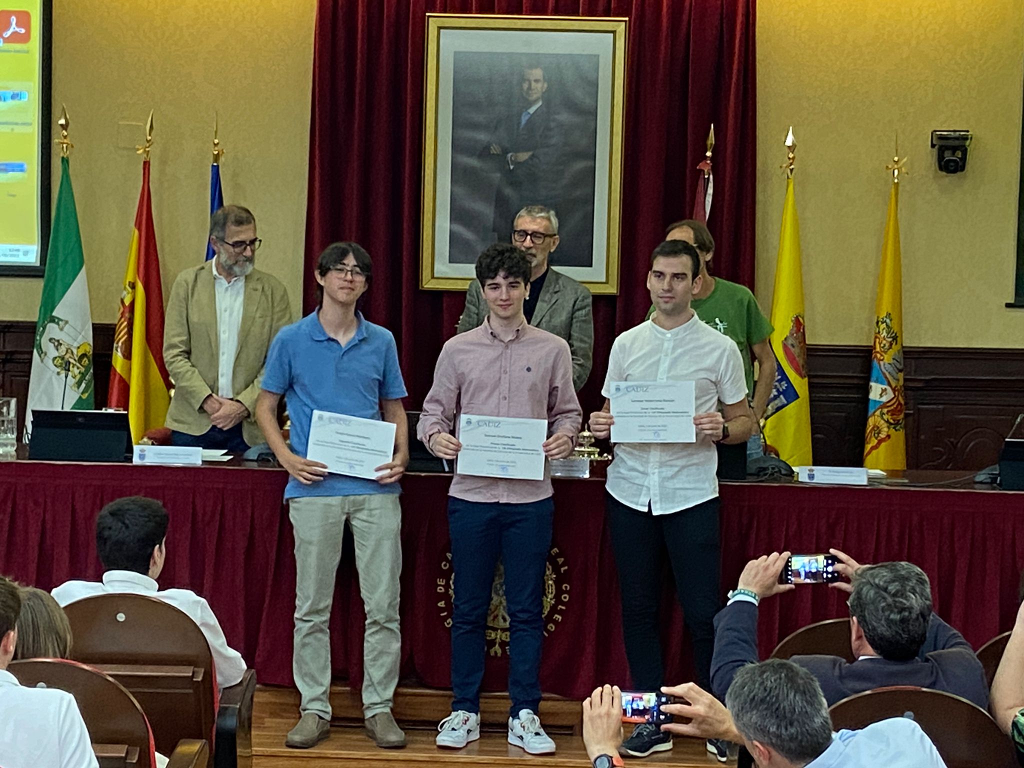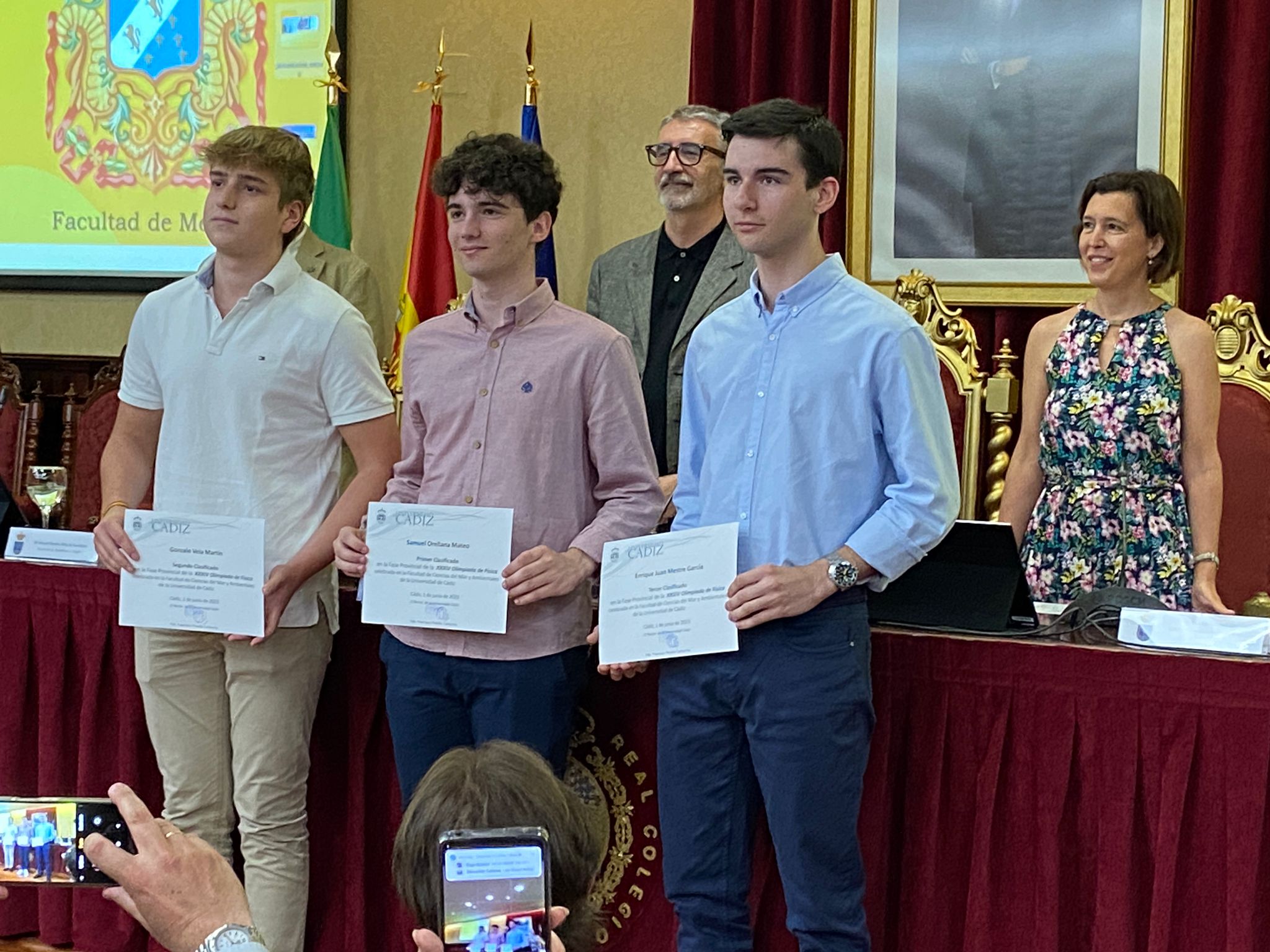 El rector de la Universidad de Cádiz, Francisco Piniella, acompañado por el vicerrector de Estudiantes y Empleo, Manuel Sánchez, y el director General de Acceso y Orientación, Rodrigo Sánchez, ha presidido esta mañana la entrega de diplomas en el salón de grados de la Facultad de Medicina a los alumnos y las alumnas ganadores, de las Olimpiadas de Matemáticas, Geología, Química, Física, Economía y Lenguas Clásicas del curso 2022/23.