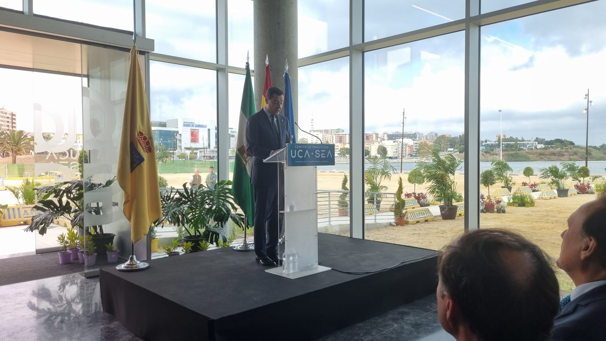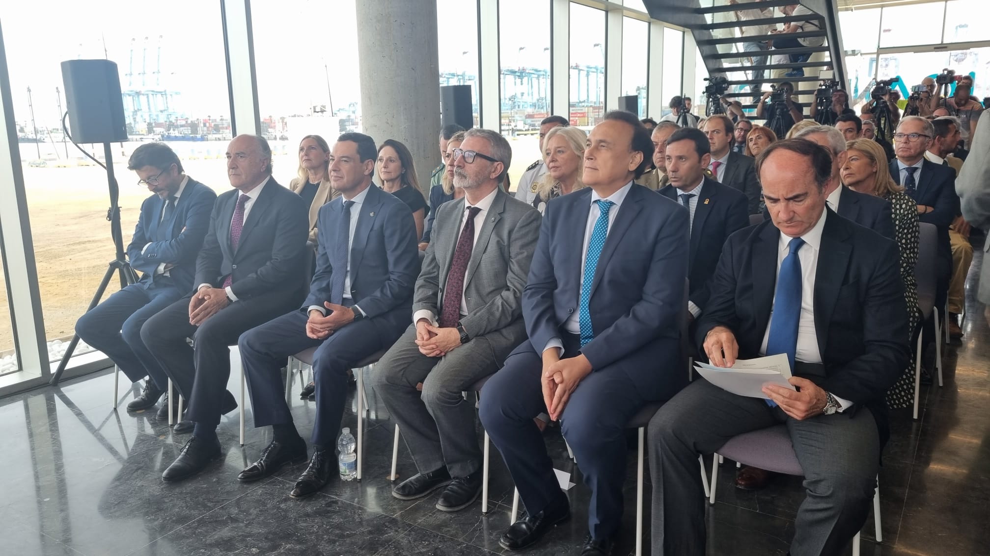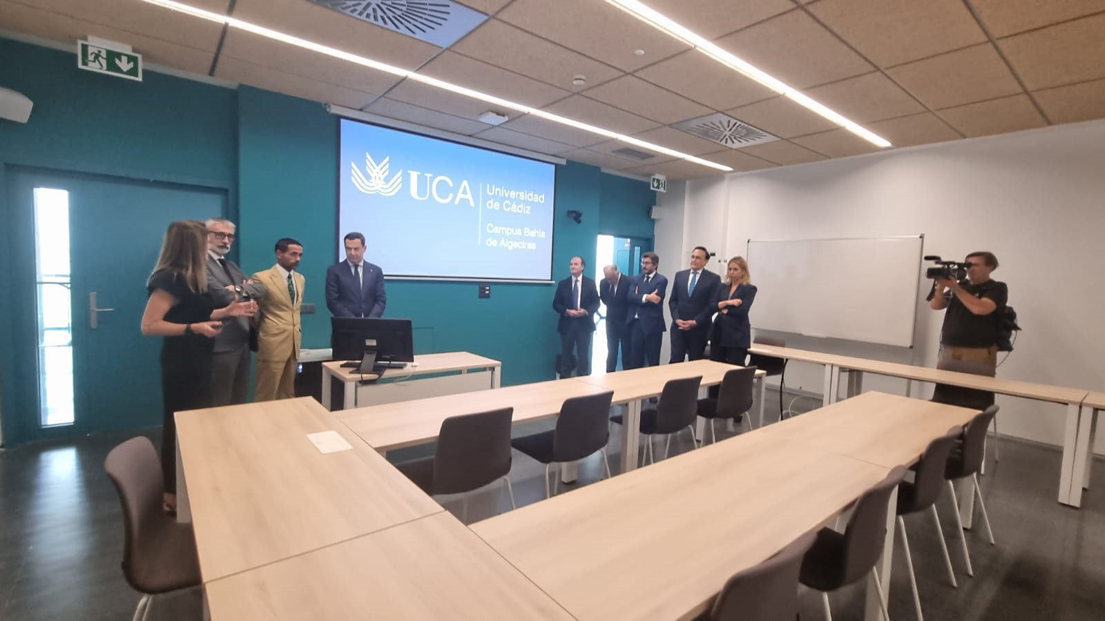 El presidente de la Junta de Andalucía, Juan Manuel Moreno Bonilla, y el rector en funciones de la Universidad de Cádiz, Francisco Piniella, junto al alcalde de Algeciras, José Ignacio Landaluce, y el presidente de la Autoridad Portuaria Bahía de Algeciras, Gerardo Landaluce, han inaugurado el nuevo edificio del Centro de Innovación UCA-SEA que forma parte del proyecto Lago Marítimo de Algeciras. Ubicado en terrenos del Puerto de Algeciras, ha contado con la financiación de 4,5 millones de euros de fondos europeos gestionados por el Ejecutivo autonómico y se integra en un importante proyecto de transformación de la ciudad.