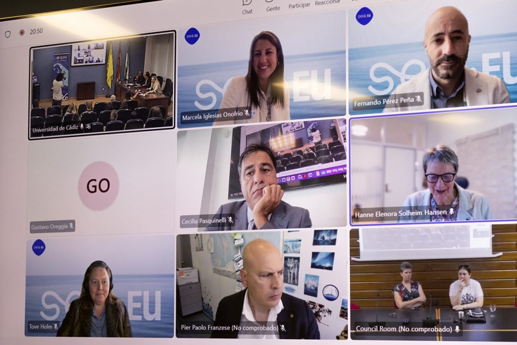 El acto ha comenzado con la entrada de autoridades académicas y la conexión online con los campus socios. Junto al rector de la UCA han intervenido el decano de la Facultad de Ciencias del Mar y Ambientales y el decano de la Facultad de Ciencias Económicas y Empresariales, que han dado la bienvenida en nombre de los centros anfitriones. Posteriormente, se han sucedido los saludos institucionales de representantes internacionales de todas las universidades socias de la Alianza SEA-EU, conectados online desde Noruega, Polonia, Alemania, Croacia, Italia, Portugal, Malta y Francia.