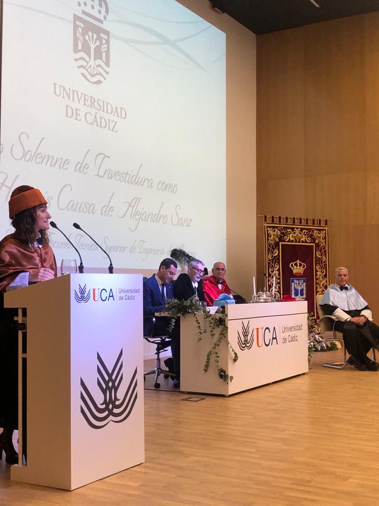 Con anterioridad, la profesora doctora de la Universidad de Cádiz y directora de la ETSI de Algeciras, Paloma Cubillas, como madrina del doctor Honoris Causa ha leído su laudatio, donde ha desglosado sus principales méritos y trayectoria artística: “la música, y como ésta las demás artes, son esenciales para asegurar la construcción de una sociedad empática, sensible y por ende eficiente y equilibrada. Gracias a todas aquellas personas que hacen de la música y de las artes parte de su vida y aportan a la sociedad ese bien tan necesario, en especial gracias a nuestro doctorando”, así como su vínculo con la provincia gaditana y la cultura andaluza. “Alejandro Sanz – ha continuado – ha llevado siempre su acento andaluz como marca indiscutible de su propia identidad, en tiempos incluso donde este acento podía tener asociada una carga peyorativa, relacionada por defecto a bajas clases sociales, o al ciudadano de cola. Nos atrevemos a decir que creó marca, orgulloso de su origen gaditano y reforzando las bases para que otros artistas, actores o presentadores, mostraran su acento andaluz sin tener que esconderlo ni avergonzarse de ello”.