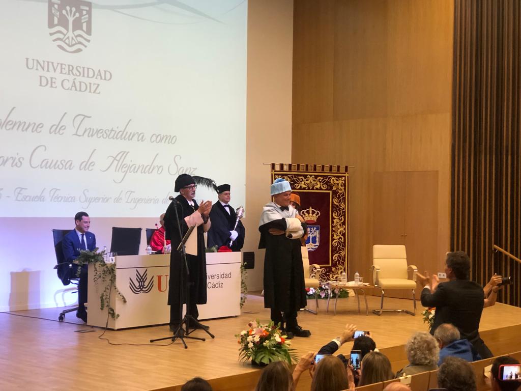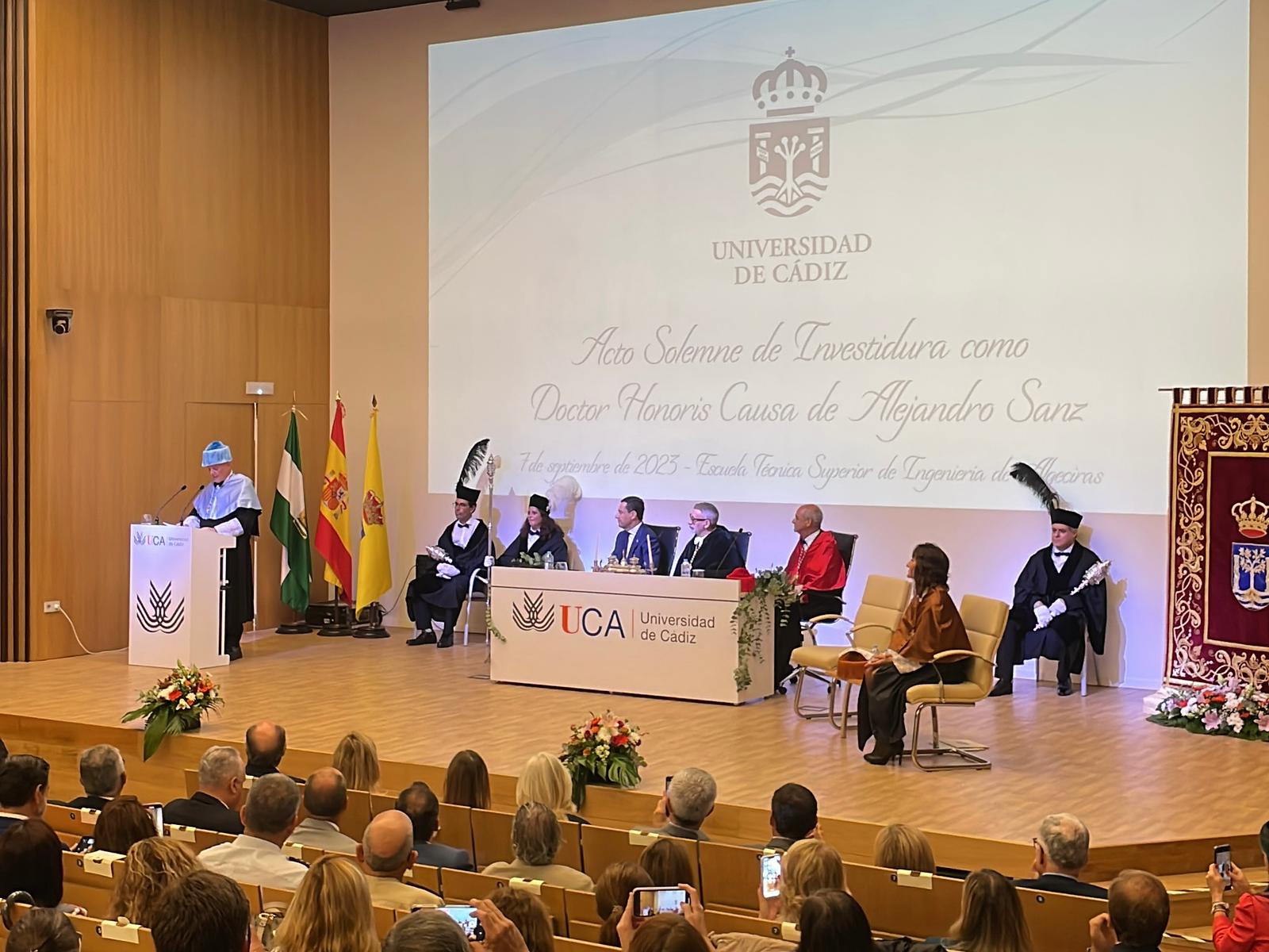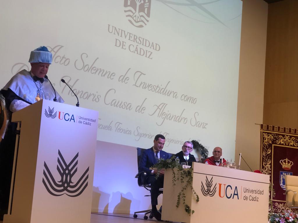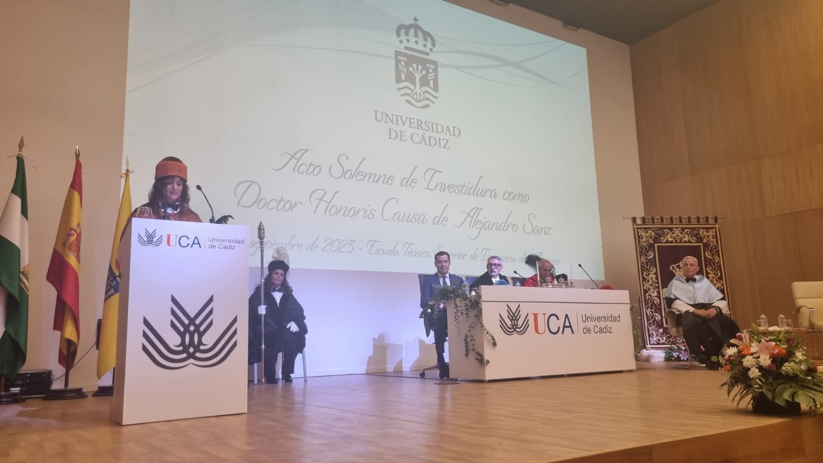La Universidad de Cádiz ha celebrado hoy, en el salón de Actos de la Escuela Técnica Superior de Ingeniería (ETSI) de Algeciras, el Acto Solemne de investidura de doctor Honoris Causa del músico Alejandro Sánchez Pizarro (Alejandro Sanz). El rector en funciones de la UCA, Francisco Piniella, junto al presidente de la Junta de Andalucía, Juan Manuel Moreno, ha presidido la ceremonia, que se ha podido seguir en directo por videostreaming, en compañía de una representación del Claustro Universitario y de autoridades académicas, civiles y militares.