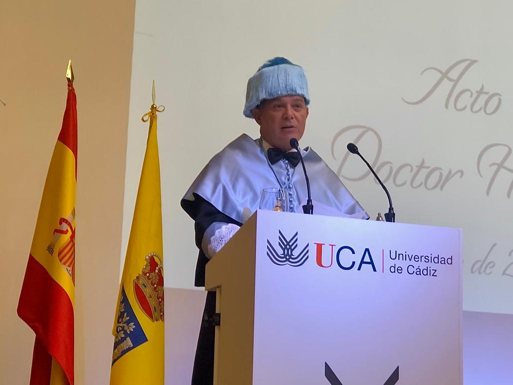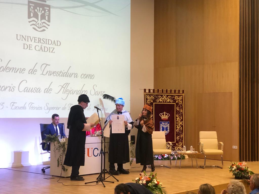 El Claustro de la Universidad de Cádiz, a propuesta del Consejo de Dirección de la UCA, ratificó el pasado mes de marzo de 2023 la concesión del grado de doctor Honoris Causa a Alejandro Sánchez Pizarro, propuesta aprobada por el Consejo de Gobierno en diciembre de 2022, según establece el artículo 232 de los Estatutos de la UCA y el artículo 4º del Reglamento que regula el procedimiento para la concesión del grado de doctorado Honoris Causa.