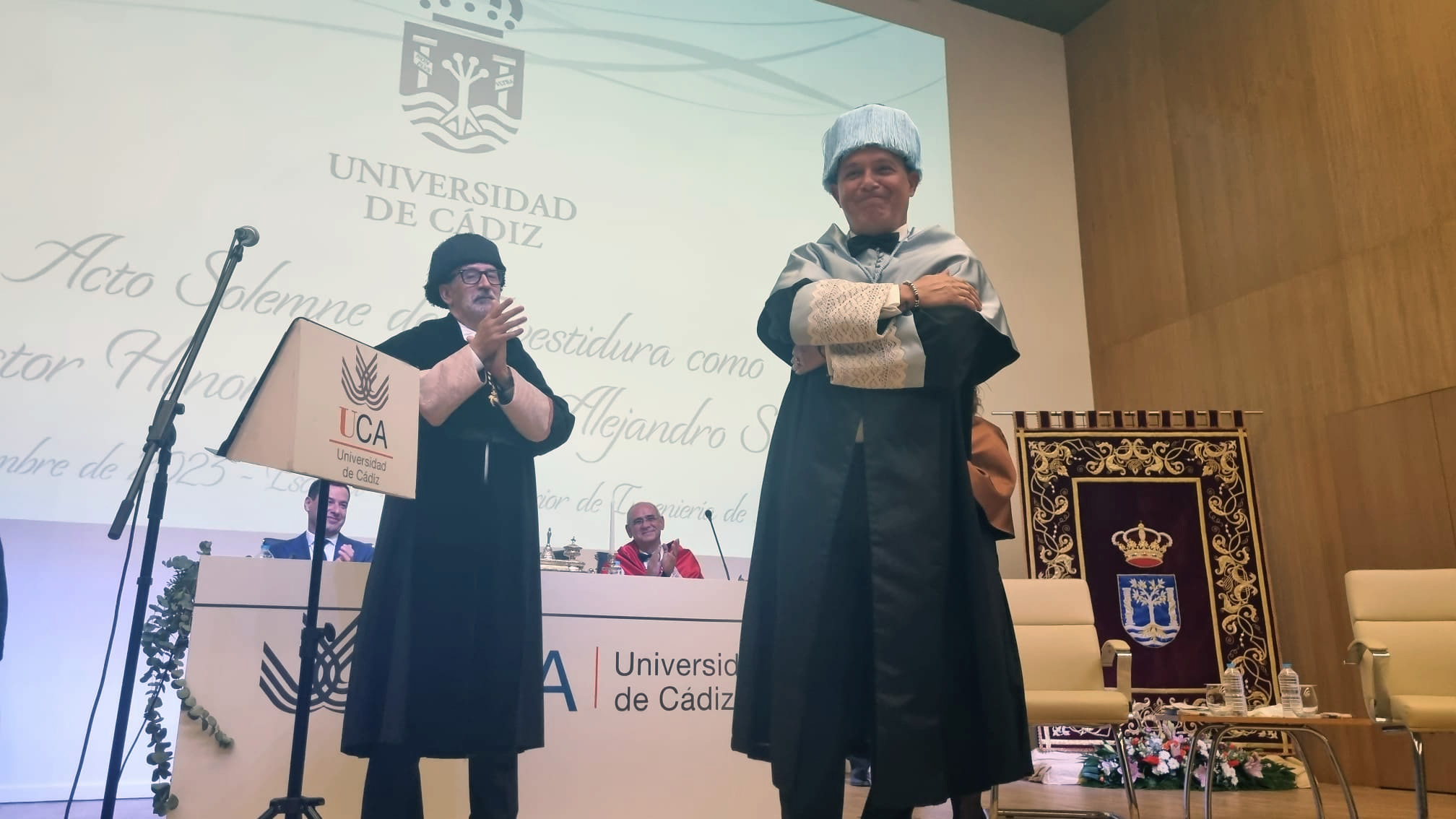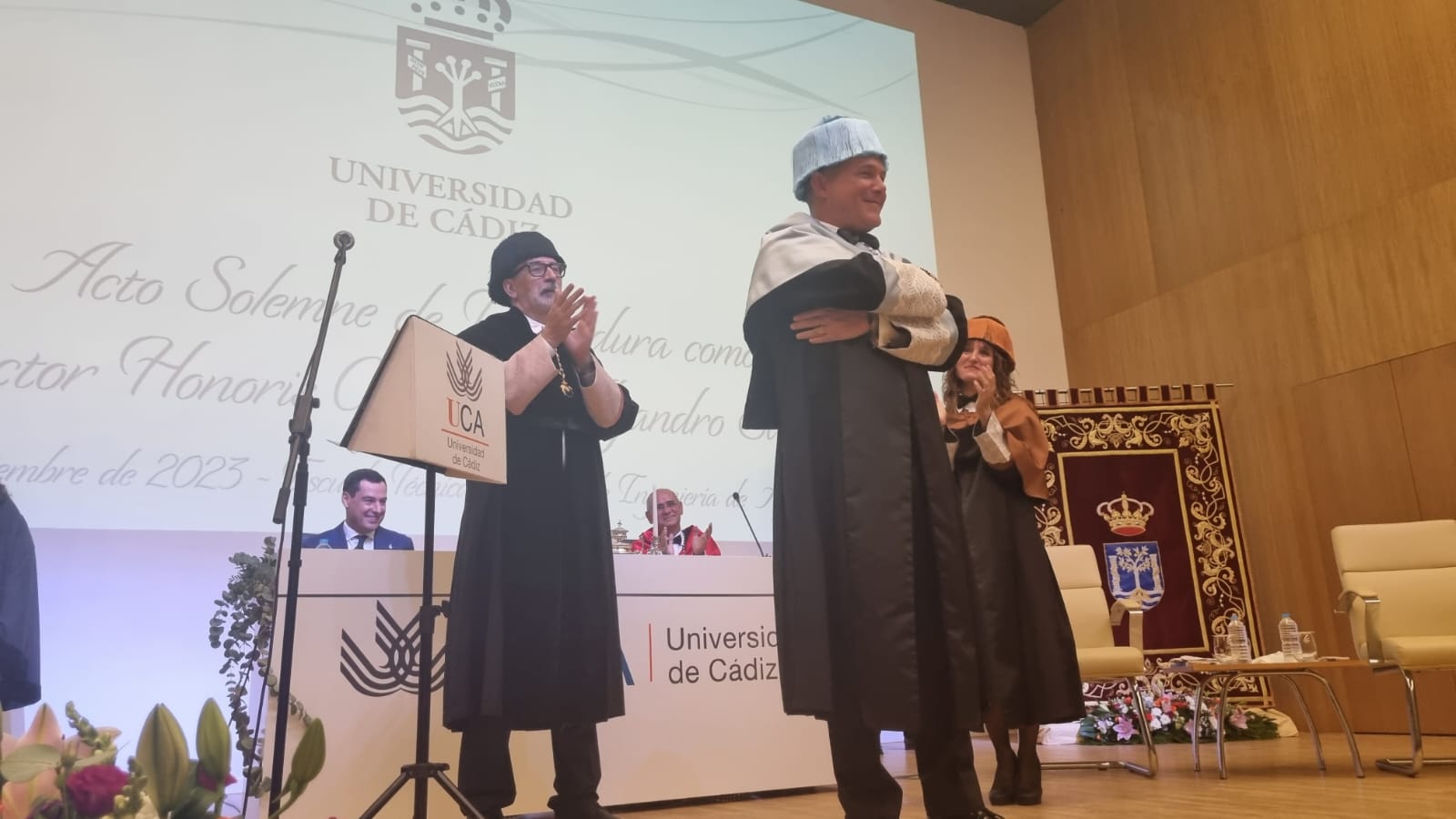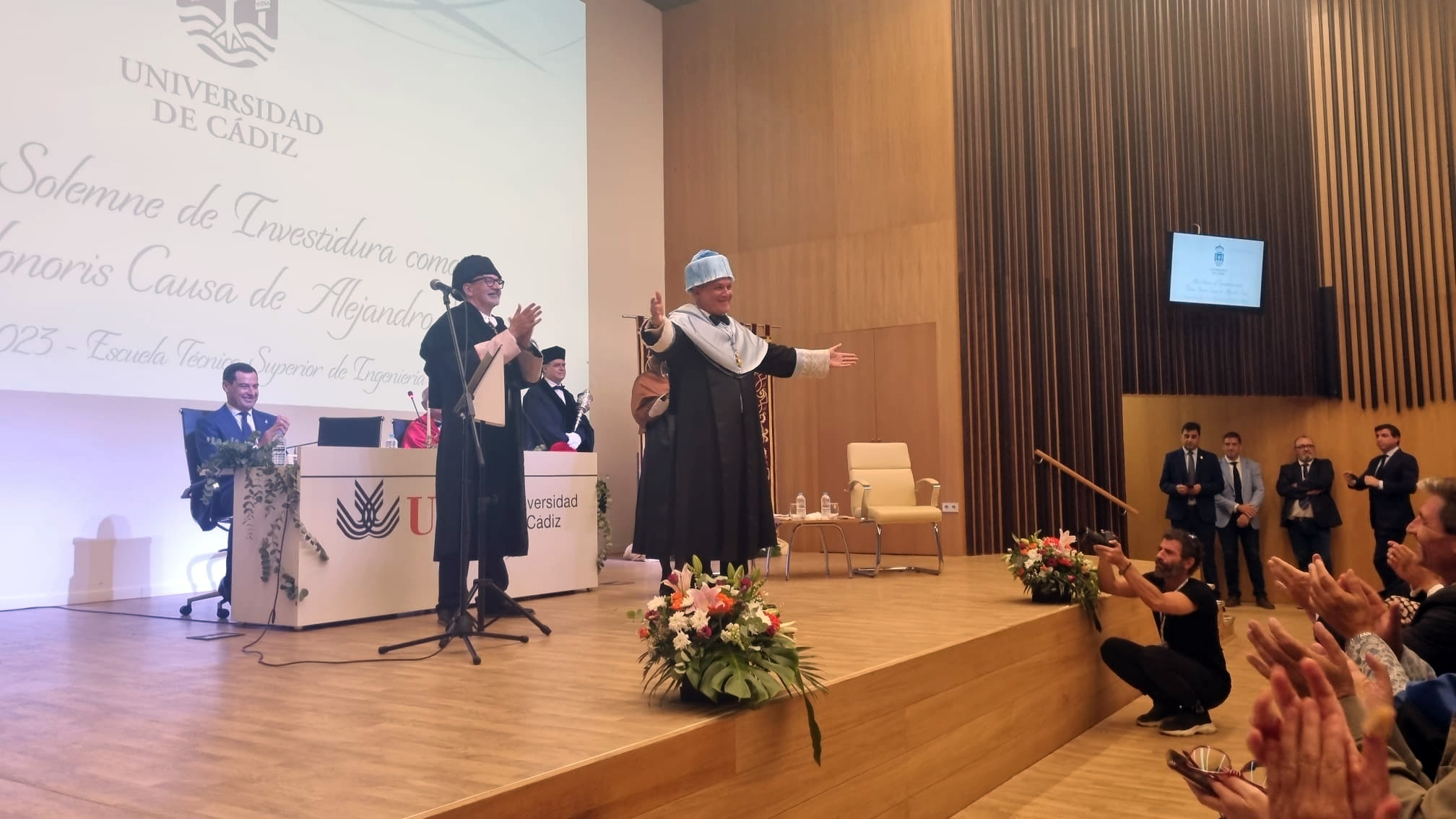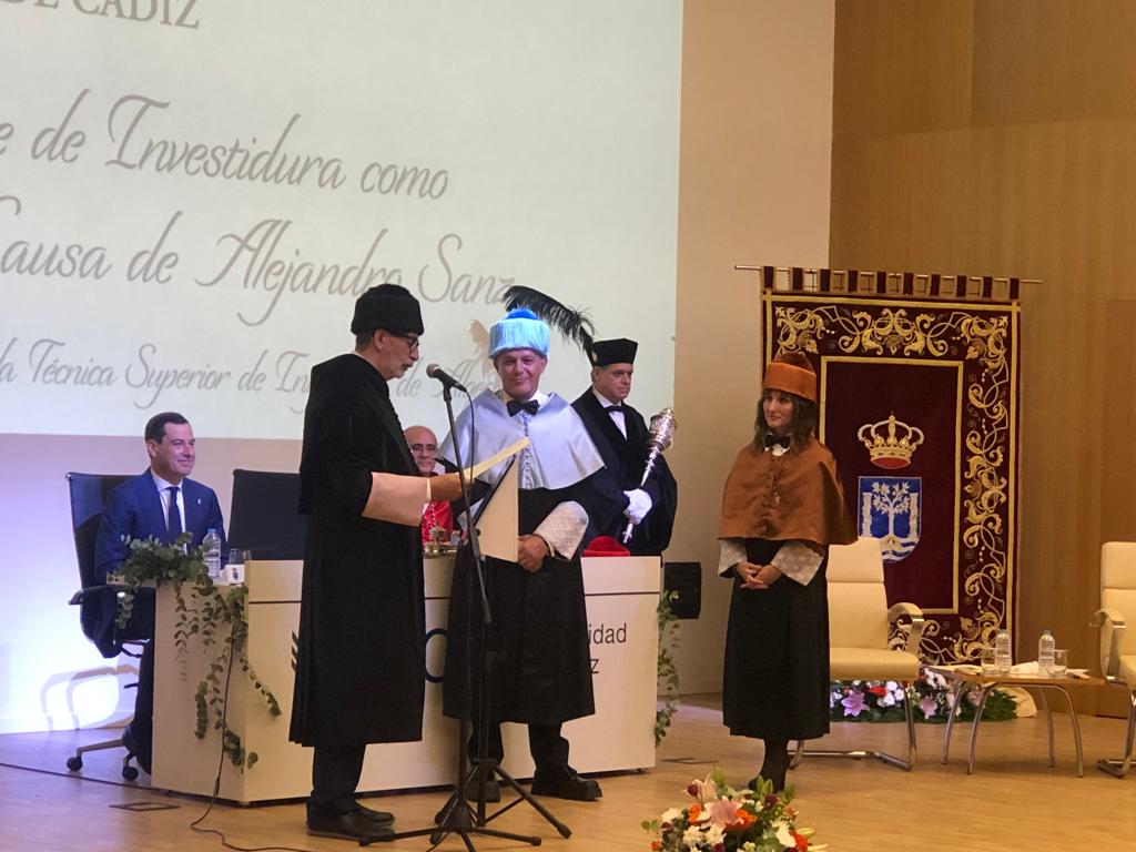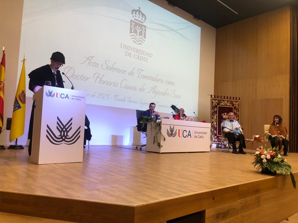 El rector en funciones de la UCA se ha dirigido ya al recién nombrado doctor Honoris Causa para precisar que “la Universidad de Cádiz te abre hoy de par en par las puertas de su Claustro. Su lugar más selecto y escogido. Grandes nombres de las ciencias y las artes forman parte de este olimpo donde tu nombre, desde hoy, figurará al lado de Rafael Alberti, Fernando Quiñones, Carlos Castilla del Pino, José Manuel Caballero Bonald, Andrés Segovia, Margarita Salas, Marcelino Camacho, Nicolás Redondo, Almudena Grandes o Francisco Sánchez Gómez, nuestro querido Paco de Lucía”. Esta investidura, ha confirmado, “es un acto, solemne, emotivo y decidido de apoyo y reconocimiento a nuestra cultura y a nuestro patrimonio musical en la figura de creadores como tú”. Al mismo tiempo, ha señalado al nuevo doctor que “ante todo y sobre todo, eres músico”, y por ello: “debes saber, Alejandro, que tus canciones ya no son tuyas. Al cantarlas por primera vez, iniciaron irreversiblemente un peregrinaje colectivo imposible de medir o de controlar. Forman parte indisoluble del patrimonio musical y cultural de este país”.