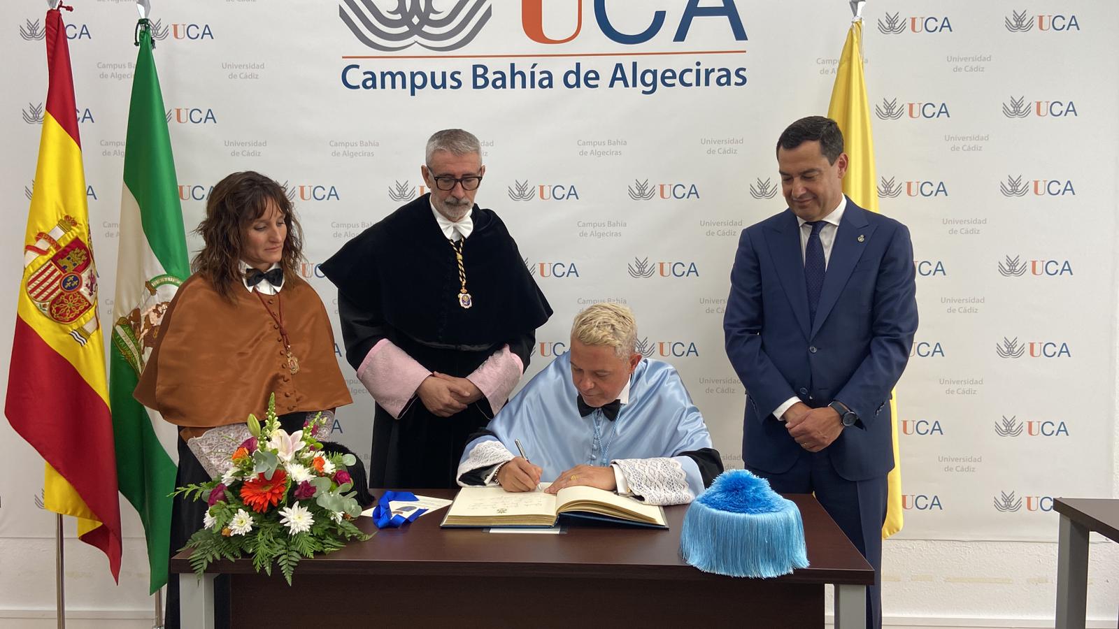 Al finalizar el acto, Alejandro Sanz y Juan Manuel Moreno han firmado en el Libro de Honor de la Universidad de Cádiz, en compañía de Francisco Piniella y Paloma Cubillas.