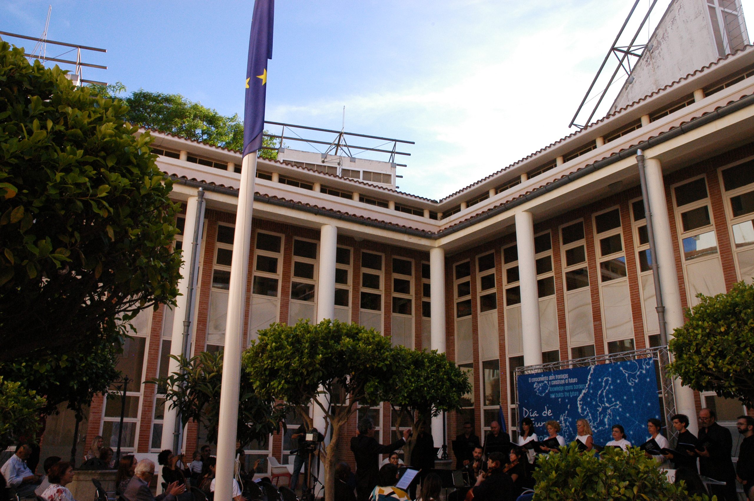 El edificio Hospital Real ha acogido un acto conmemorativo con izada de bandera europea e interpretación del himno de Europa en el ‘Patio de las Naciones’