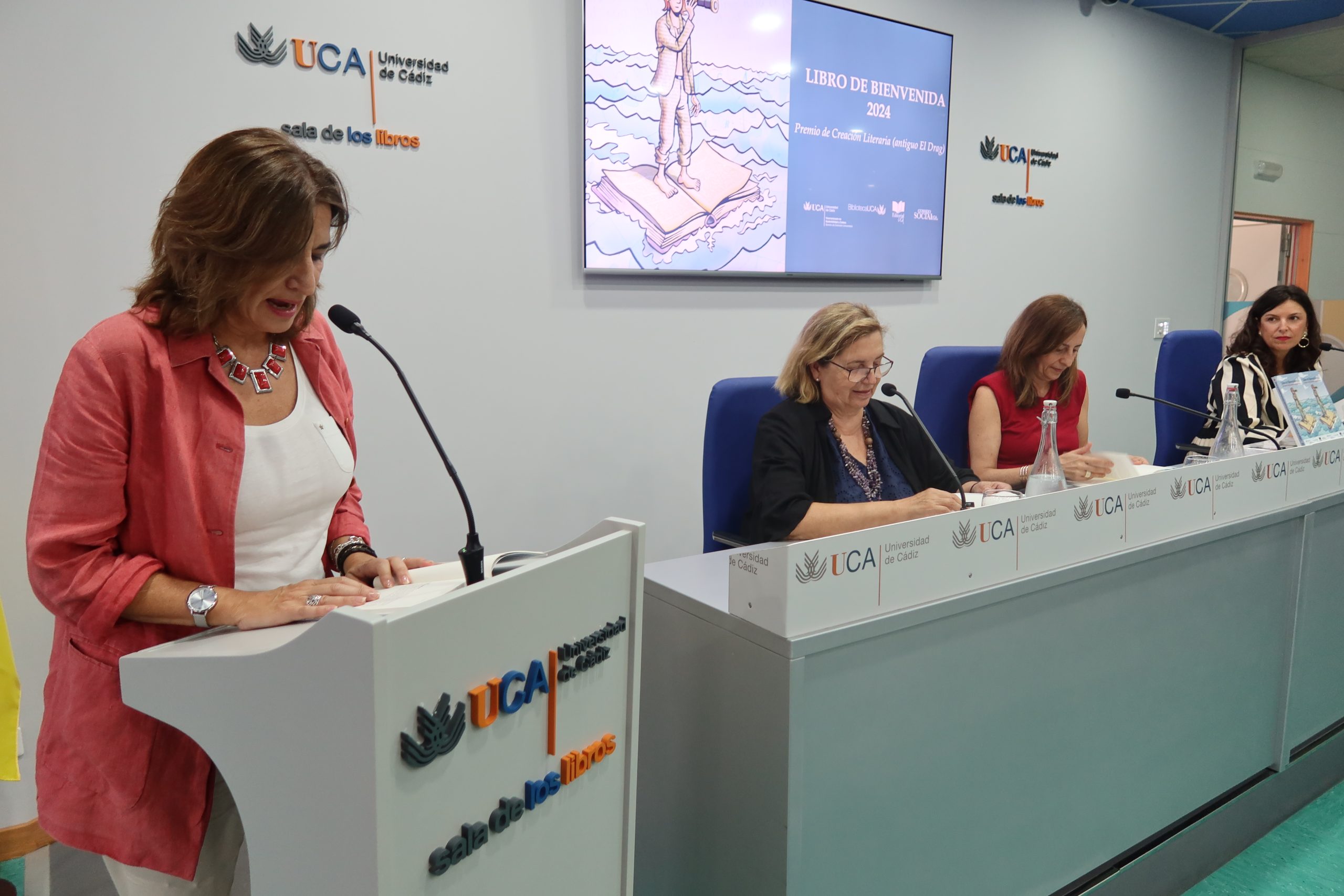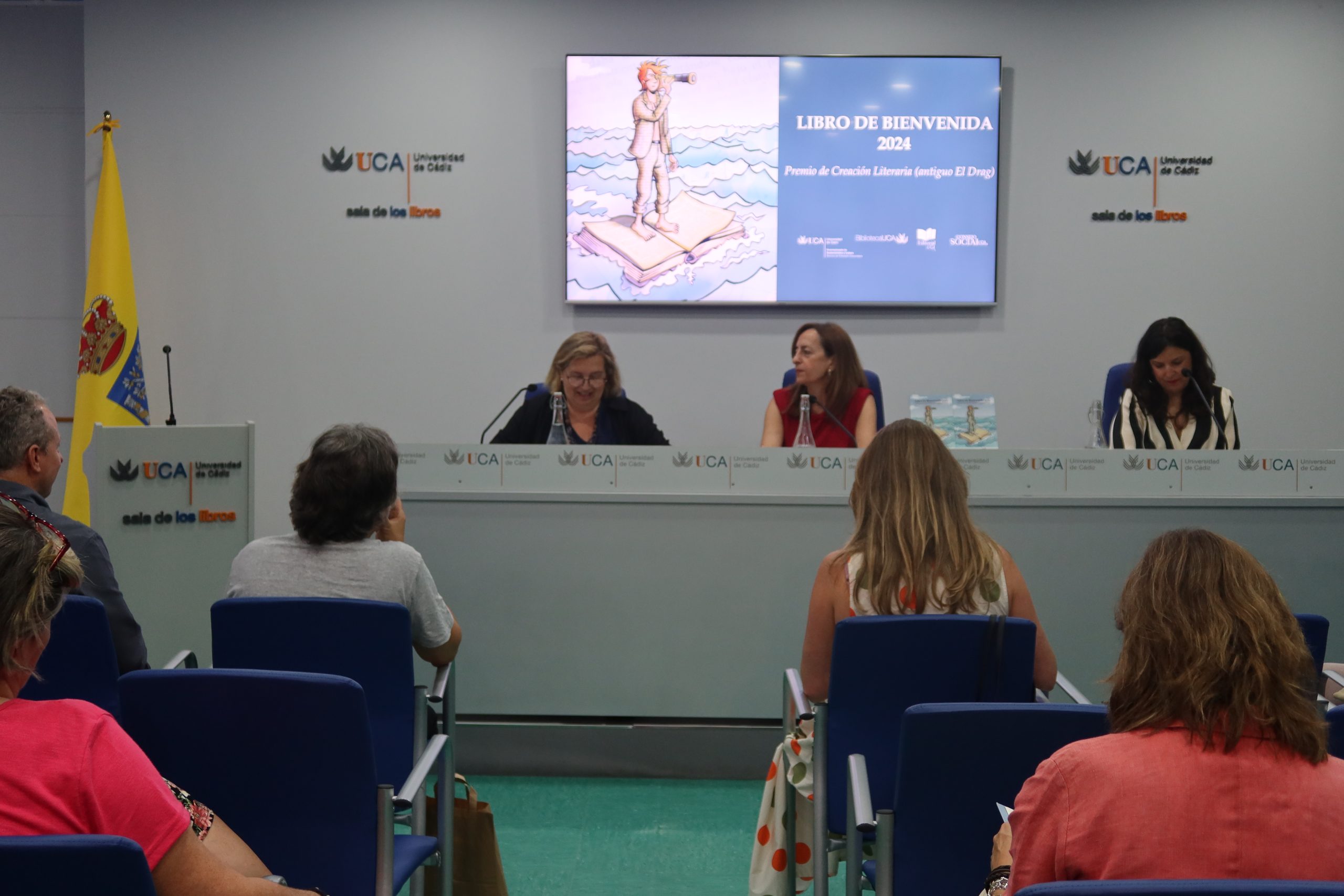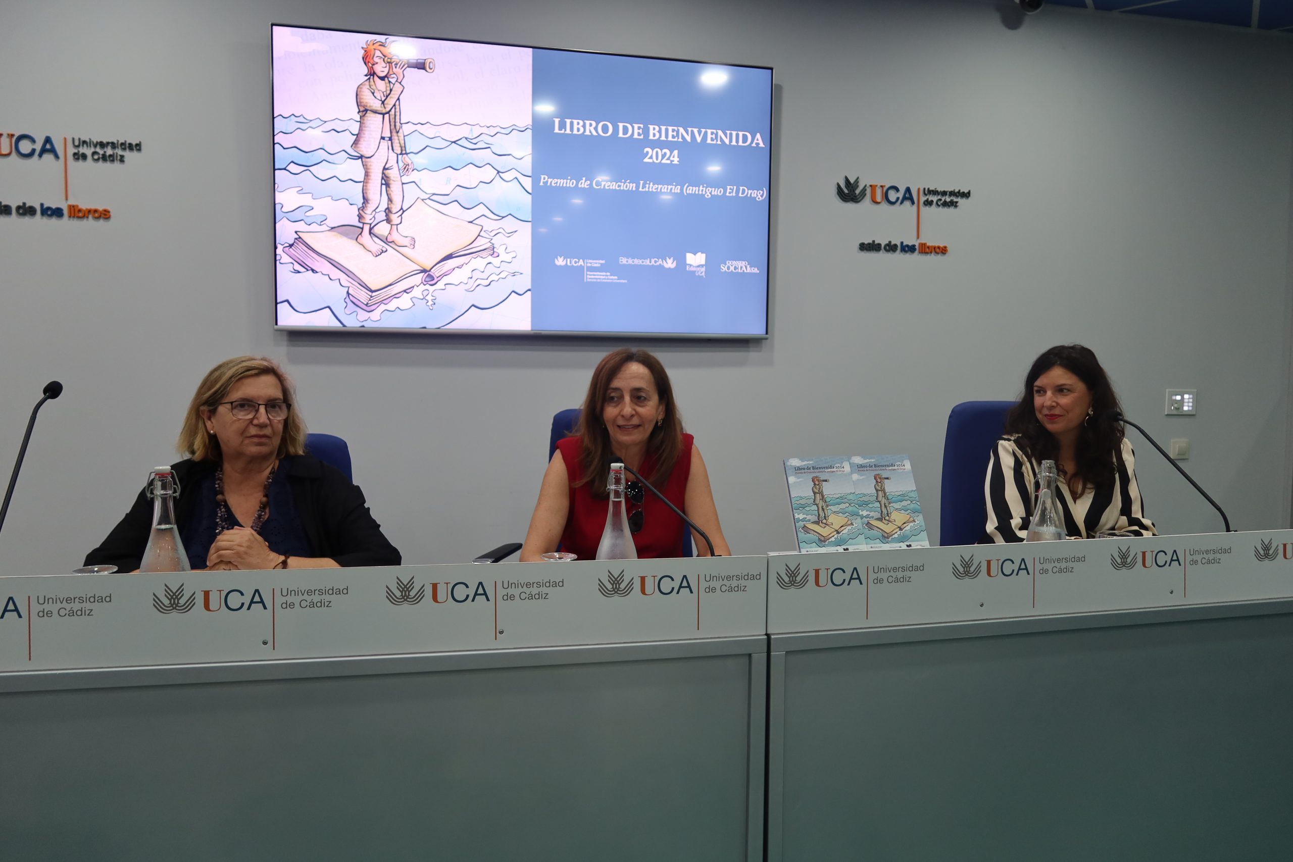 La Universidad de Cádiz ha presentado, en la sala de Los Libros del edificio Andrés Segovia, el Libro de Bienvenida de la UCA, que se repartirá al nuevo alumnado de este curso. El acto ha contado con la presencia de la vicerrectora de Investigación y Transferencia, Mª Jesús Ortega, la directora General de Cultura, Ester Trigo, y la consejera del Consejo Social de la UCA, Rita Benítez.