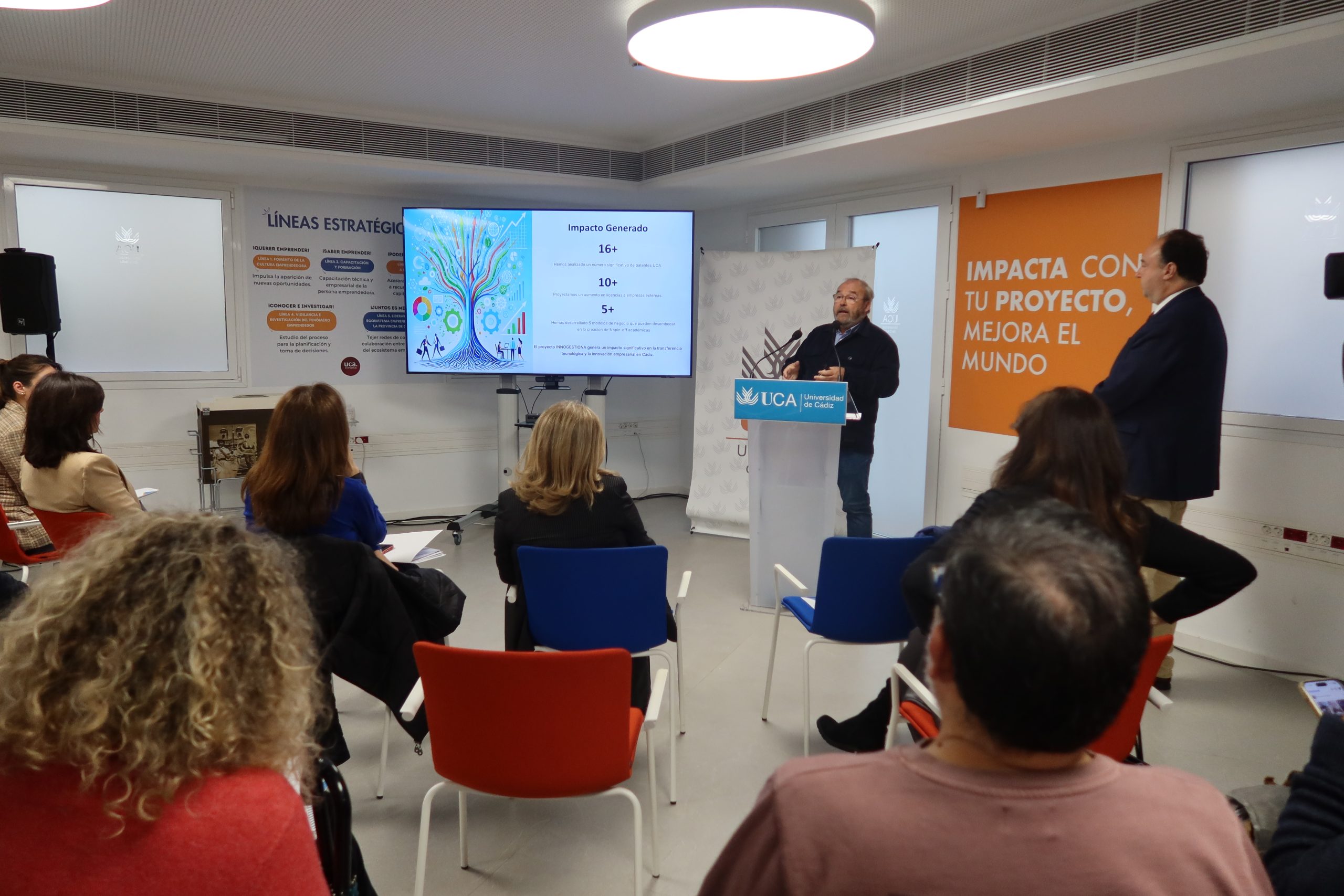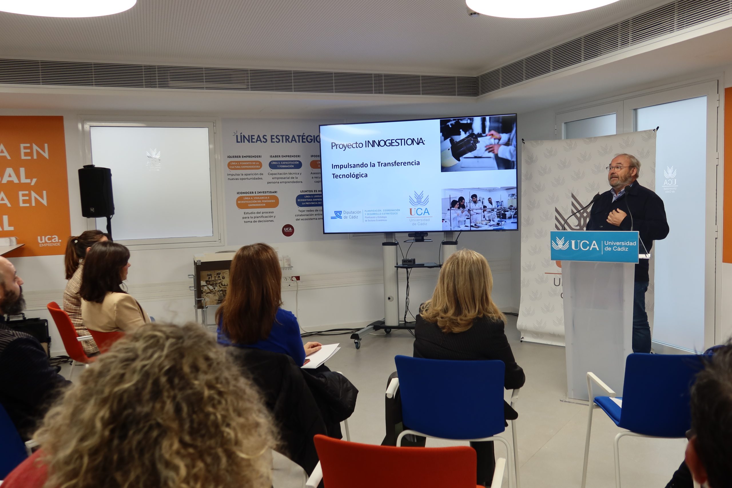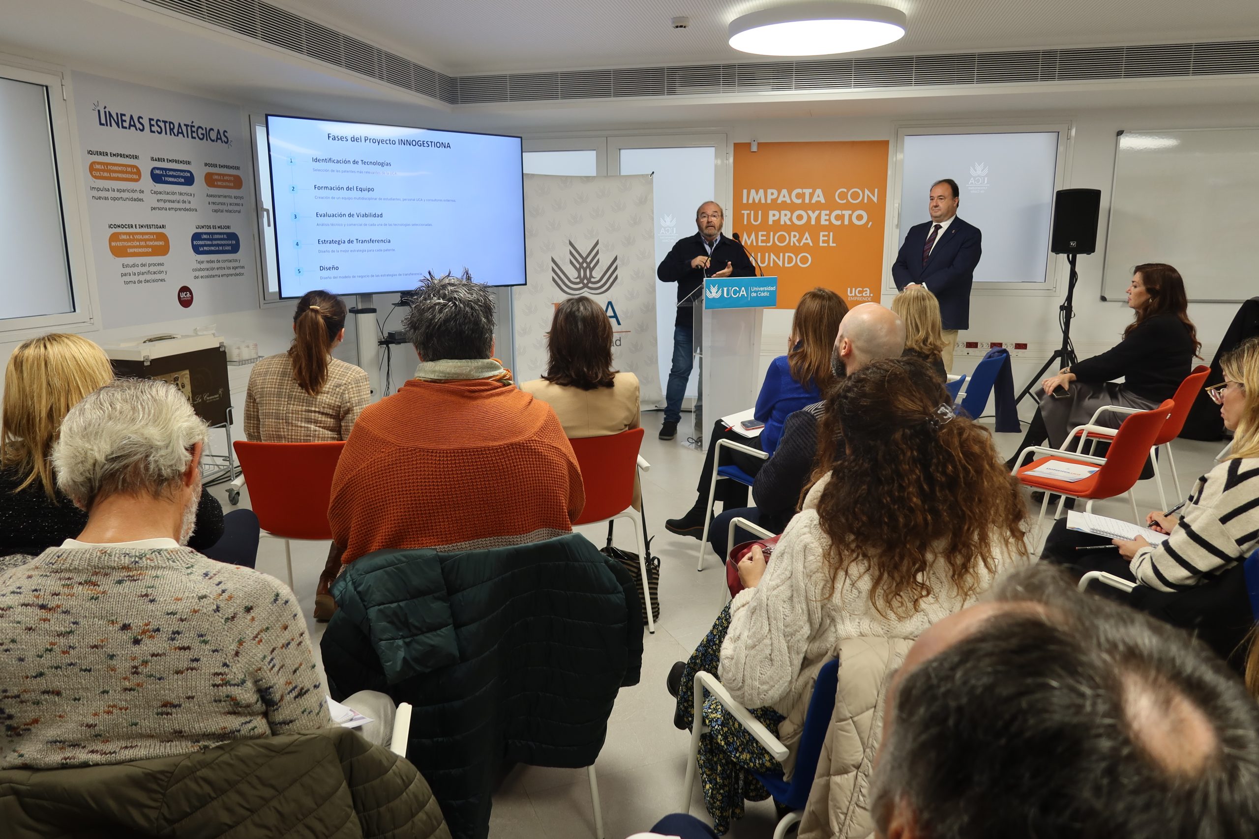 Otra de estas iniciativas, en este caso desarrollada en colaboración entre el Vicerrectorado de Emprendimiento y Empleabilidad (a través de UCA Emprende) y el Vicerrectorado de Investigación y Transferencia (a través de la OTRI), es el programa ‘Innogestiona’. Una iniciativa que pretende fomentar la explotación comercial de las patentes con mayor potencial, principalmente a través de la creación de empresas spin-off universitarias. Esta iniciativa, financiada por el área de Planificación, Coordinación y Desarrollo Estratégico de la Diputación de Cádiz, a través del programa Plan Dipuinnova +, involucra a estudiantes en la identificación y evaluación de oportunidades de mercado de una selección de las tecnologías patentadas más prometedoras, desarrolladas por grupos de investigación de diferentes áreas de conocimiento. Los avances de esta iniciativa fueron presentados también esta mañana por parte del director general de Emprendimiento, José Manuel Sánchez, quien señaló que “Para llevar a cabo esta iniciativa este año, se ha formado un equipo multidisciplinar de estudiantes de las áreas de ciencias, ingeniería y ciencias sociales, que trabaja en la identificación y evaluación de oportunidades de mercado para las tecnologías desarrolladas, facilitando así la transferencia de conocimientos y tecnologías desde la universidad hacia el sector empresarial. El equipo cuenta con la supervisión y tutorización de personal técnico de la Oficina de Transferencia de Resultados de Investigación (OTRI) y del servicio UCA Emprende”.
