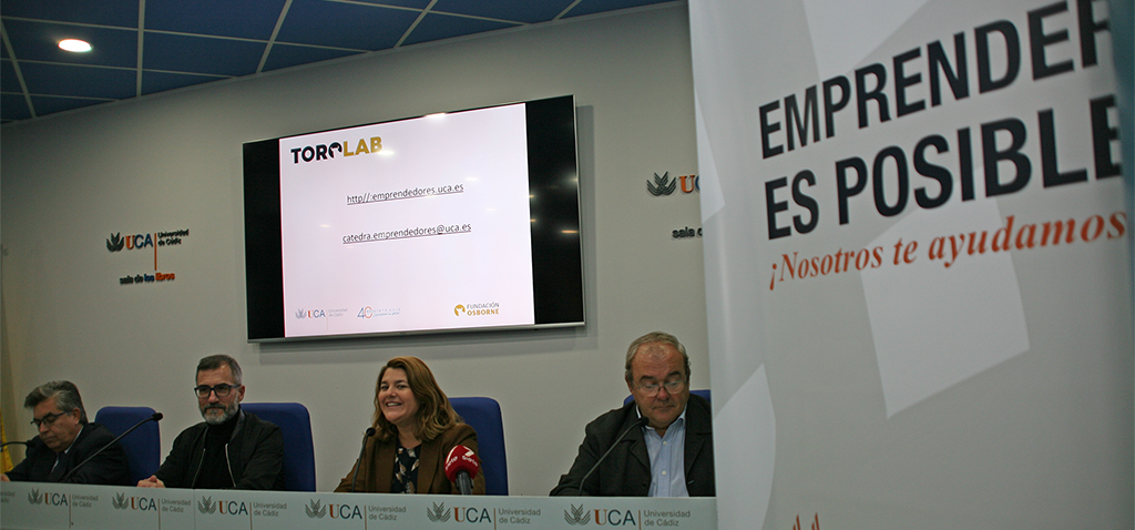 La Universidad de Cádiz y la Fundación Osborne han celebrado hoy, en la sala de los Libros del edificio Andrés Segovia, la clausura de la segunda edición del proyecto TOROLAB, factoría de iniciativas emprendedoras basadas en el conocimiento universitario. El vicerrector de Estudiantes y Empleo de la UCA, Manuel Sánchez, el director de la Fundación Osborne, Antonio Abad, la responsable de Comunicación y RR.PP. del Grupo Osborne y Fundación Osborne, Carla Terry, y el director General de Emprendimiento, Empresa y Egresados de la UCA, José Manuel Sánchez, han presidido el acto, donde se ha comunicado el trabajo ganador de este año. Una quincena de estudiantes de diferentes grados, másteres y doctorados de la UCA han participado en este proyecto para aportar mejoras desde el conocimiento universitario a la marca y productos del grupo Osborne.