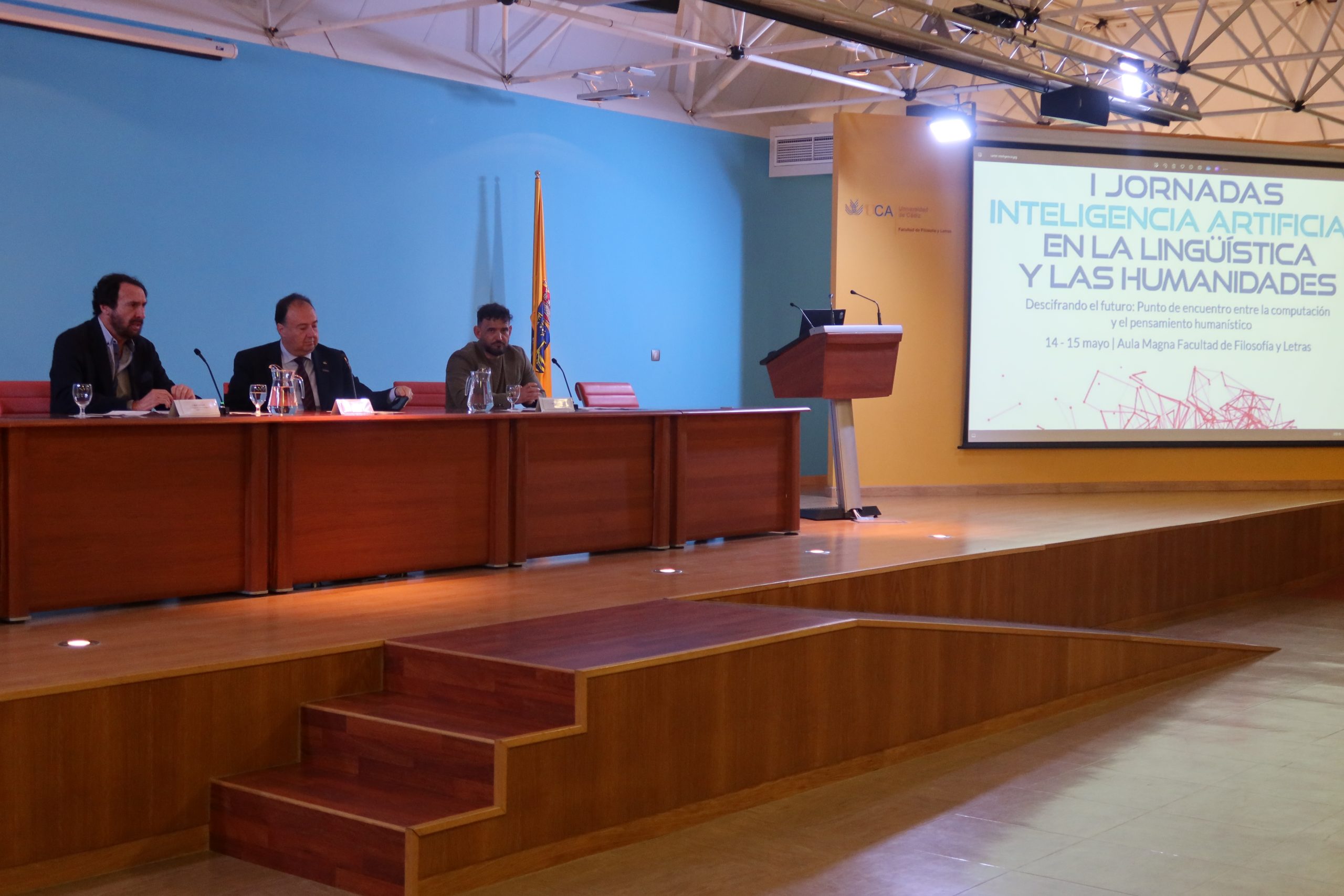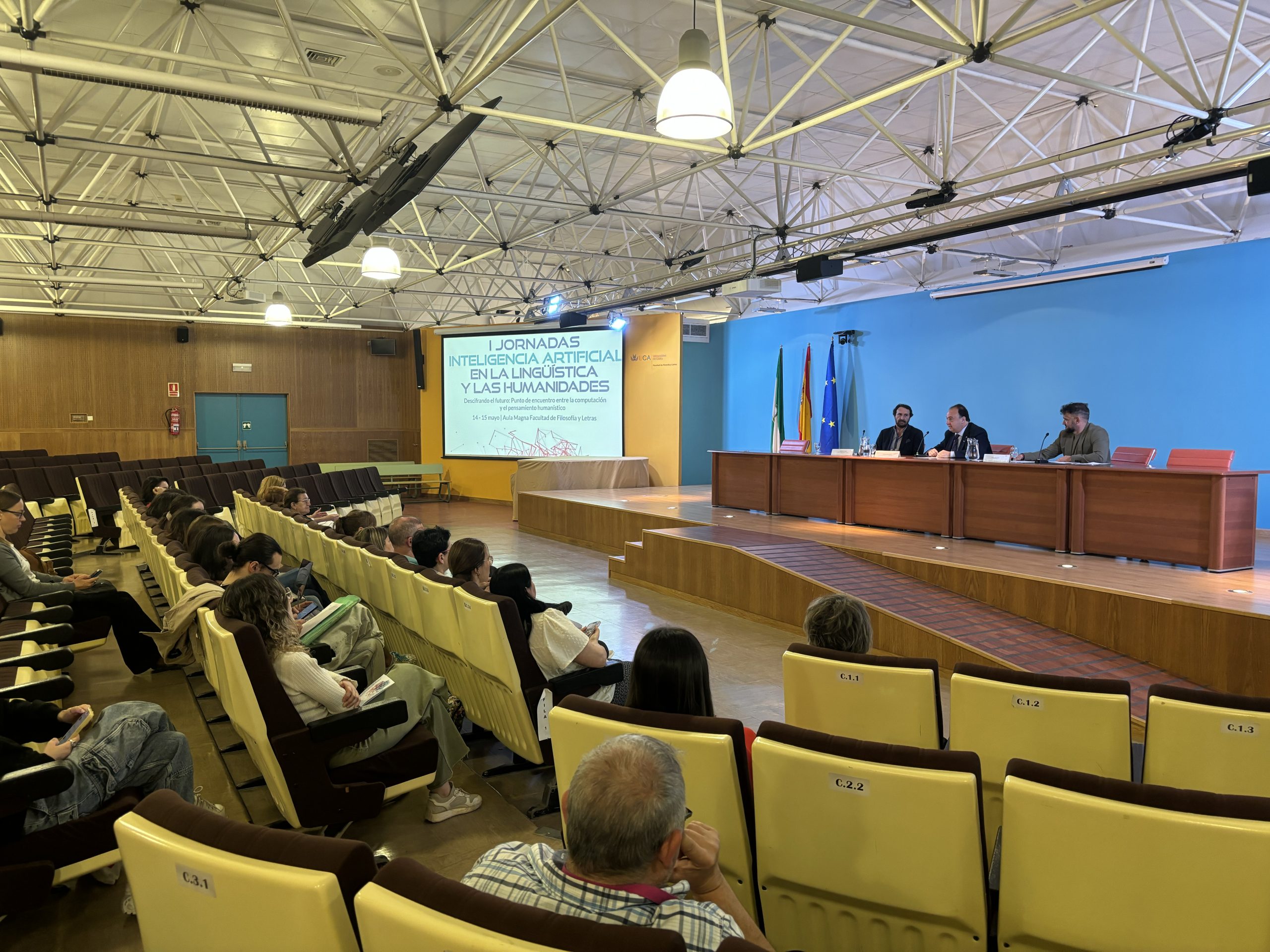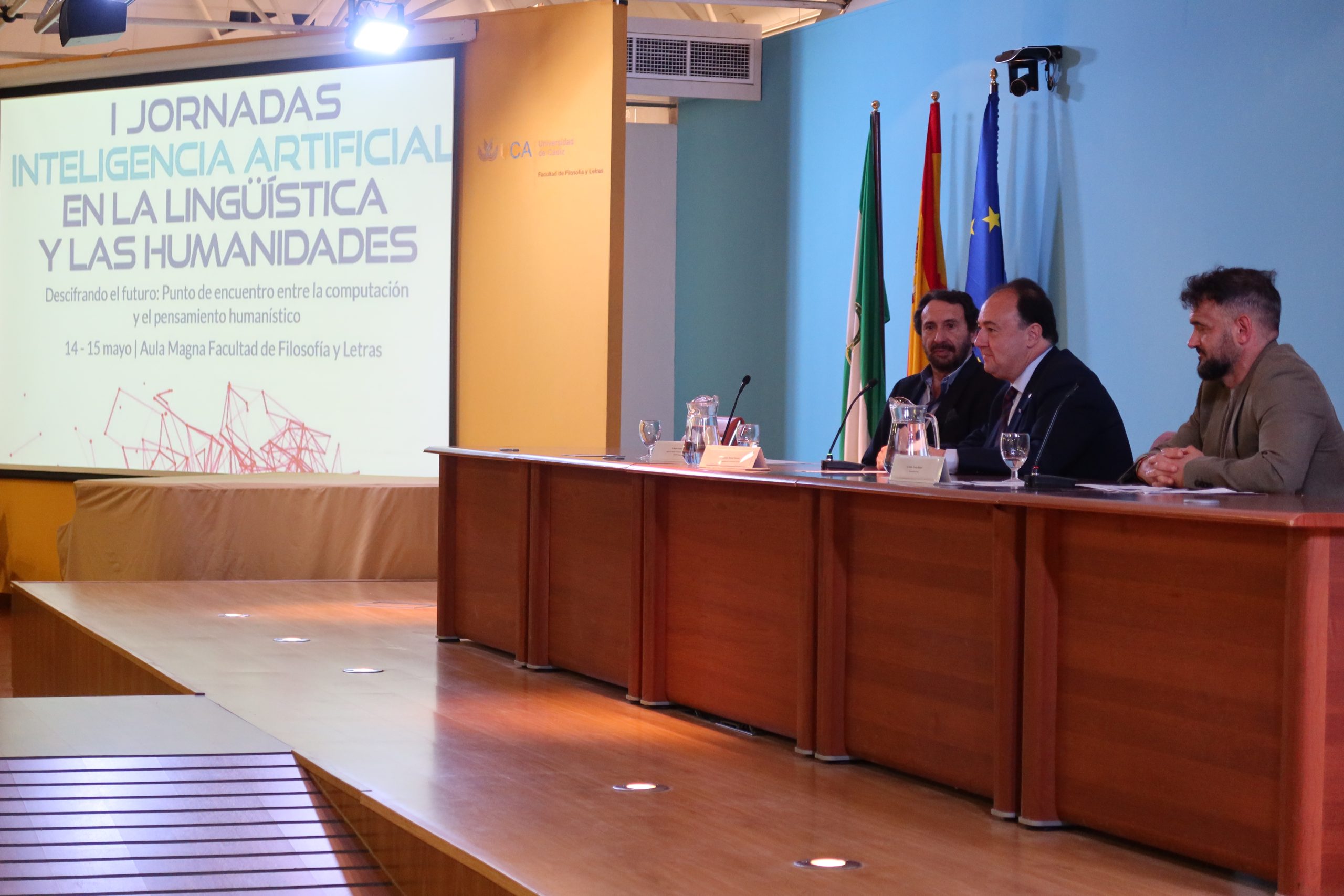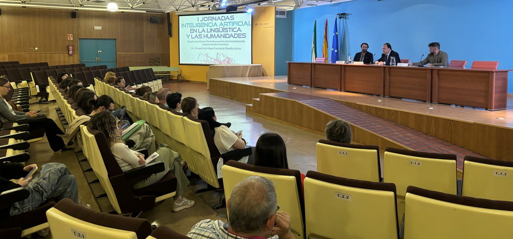 La Universidad de Cádiz celebra hoy y mañana, en la Facultad de Filosofía y Letras, las Jornadas sobre Inteligencia Artificial en la Lingüística y las Humanidades, bajo el título Descifrando el futuro: punto de encuentro entre la computación y el pensamiento humanístico. El rector de la UCA, Casimiro Mantell, el director del Instituto de Investigación en Lingüística Aplicada (ILA), Miguel Casas, y su coordinador, el profesor Mario Crespo del Laboratorio de Lingüística Computacional y Digital, han dado la bienvenida – en el aula Magna – a las 225 personas inscritas a este encuentro científico, que puede seguirse en formato presencial y en línea.