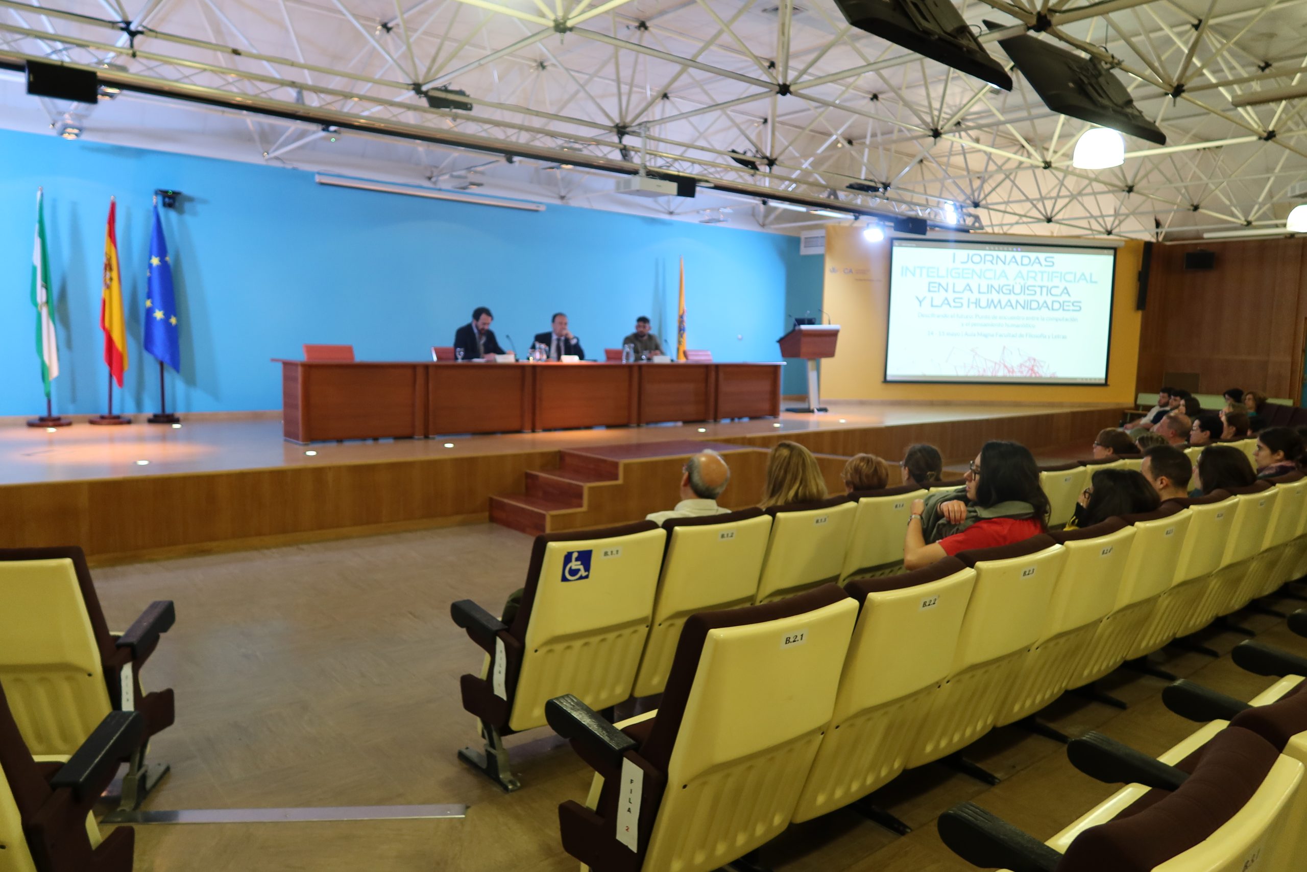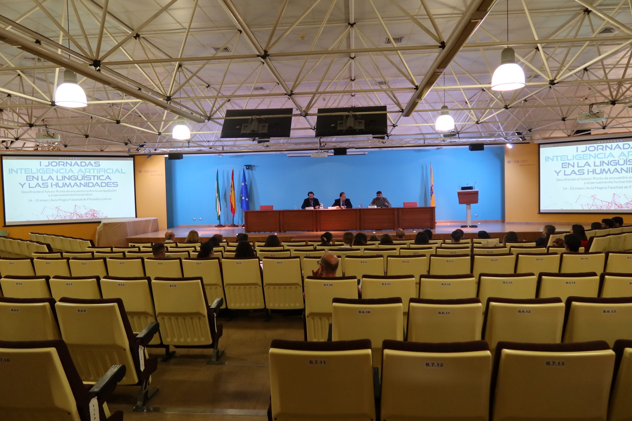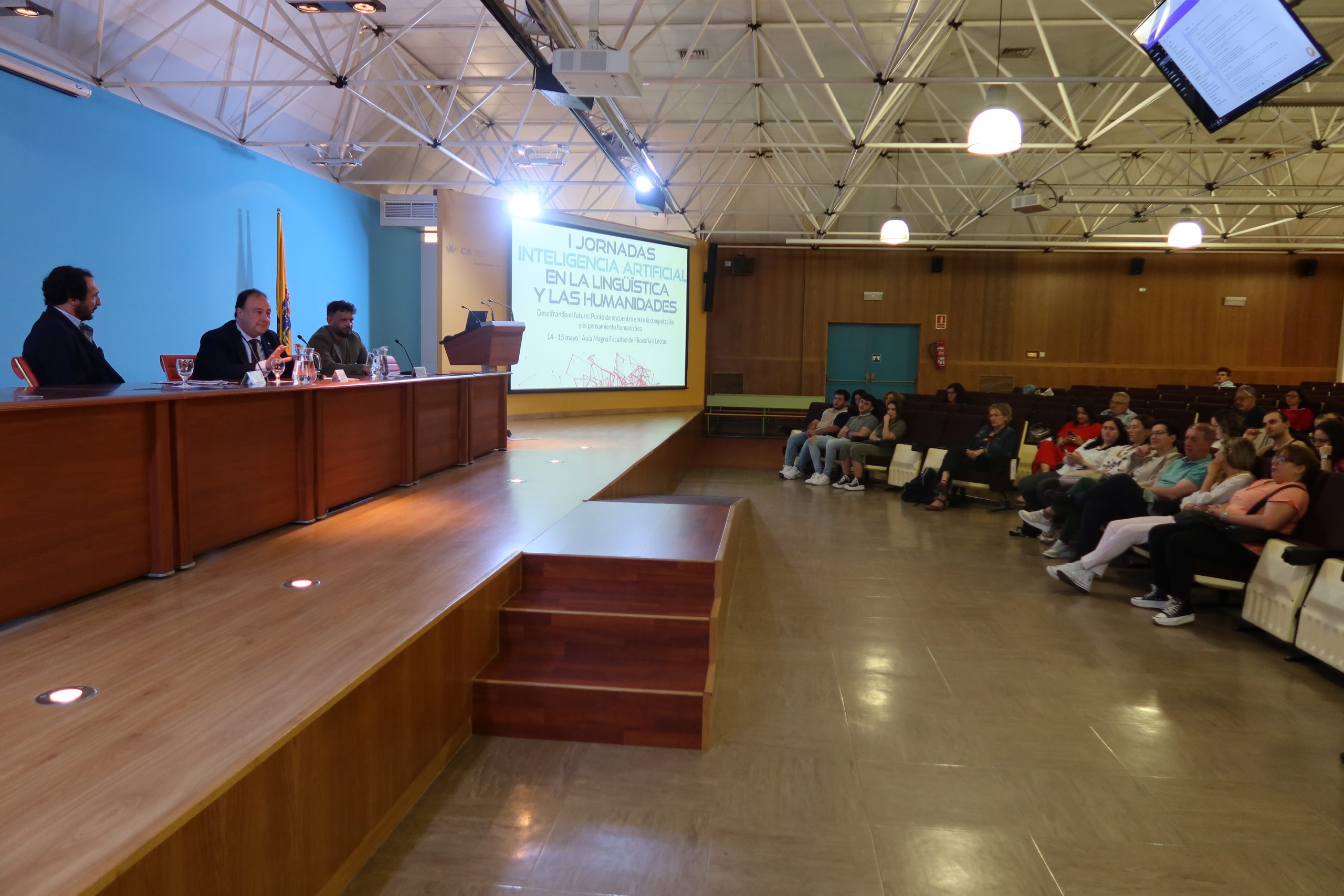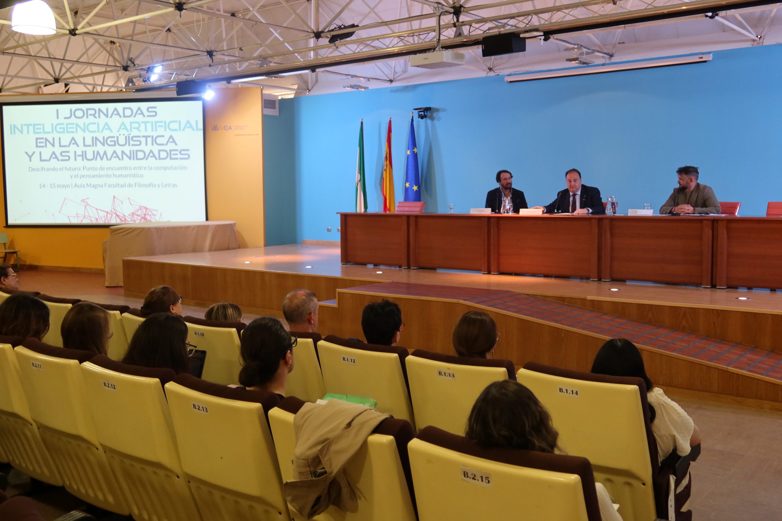 La Universidad de Cádiz celebra hoy y mañana, en la Facultad de Filosofía y Letras, las Jornadas sobre Inteligencia Artificial en la Lingüística y las Humanidades, bajo el título Descifrando el futuro: punto de encuentro entre la computación y el pensamiento humanístico. El rector de la UCA, Casimiro Mantell, el director del Instituto de Investigación en Lingüística Aplicada (ILA), Miguel Casas, y su coordinador, el profesor Mario Crespo del Laboratorio de Lingüística Computacional y Digital, han dado la bienvenida – en el aula Magna – a las 225 personas inscritas a este encuentro científico, que puede seguirse en formato presencial y en línea.