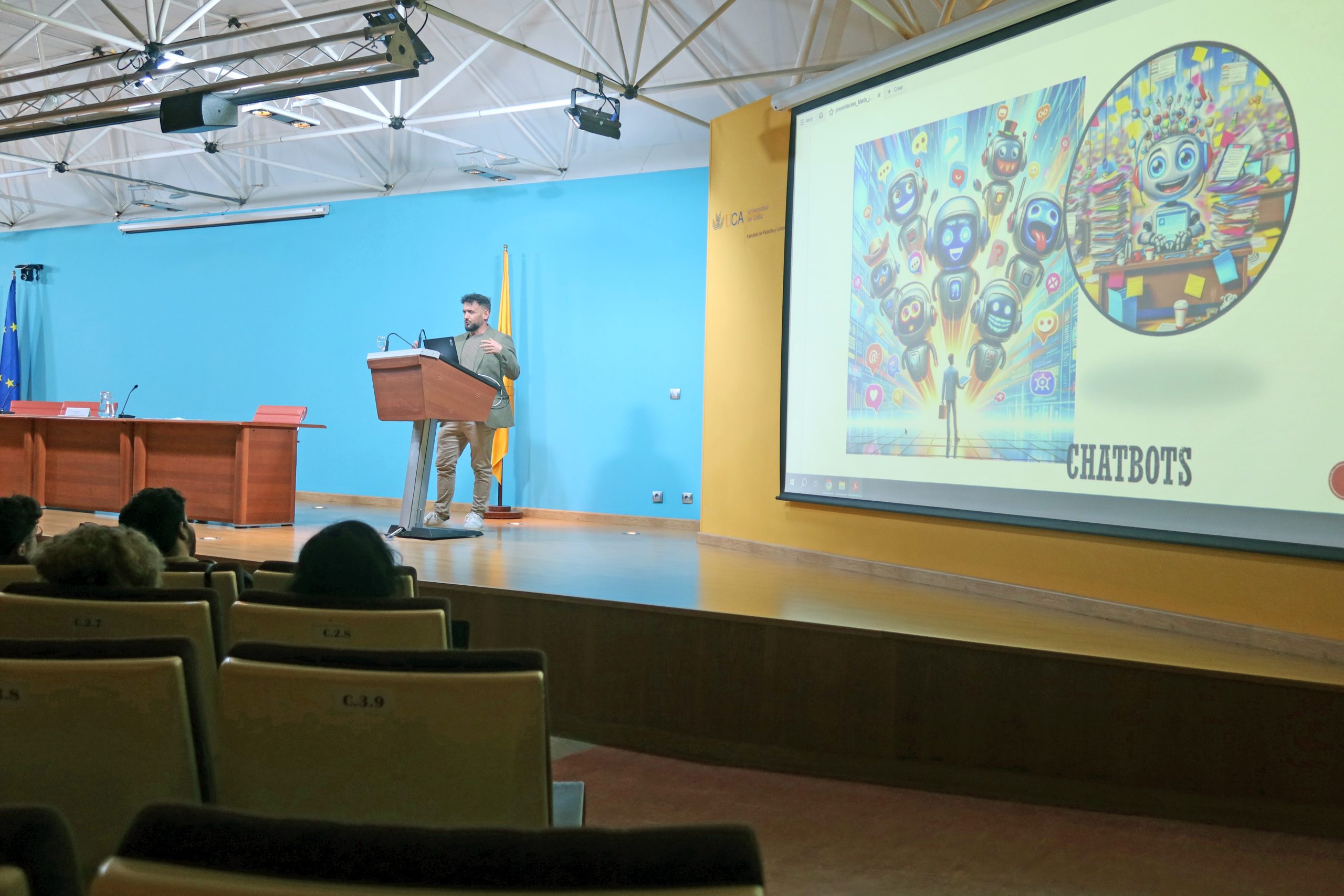 En cuanto al Chatbot Botseriu, creado por y para el alumnado de Lingüística de la UCA, el coordinador las Jornadas ha detallado que esta tecnología se basa en “categorías de conocimiento”, con un sistema “simple” de reconocimiento de patrón, de “pregunta y respuesta”, pero “la complejidad viene en crear tantas unidades de conocimiento como posibles interacciones haya, la dificultad es prever lo que te pueden preguntar y generar estos patrones”.