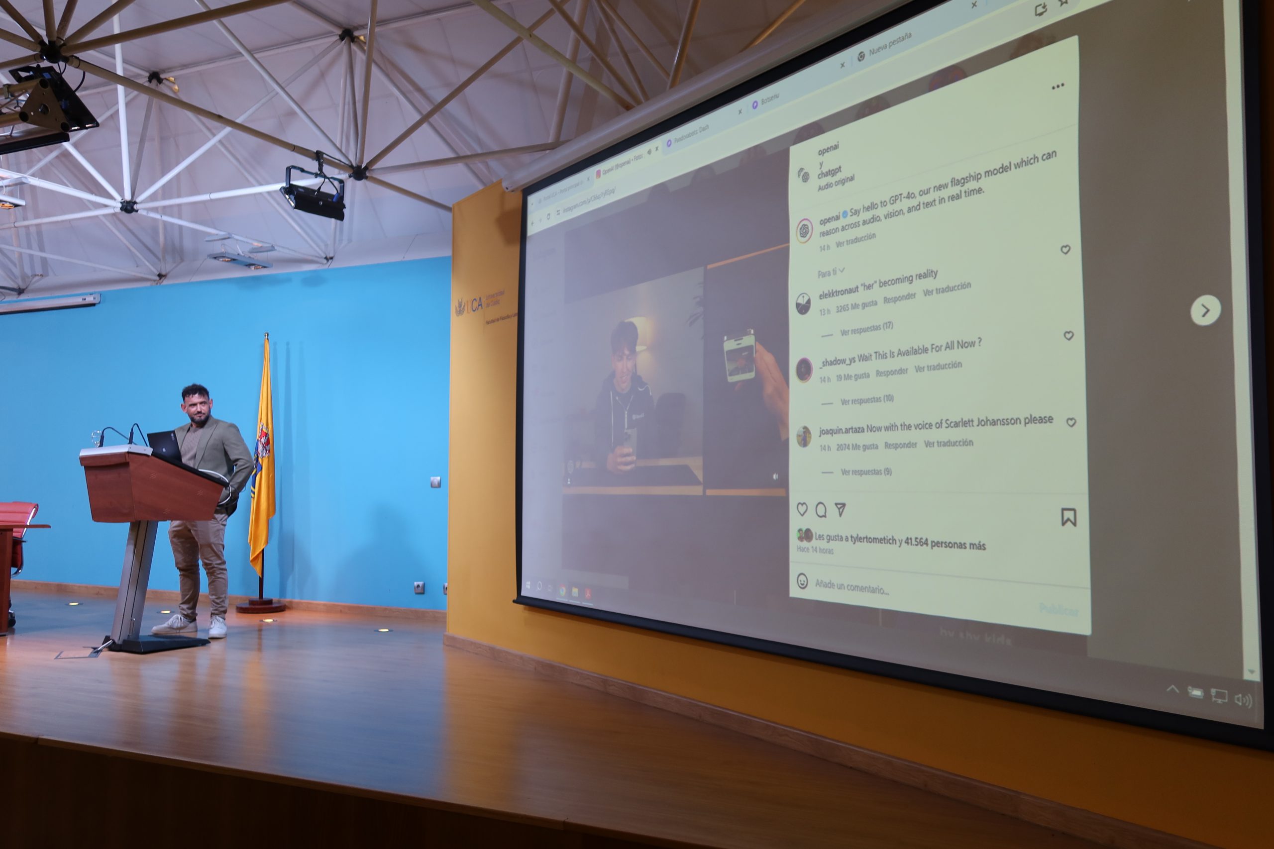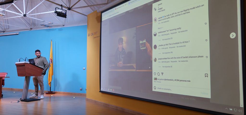 En la primera conferencia, el profesor Crespo ha explicado que lo que ha motivado este encuentro es la trascendencia que está adquiriendo la Inteligencia Artificial en todos los ámbitos. Como ejemplo, ha llevado una demostración de hoy de Open AI donde la modelo de su Chatgpt improvisa, es capaz de razonar sobre audio, visión y texto en tiempo real. La principal utilidad que los expertos estudian es “cómo actuar con eficacia y seguridad en una amplia variedad de situaciones, pero el quid de la cuestión es que cuando hablamos de IA ¿nos referimos a un sistema que tiene capacidades cognitivas humanas o que actúa como un ser humano? Es más bien este segundo sentido, cuando un sistema es capaz de tener capacidades como las que tienen los humanos es cuando estamos hablando de toda la revolución a la que estamos asistiendo”.