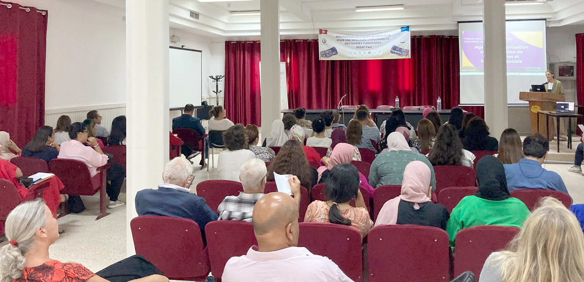 INSAF-Fem ha tenido por objetivo mejorar la empleabilidad de las mujeres tunecinas mediante la formación transversal en comunicación, tecnología, emprendimiento e innovación social, a la vez que contribuir al fortalecimiento del desarrollo local endógeno. Así, a partir de un programa de formación de 250 horas, 103 estudiantes de Máster y Doctorado de cuatro universidades tunecinas han obtenido el certificado de ‘Agentes de dinamización local, gestión de tecnologías e innovación social’, que tiene por finalidad contribuir al desarrollo local de (y con) sus comunidades, realizando tareas de formación y asesoramiento en talleres impartidos en 32 asociaciones locales. Una acción, en la que han participado 493 miembros de la sociedad civil. Más recientemente, las agentes han tenido la oportunidad de ofrecer 13 talleres en el marco de los centros ‘de Carrière et de Certification des Compétences (Centres 4C)’ de sus universidades formando a 260 estudiantes, lo que supone “una verdadera cascada de formación y transferencia”, como afirman sus responsables.