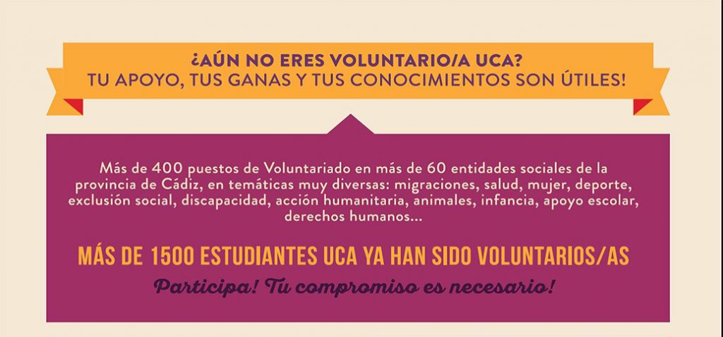 La Universidad de Cádiz convoca más de 450 puestos de voluntariado en más de 60 entidades sociales de la provincia de Cádiz dentro del 8º Plan de Voluntariado UCA para el curso 2018/19. Los primeros cursos de formación se realizarán en el mes de octubre, se pueden presentar solicitudes en 1ª convocatoria hasta el 5 de octubre, y en 2ª convocatoria (con las plazas que queden libres), hasta el 2 de noviembre.