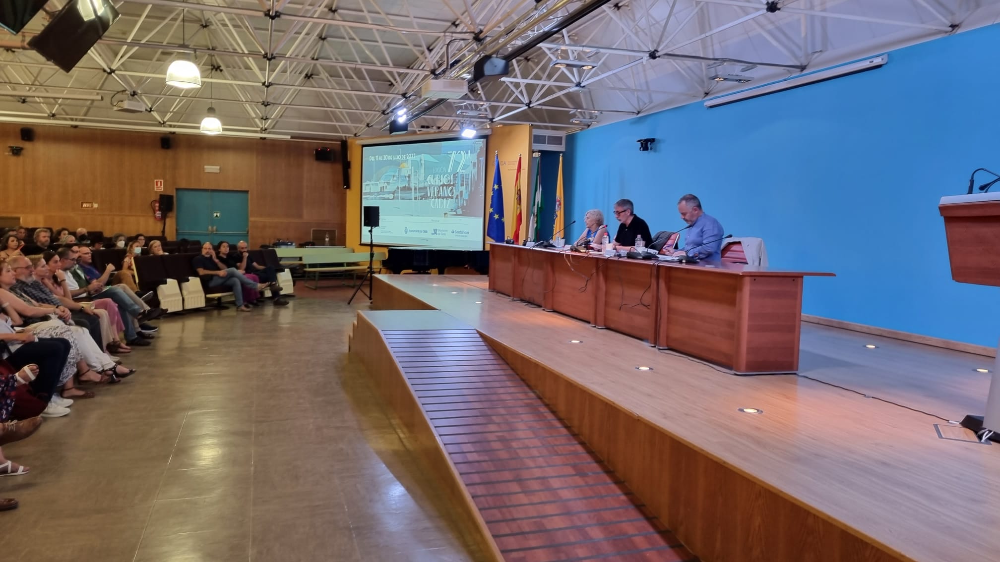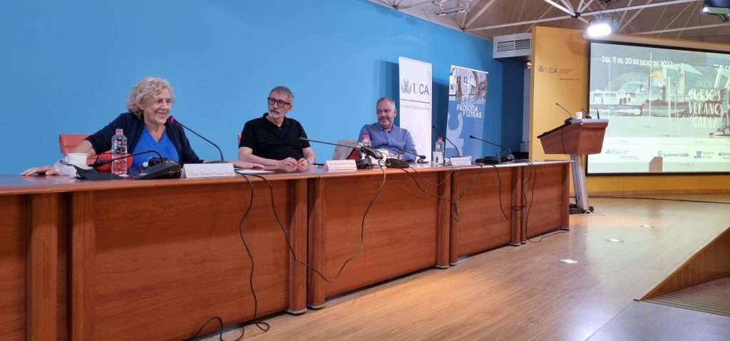 El rector de la Universidad de Cádiz, Francisco Piniella, junto al vicerrector de Cultura de la UCA, José María Pérez Monguió, ha acompañado a la abogada, jueza emérita y anterior alcaldesa de Madrid, Manuela Carmena, como conferenciante inaugural de la 72º edición de los Cursos de Verano de la UCA en Cádiz. El aula Magna de la Facultad de Filosofía y Letras del Campus de Cádiz ha llenado su aforo para escuchar su disertación titulada El placer del saber. Antes de comenzar, se ha guardado un minuto de silencio por el fallecimiento de José Guirao, anteriormente ministro de Cultura de España.