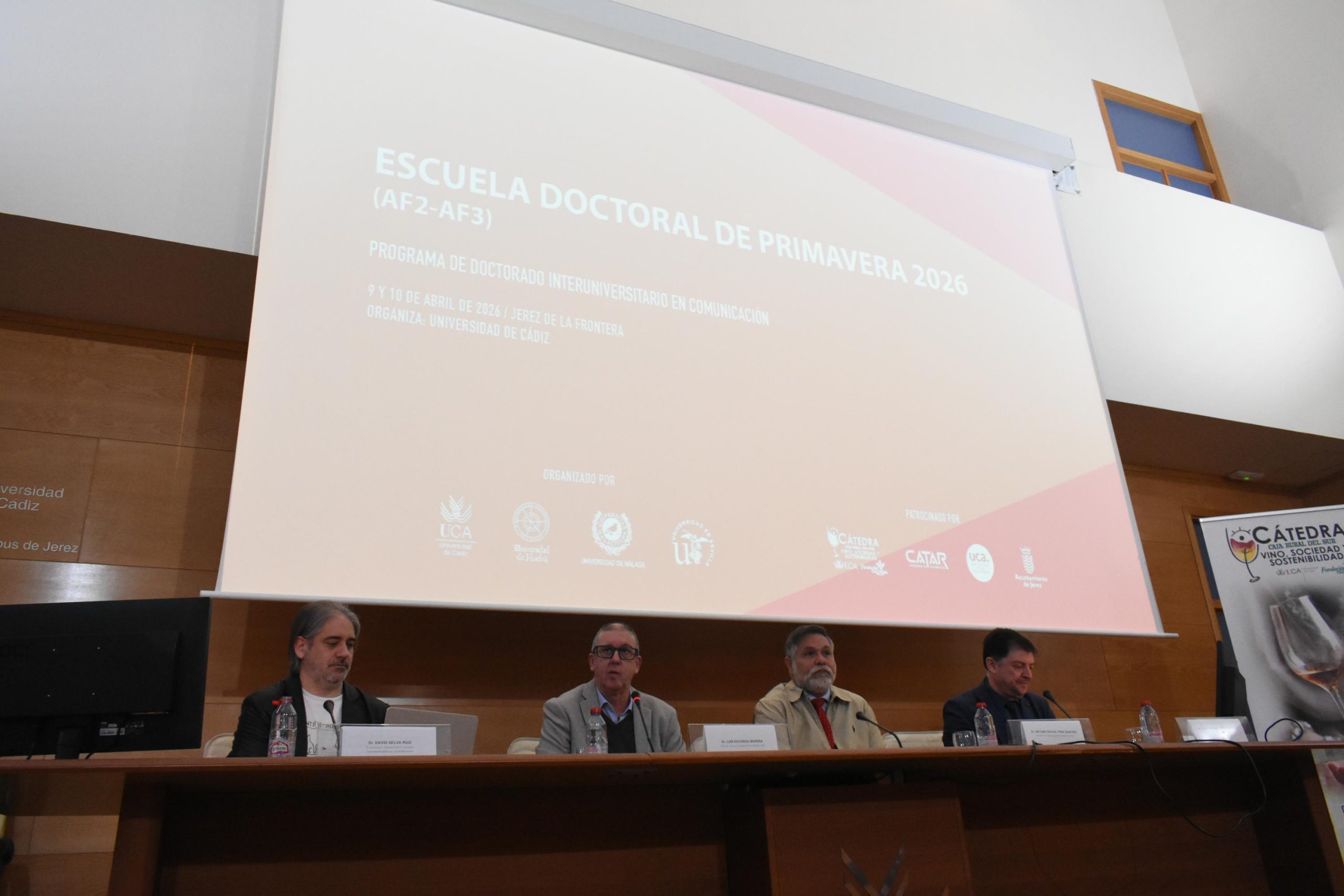 En el acto de bienvenida han intervenido el delegado del Rector para el Campus de Jerez, Antonio Rafael Peña, el director de las Escuelas de Doctorado de la Universidad de Cádiz, Luis Escoriza, el decano de la Facultad de Ciencias Sociales y de la Comunicación, José Antonio López, y el coordinador general del Programa de Doctorado Interuniversitario en Comunicación, David Selva.