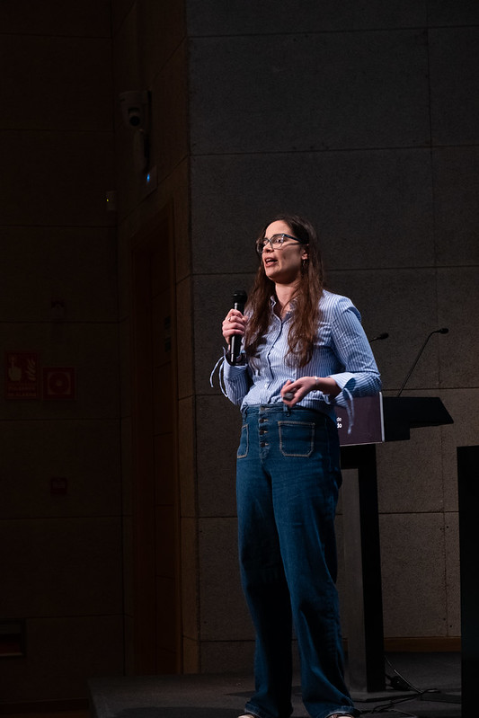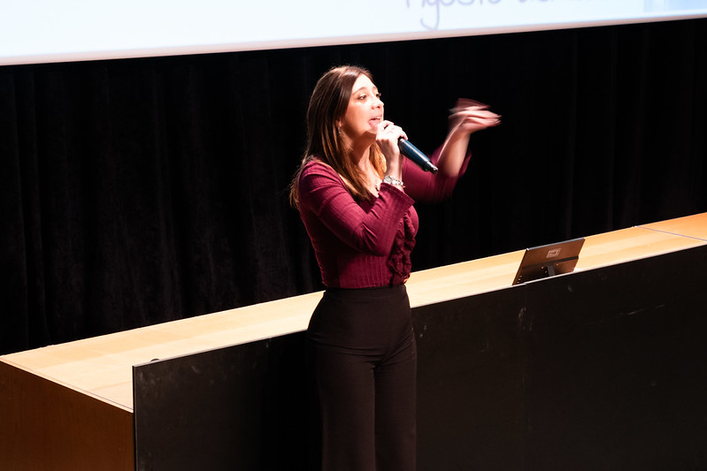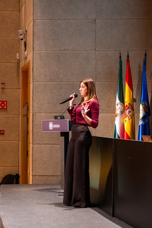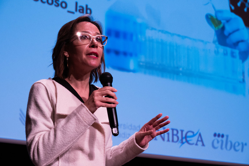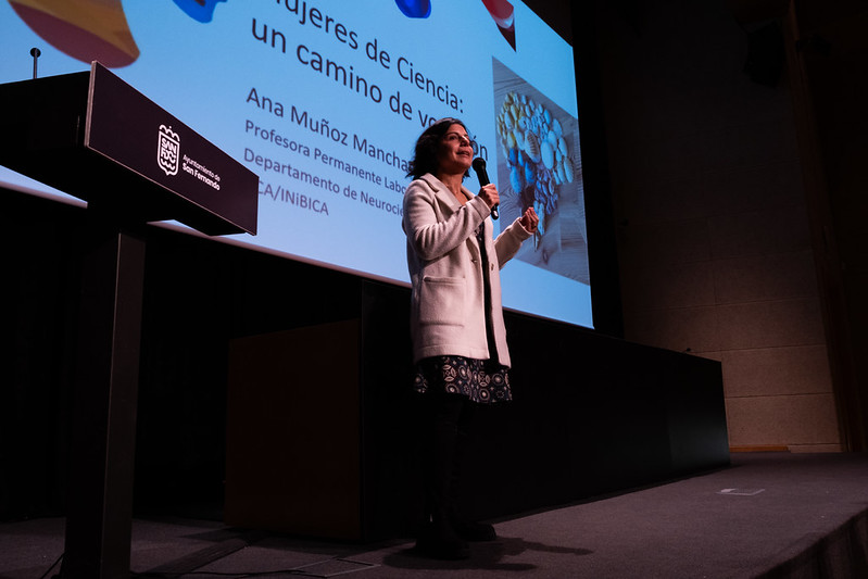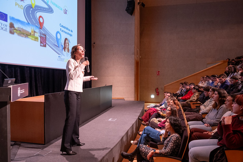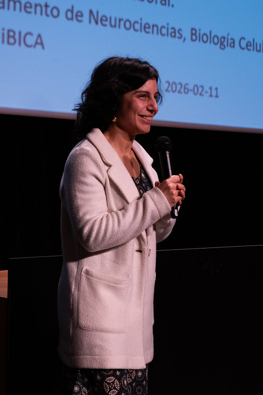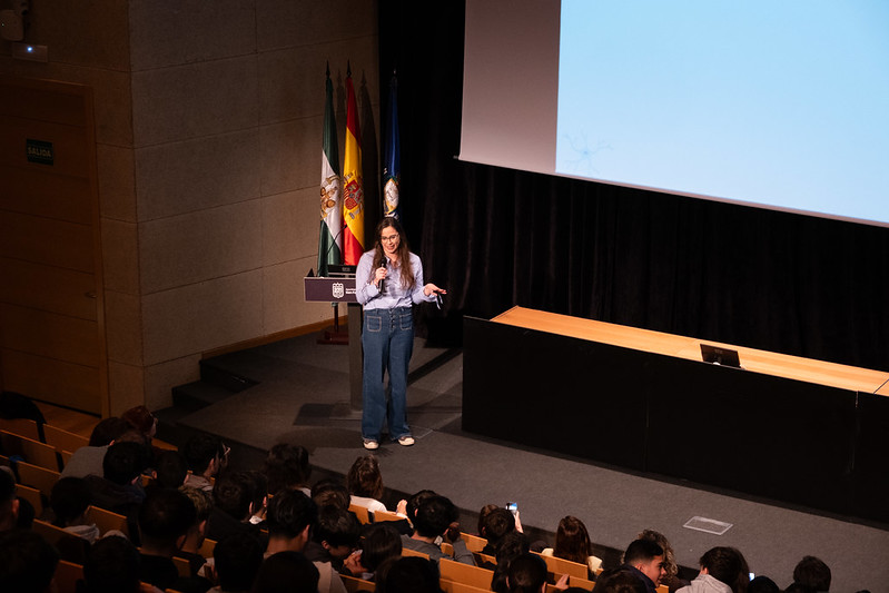 Durante el acto, las ponentes ofrecieron una mirada divulgativa y accesible a temas punteros de investigación biomédica y neurocientífica, conectando ciencia y vida cotidiana. La catedrática Esther Berrocoso, directora del Departamento de Neurociencias de la UCA, abordó cómo el dolor crónico modifica el cerebro y su relación con trastornos de salud mental. Por su parte, la investigadora postdoctoral María del Carmen Camarena invitó al público a mirar “más allá de las neuronas” para descubrir el papel de la glía (y, en particular, de los astrocitos) en los trastornos mentales y en la ansiedad asociada al dolor crónico, compartiendo además su experiencia personal y el salto que supone pasar de estudiante a diseñar y liderar experimentos propios tras una etapa investigadora en el extranjero.