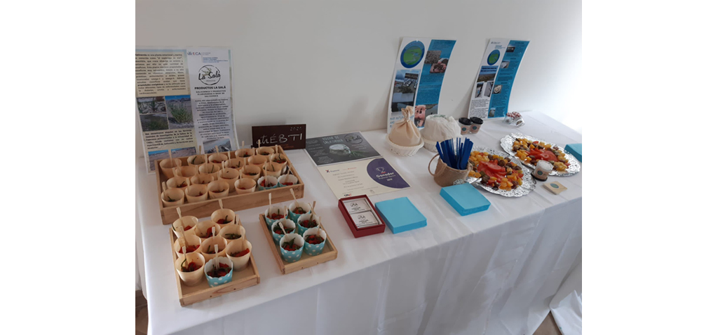 La jornada ha incluido un espacio expositivo con representación de las empresas locales Productos La Salá, Estero Natural, Suralgas, Mar Natural y Ostras de Cádiz. Todas ellas son pequeñas y medianas empresas creadas en torno a las salinas artesanales.