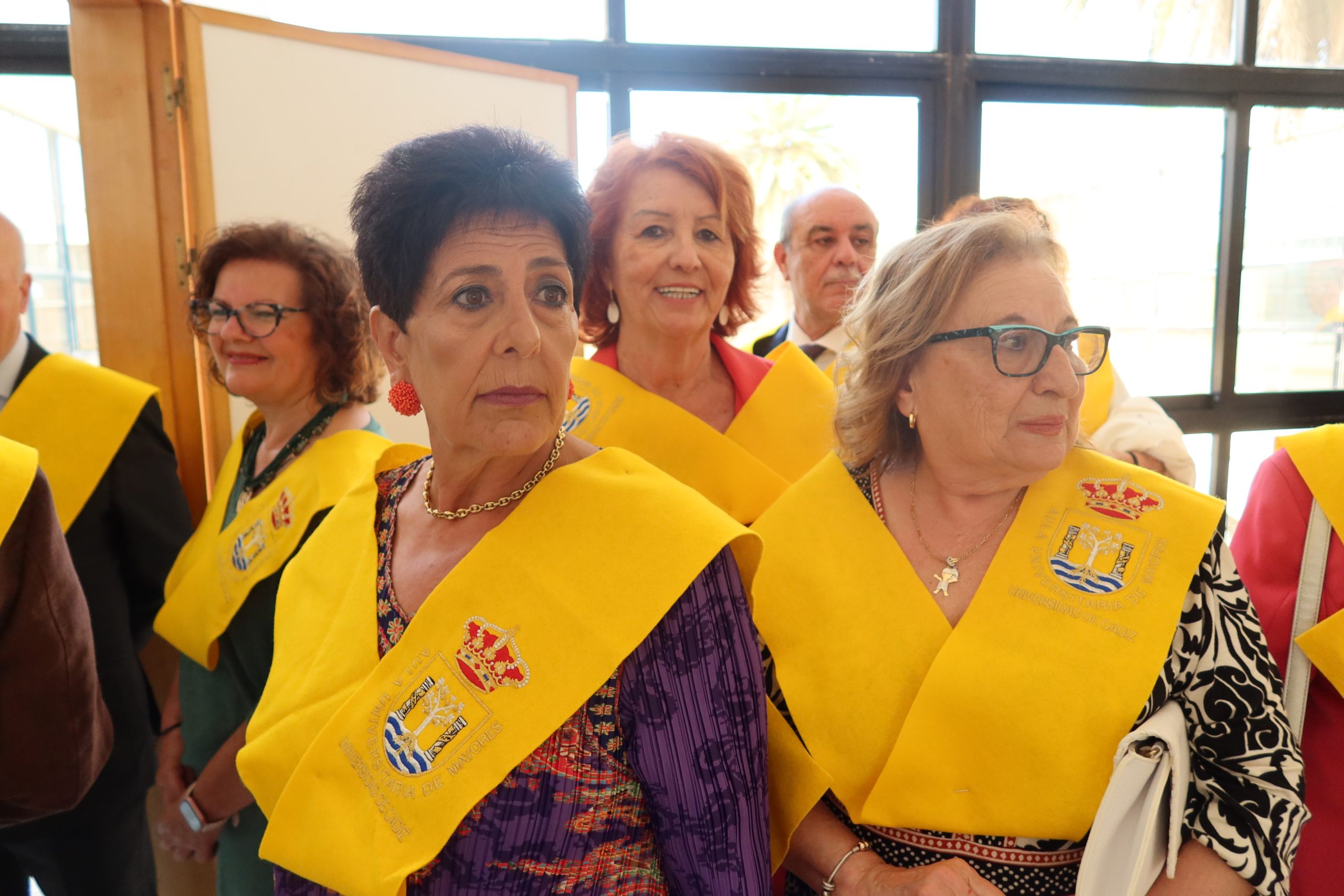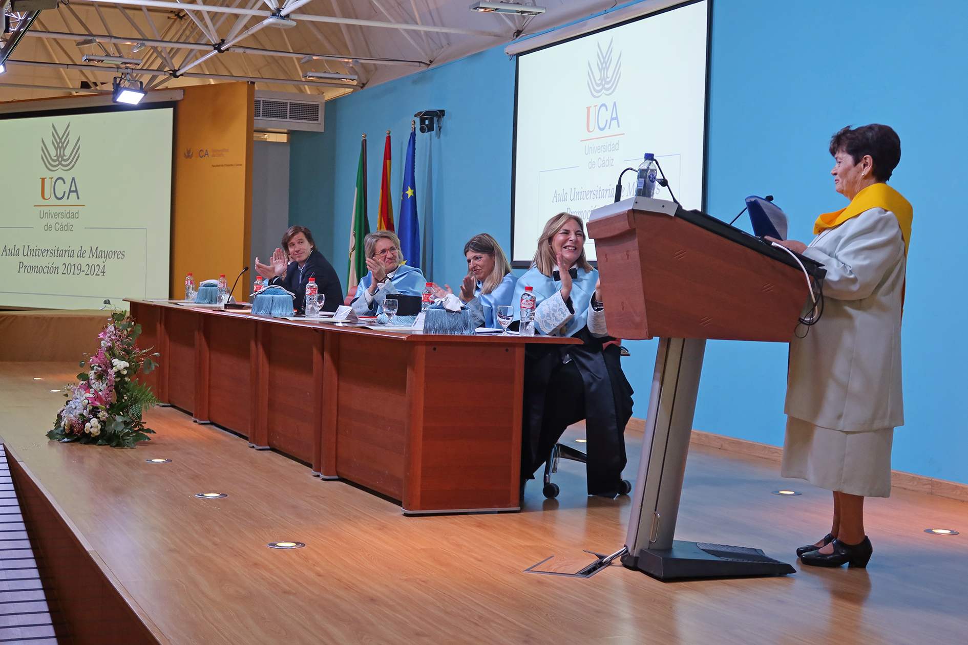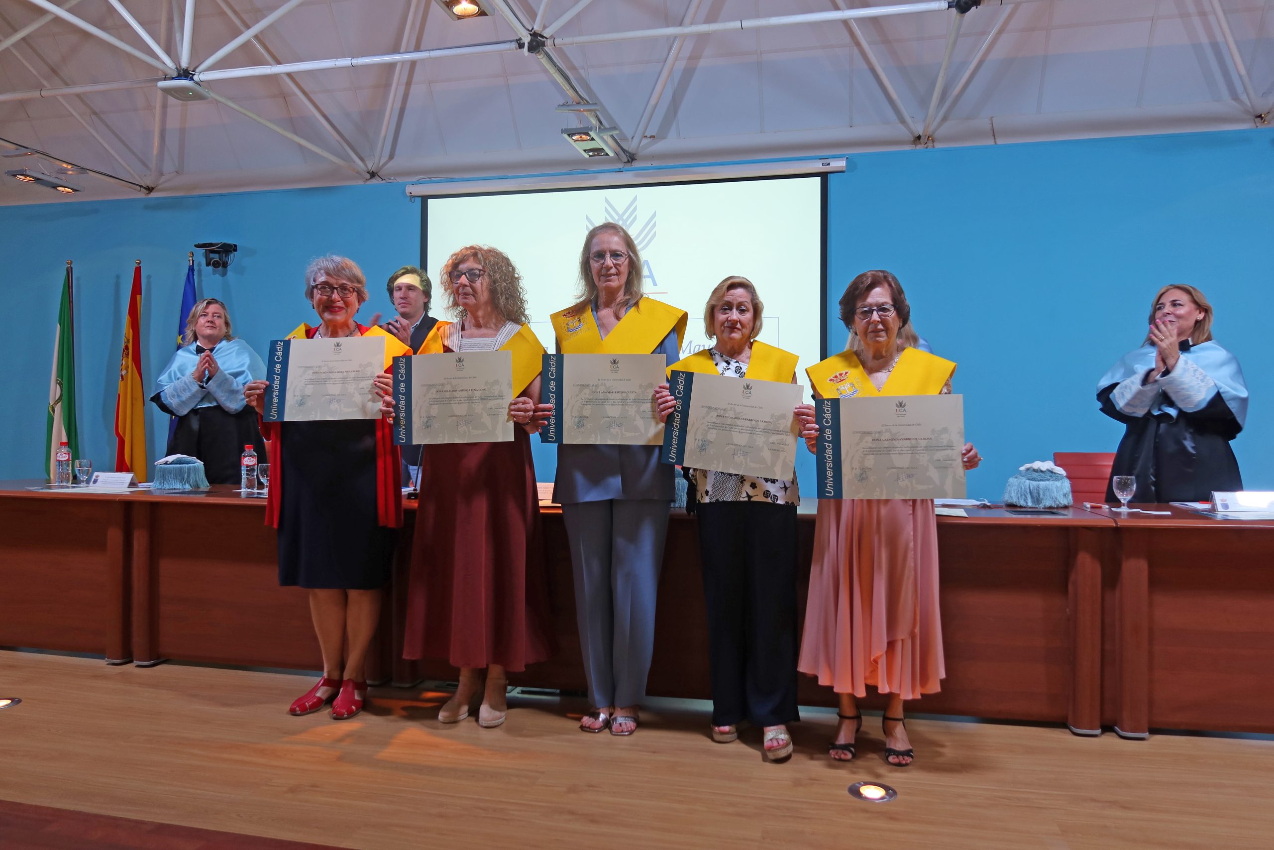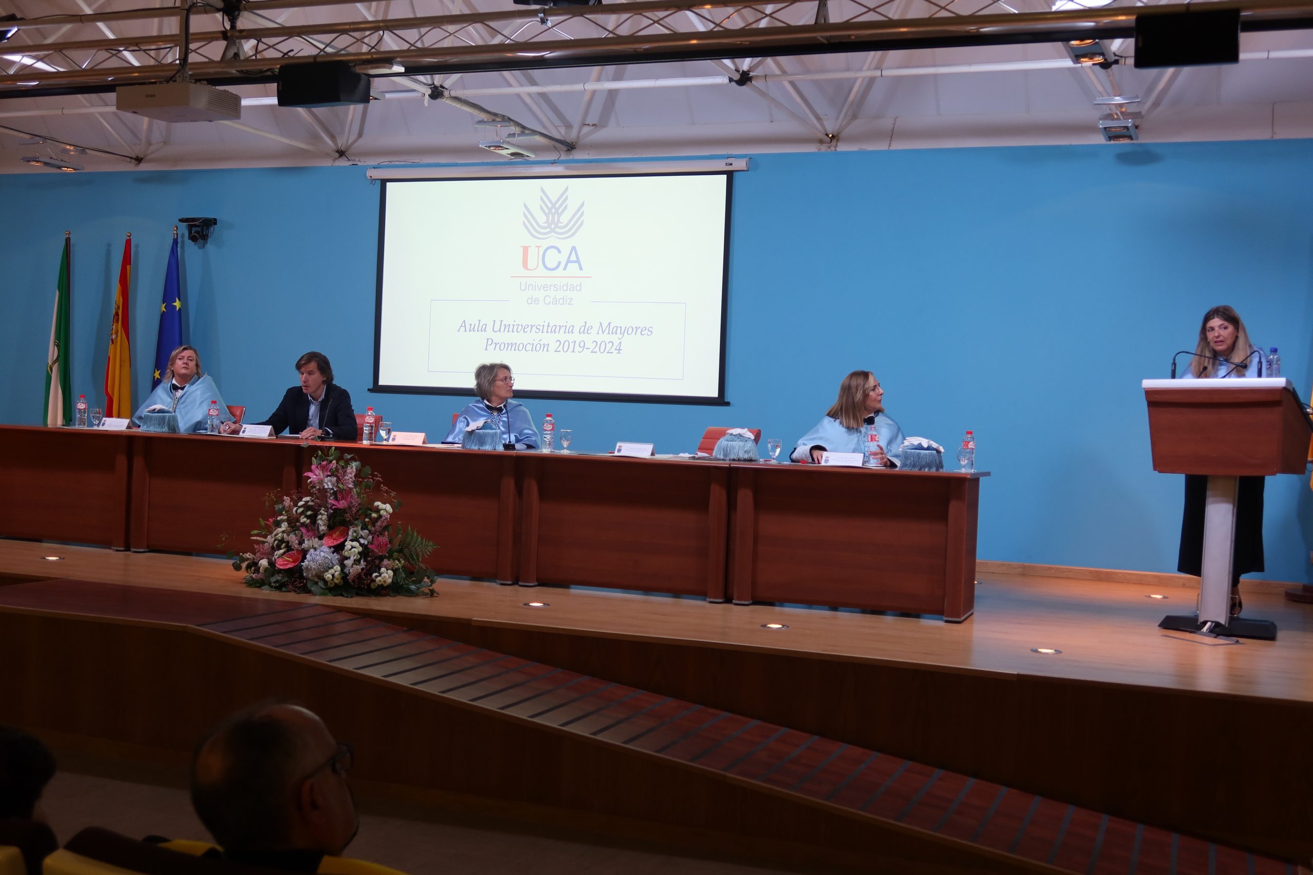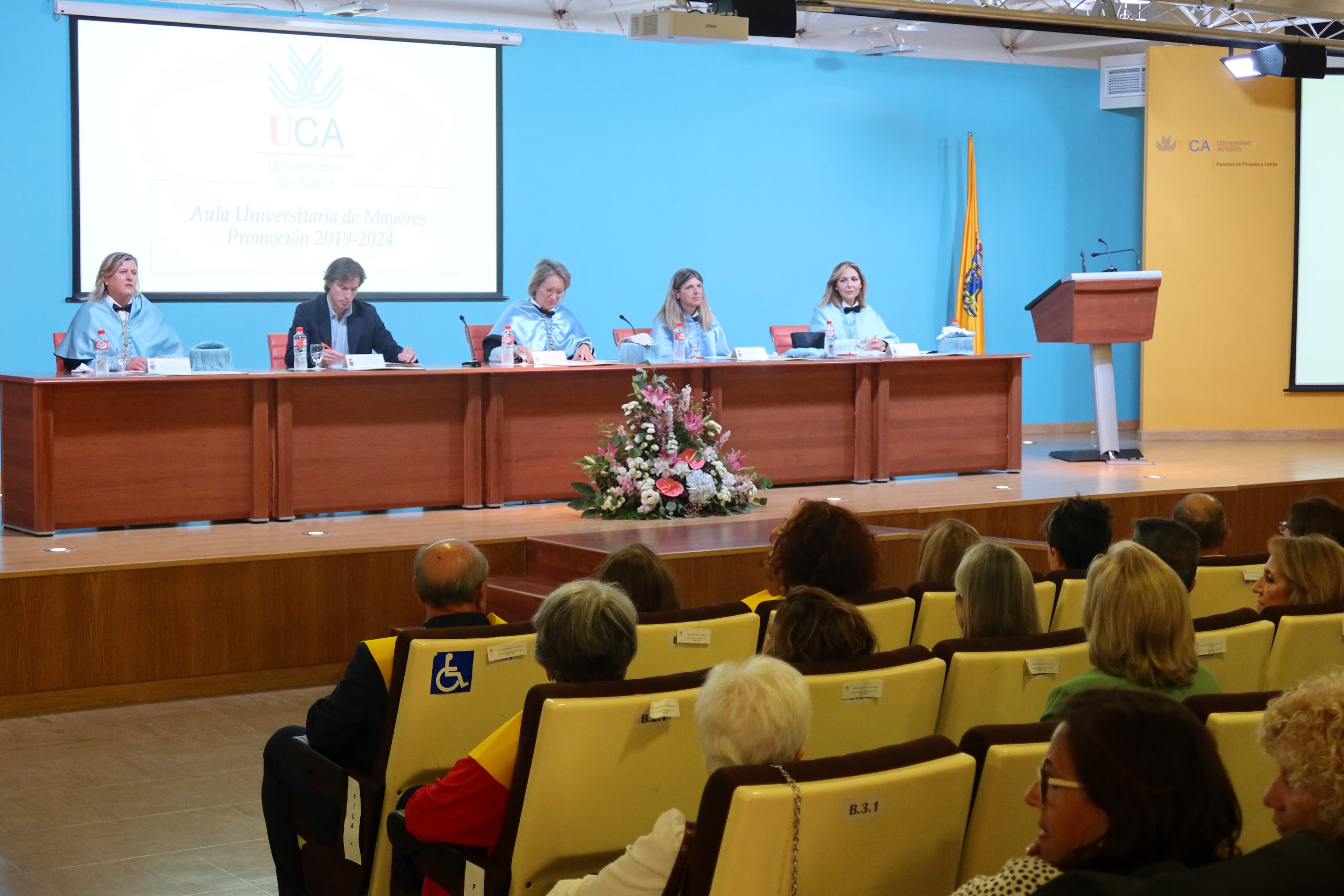 Medio centenar de personas se han graduado hoy en la Facultad de Filosofía y Letras. La vicerrectora de Estudiantes de la Universidad de Cádiz, Nuria Campos, en compañía del concejal de Presidencia y Relaciones Institucionales, delegado de Asuntos Sociales y Familia del Ayuntamiento de Cádiz, Pablo Otero, la directora del Aula Universitaria de Mayores y la subdirectora de la sede de Cádiz, M.ª Jesús Paredes y Ana María Niveau de Villedary, respectivamente, y la profesora Lucía Cancelas, ha presidido hoy, en el aula Magna, la ceremonia de graduación de 5º del Aula Universitaria de Mayores en Cádiz de la promoción 2019/2024.