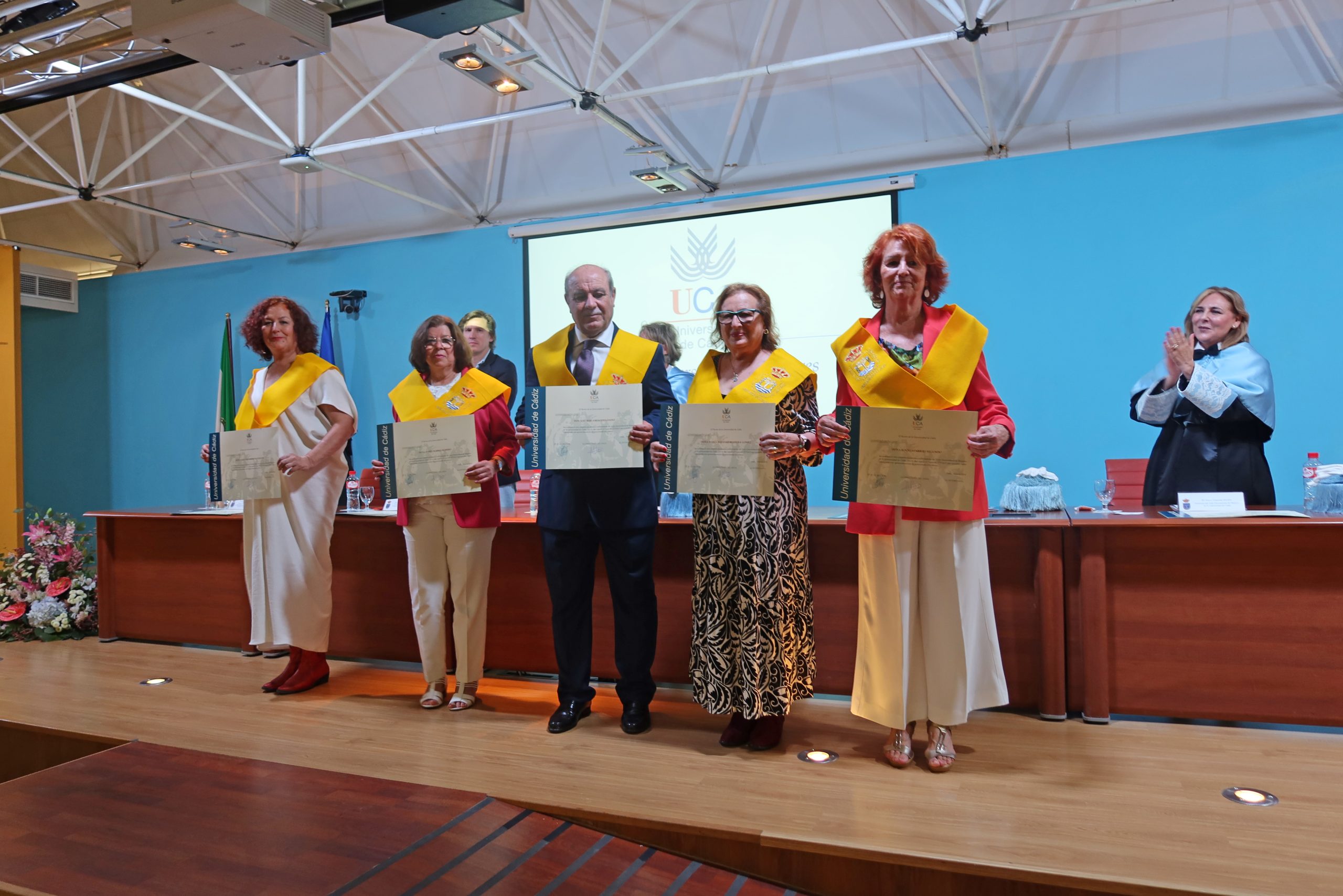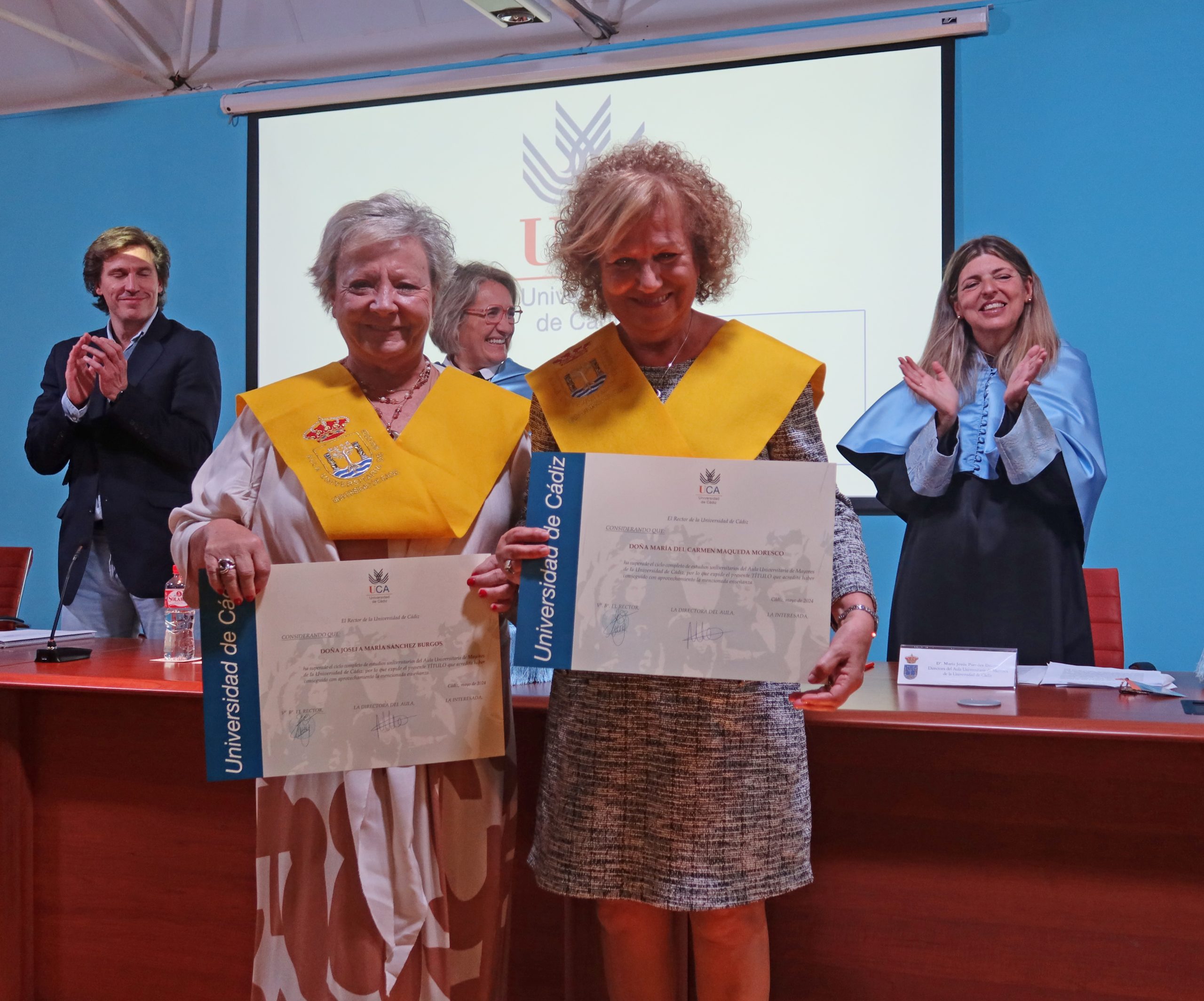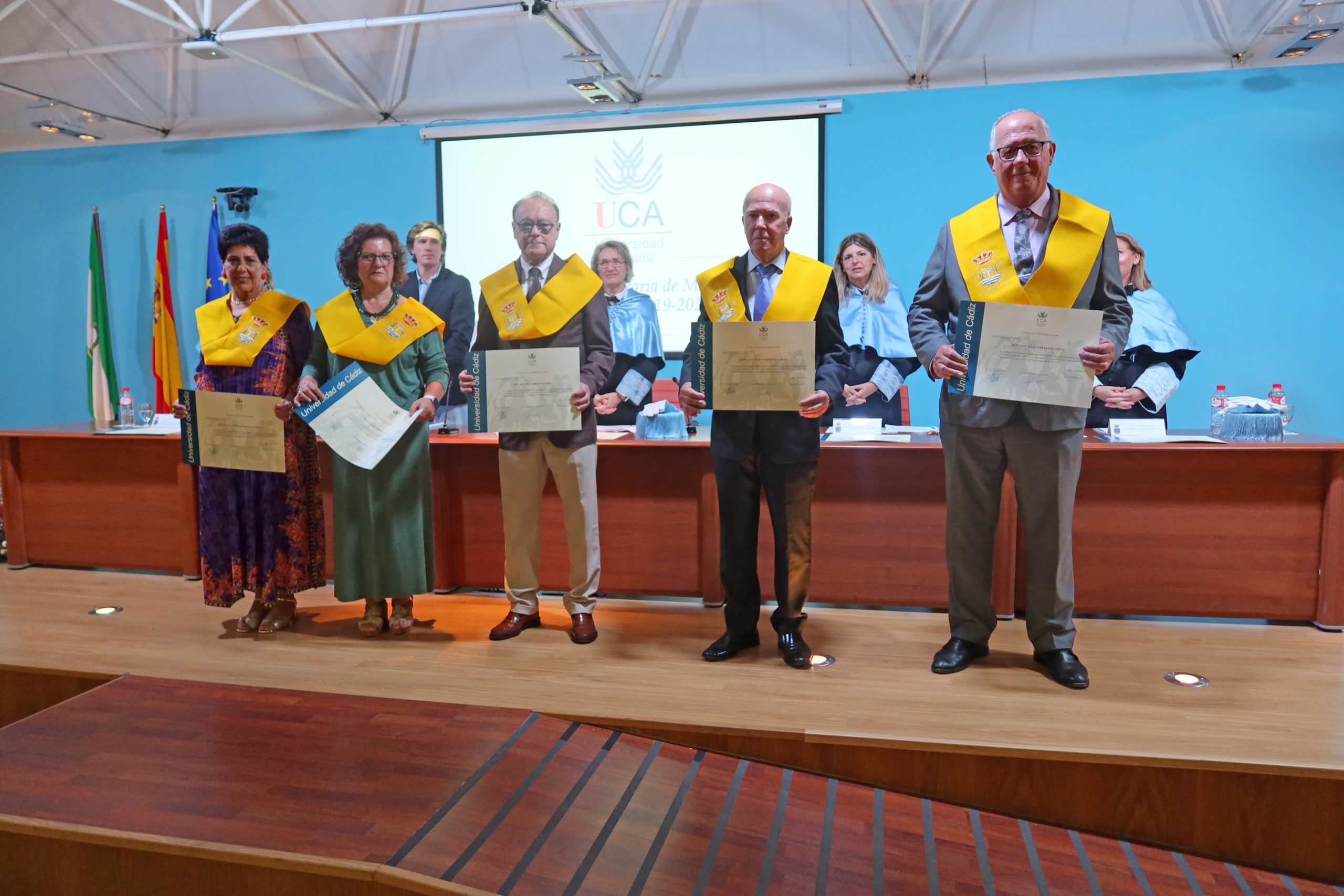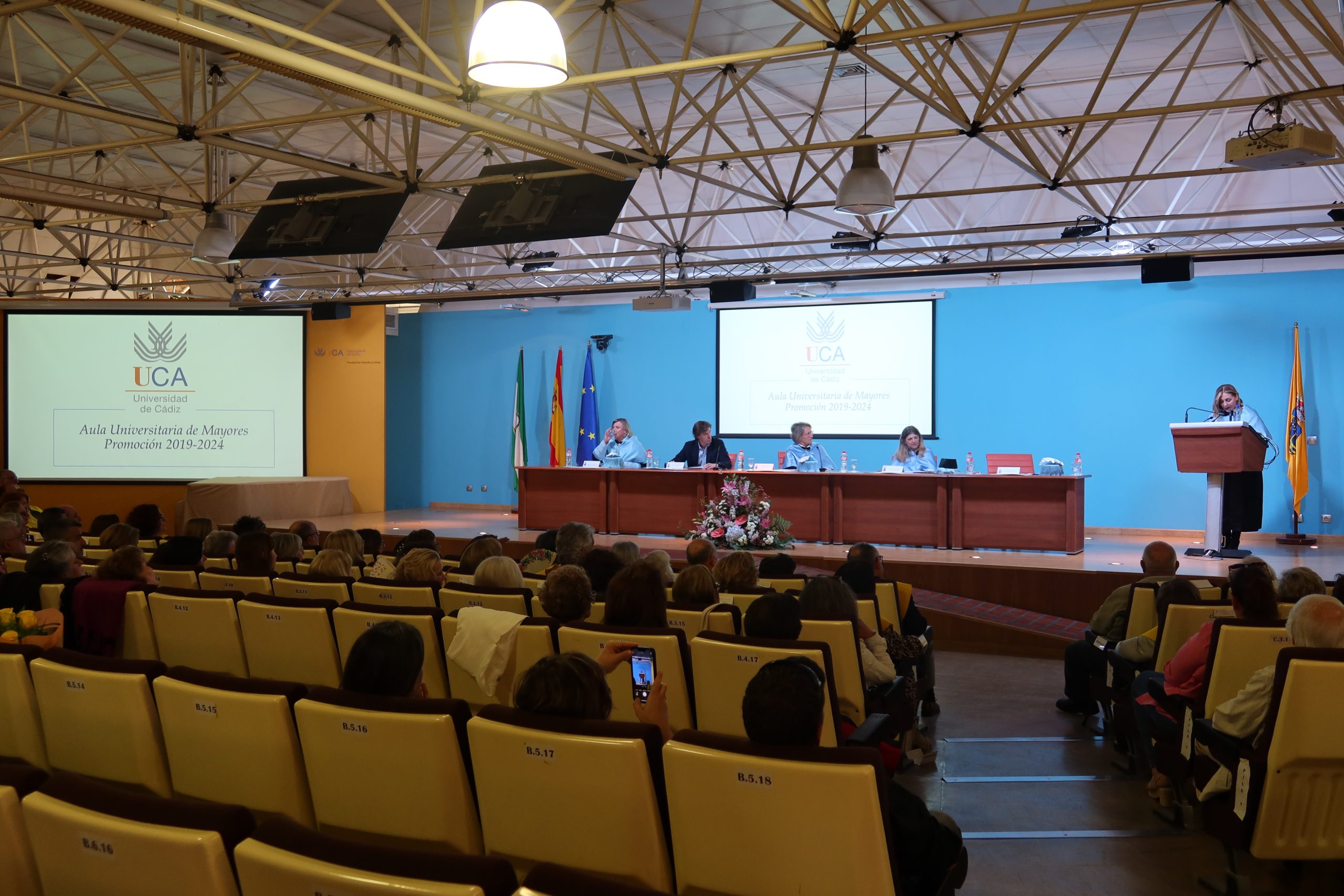 Medio centenar de personas se han graduado hoy en la Facultad de Filosofía y Letras. La vicerrectora de Estudiantes de la Universidad de Cádiz, Nuria Campos, en compañía del concejal de Presidencia y Relaciones Institucionales, delegado de Asuntos Sociales y Familia del Ayuntamiento de Cádiz, Pablo Otero, la directora del Aula Universitaria de Mayores y la subdirectora de la sede de Cádiz, M.ª Jesús Paredes y Ana María Niveau de Villedary, respectivamente, y la profesora Lucía Cancelas, ha presidido hoy, en el aula Magna, la ceremonia de graduación de 5º del Aula Universitaria de Mayores en Cádiz de la promoción 2019/2024.