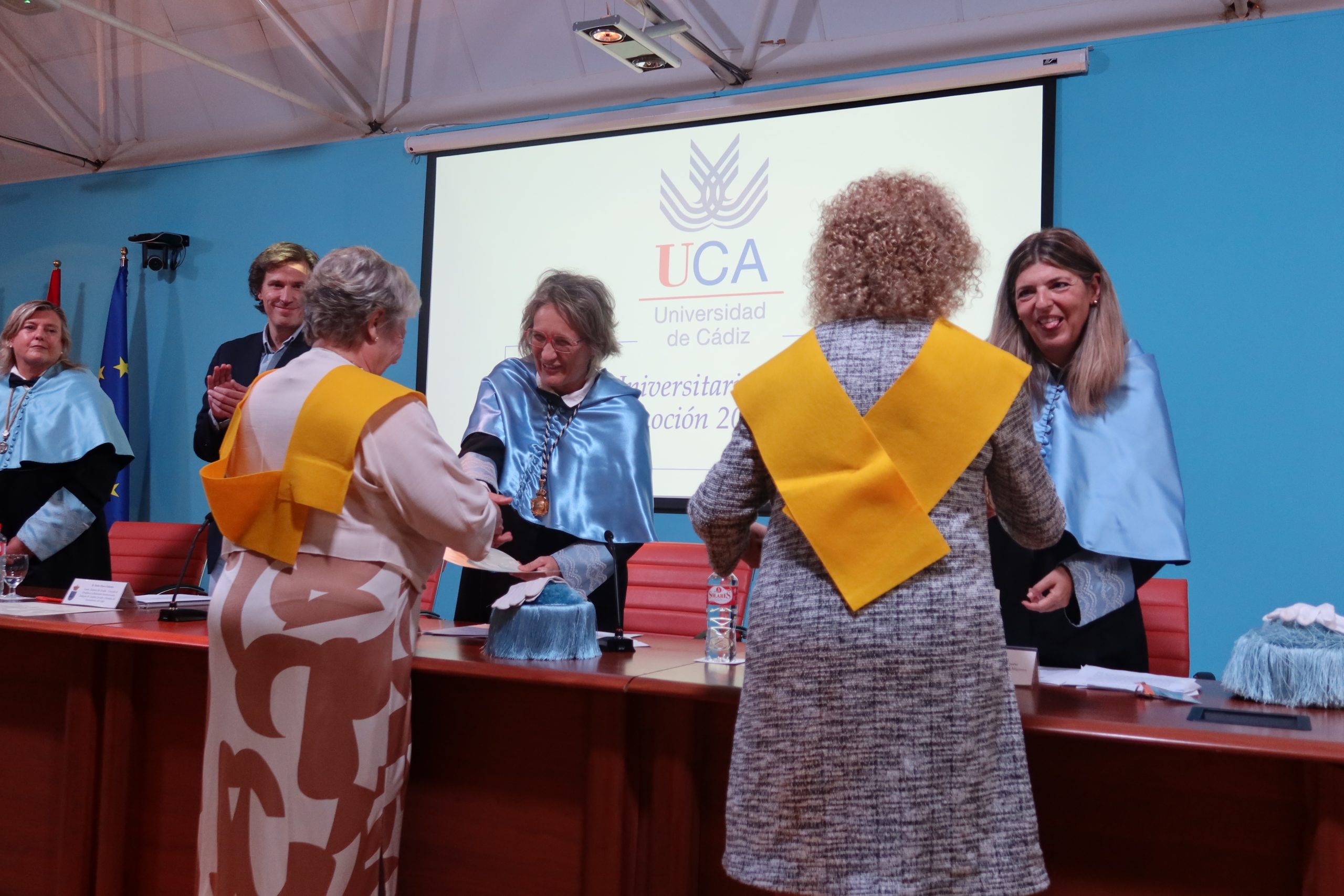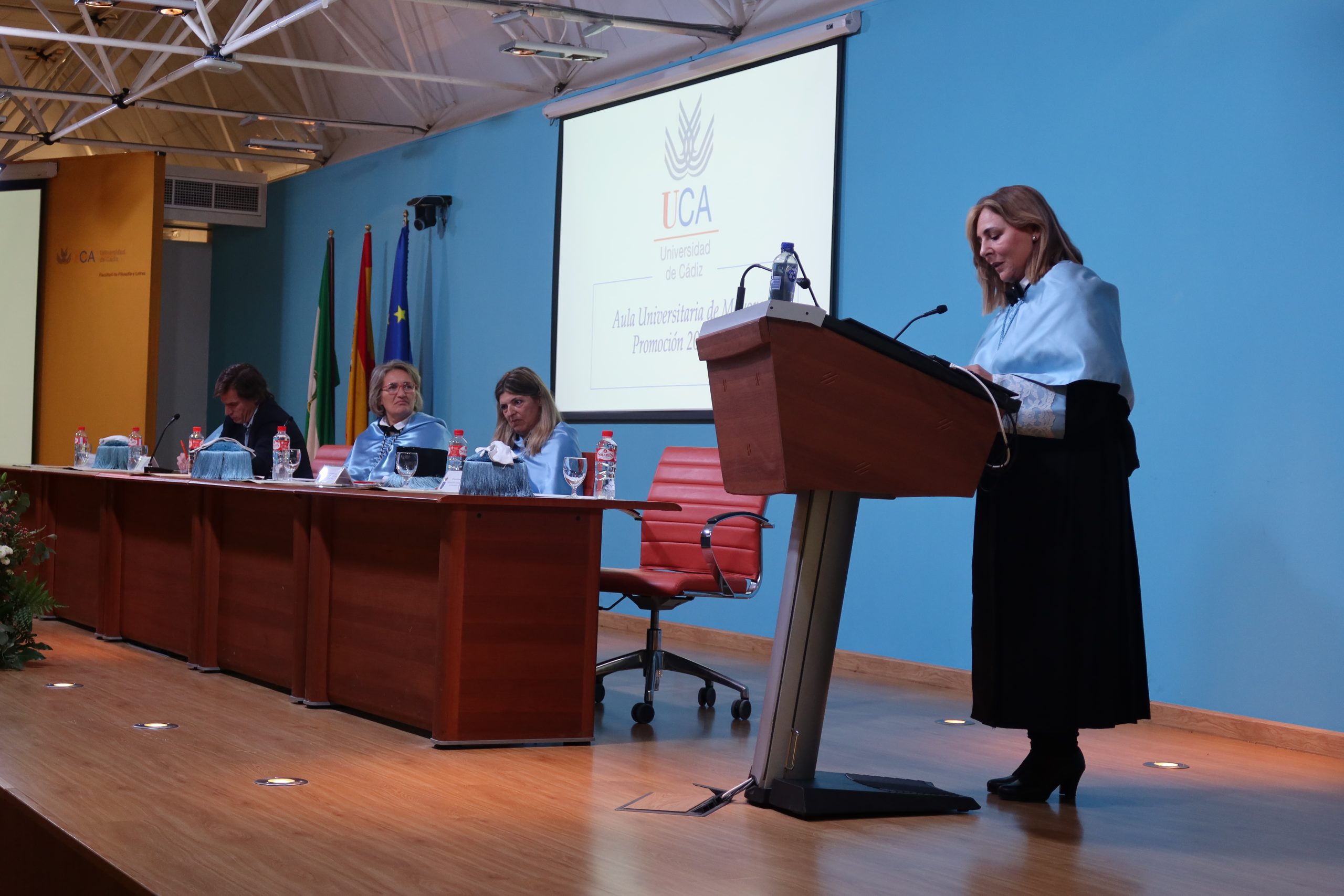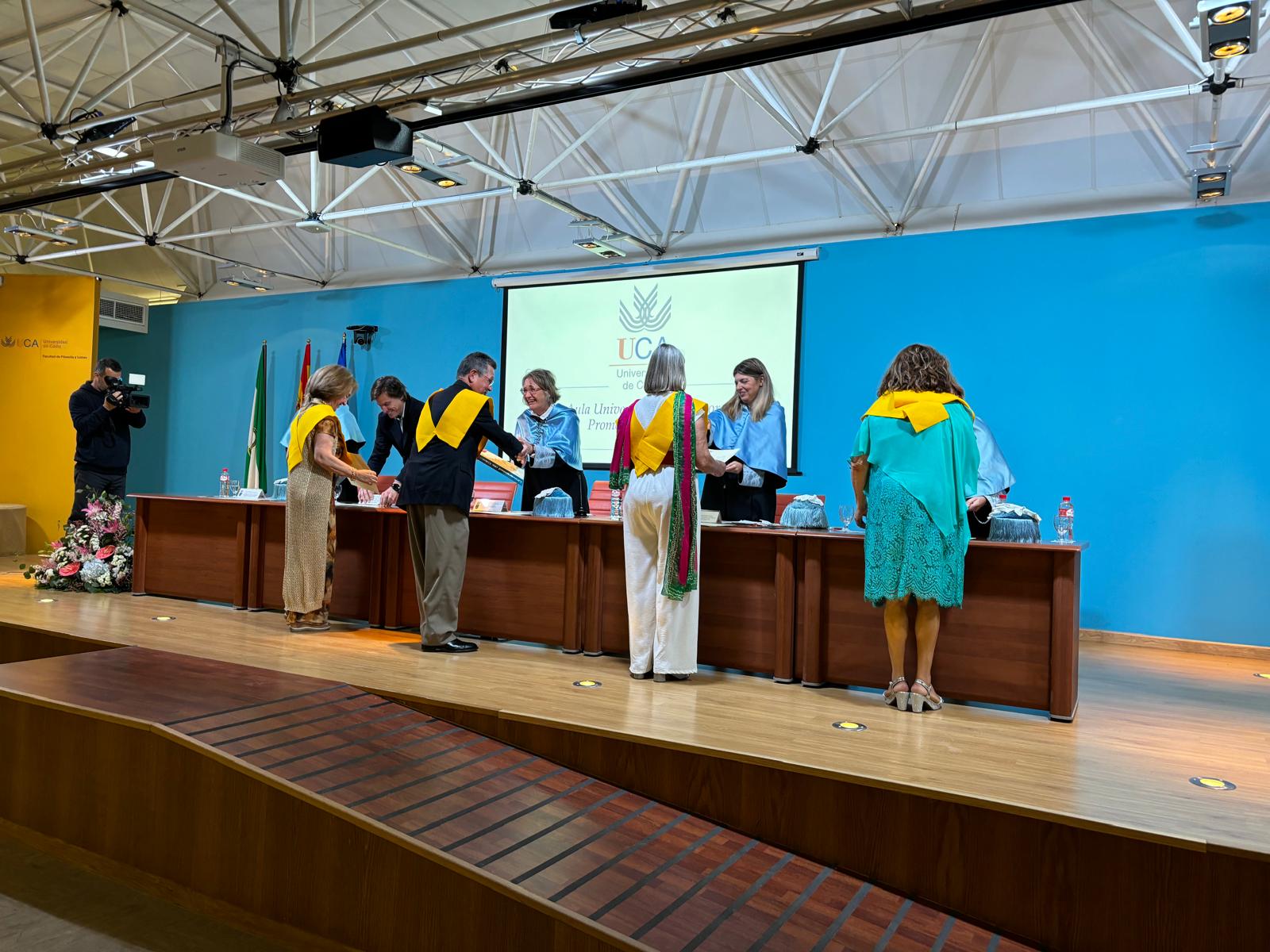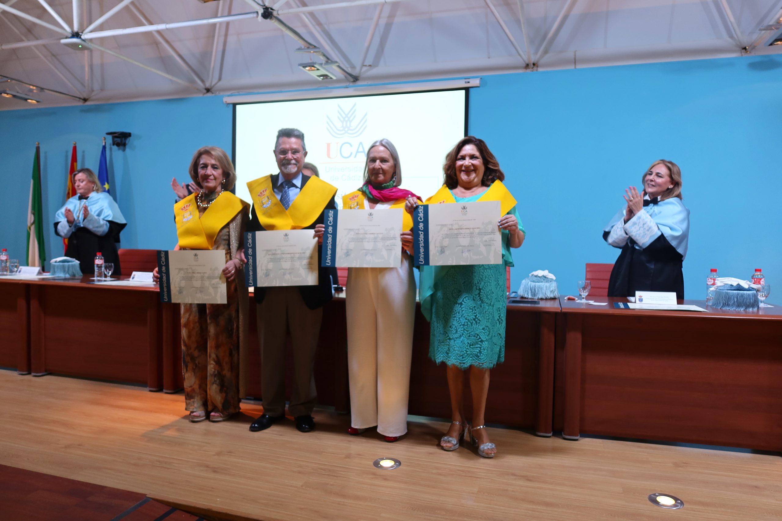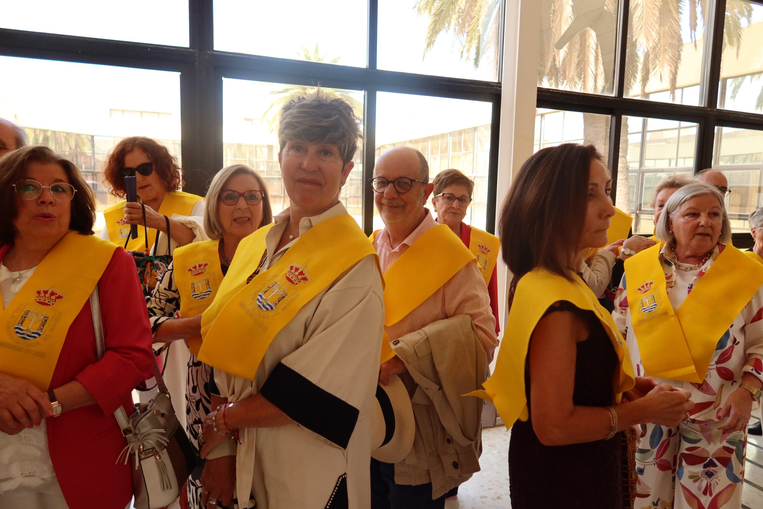 Medio centenar de personas se han graduado hoy en la Facultad de Filosofía y Letras. La vicerrectora de Estudiantes de la Universidad de Cádiz, Nuria Campos, en compañía del concejal de Presidencia y Relaciones Institucionales, delegado de Asuntos Sociales y Familia del Ayuntamiento de Cádiz, Pablo Otero, la directora del Aula Universitaria de Mayores y la subdirectora de la sede de Cádiz, M.ª Jesús Paredes y Ana María Niveau de Villedary, respectivamente, y la profesora Lucía Cancelas, ha presidido hoy, en el aula Magna, la ceremonia de graduación de 5º del Aula Universitaria de Mayores en Cádiz de la promoción 2019/2024.