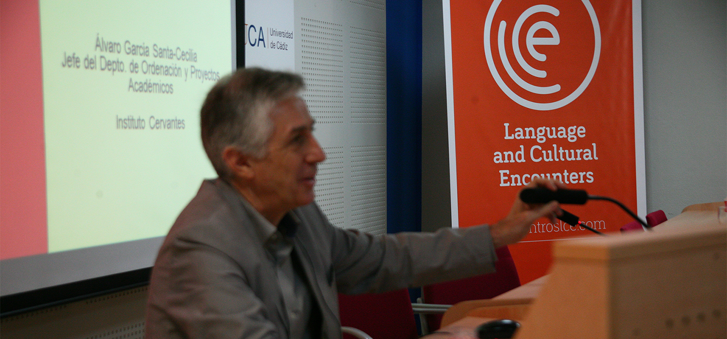 El jefe del departamento de Ordenación y Proyectos Académicos del Instituto Cervantes, Álvaro García Santa-Cecilia, ha impartido la conferencia inaugural Enseñar y aprender lenguas hoy: una nueva carta de navegación para el entendimiento intercultural. El ponente ha partido de los efectos positivos de la globalización, de la “compresión del tiempo y espacio en la comunicación, un avance de bienestar en las últimas décadas”. En este contexto, ha analizado el cuestionamiento de las ideas sobre la visión del mundo de la modernidad desde las alternativas posmodernas, “más acordes con la actualidad”, como que el conocimiento pueda sustentarse más en las lenguas, valores y relaciones sociales que en los hechos científicos, los acontecimientos “mediados social y lingüísticamente”.