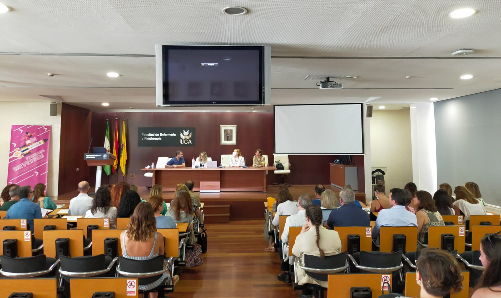 El vicerrector de Estudiantes y Empleo de la UCA, Manuel Sánchez, junto al director General del Centro de Promoción de Empleo y Prácticas, Luis López, la delegada territorial de la Consejería de Igualdad, Políticas Sociales y Conciliación en Cádiz, Ana Fidalgo, la presidenta de la Asociación Red Profesional Mujeres Imparables, Lola Rueda, y la gerente de la UCA, Mariví Martínez, han presidido el acto en la Facultad de Enfermería y Fisioterapia de Cádiz.