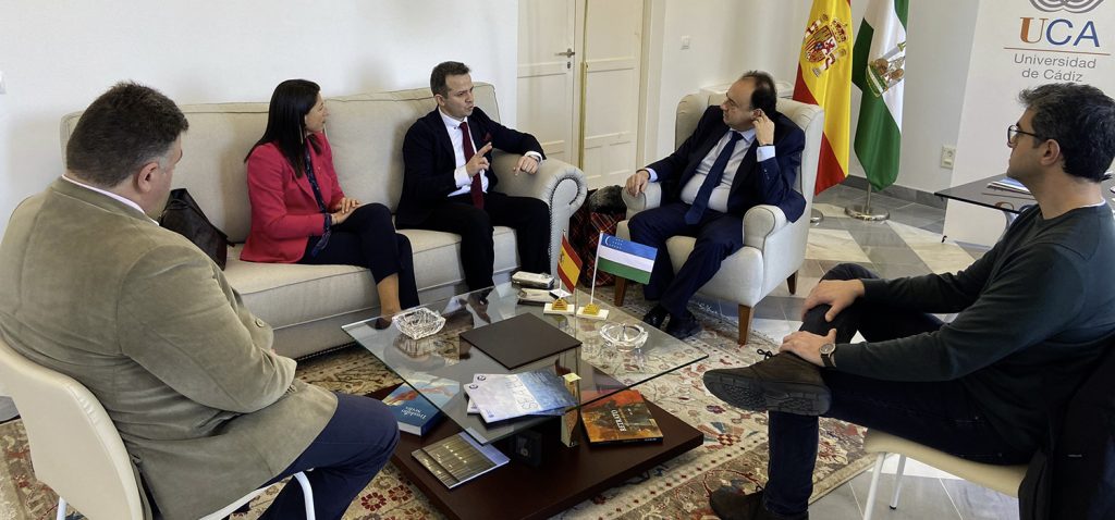 Durante el encuentro, celebrado en el edificio del Rectorado, ambos han tratado los acuerdos de colaboración existentes entre ambas entidades educativas, que tratan temas como las matrículas de alumnos uzbekos en cursos ECA de enseñanza del español, diseñados en la Universidad de Cádiz a través del Centro Universitario Internacional para Europa del Este y Asia Central (CUNEAC) y del Centro Superior de Lenguas Modernas (CSLM), además de su inclusión en el consorcio UCA para Eramus+171, con ayudas como las denominadas becas cero.