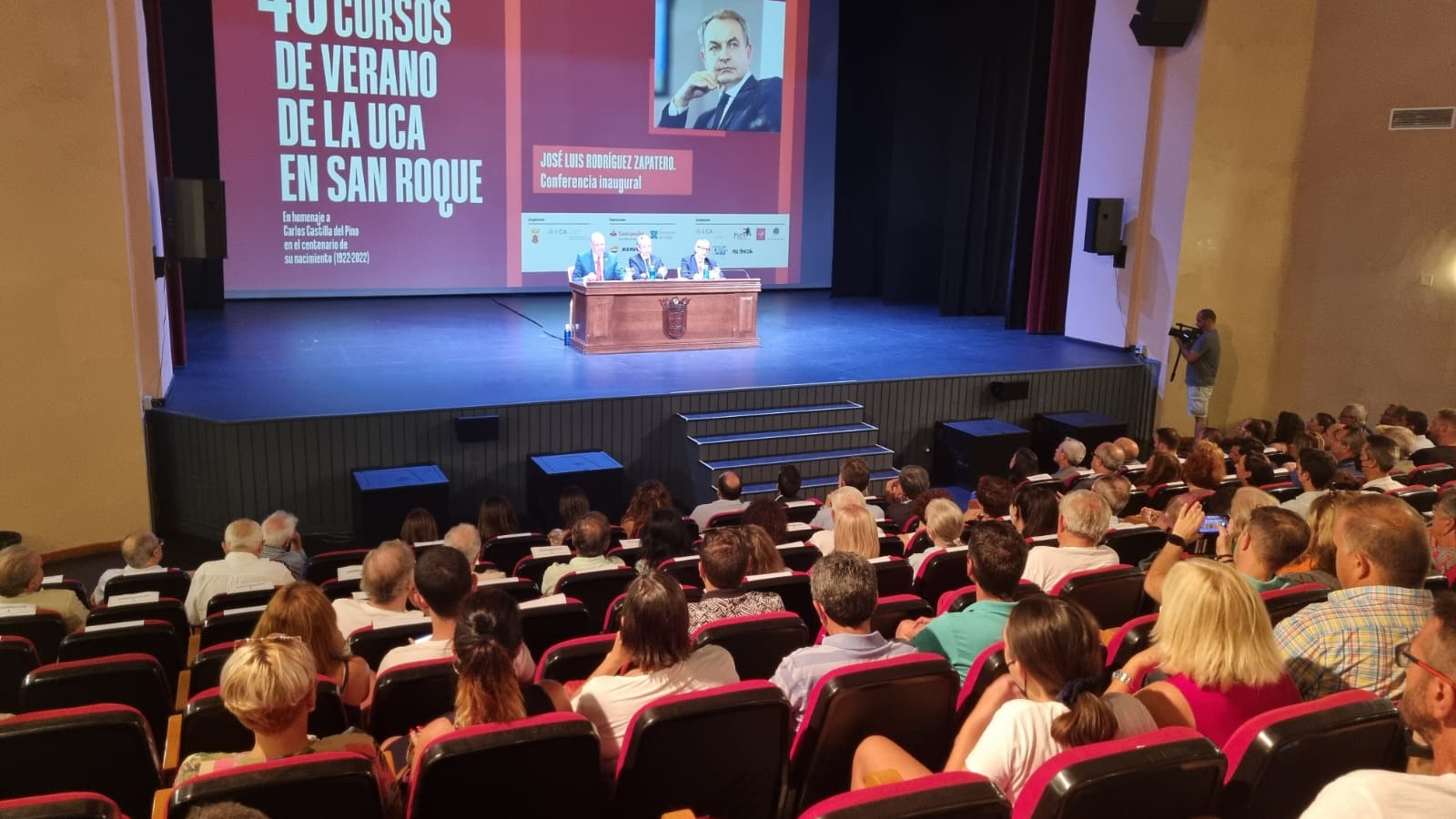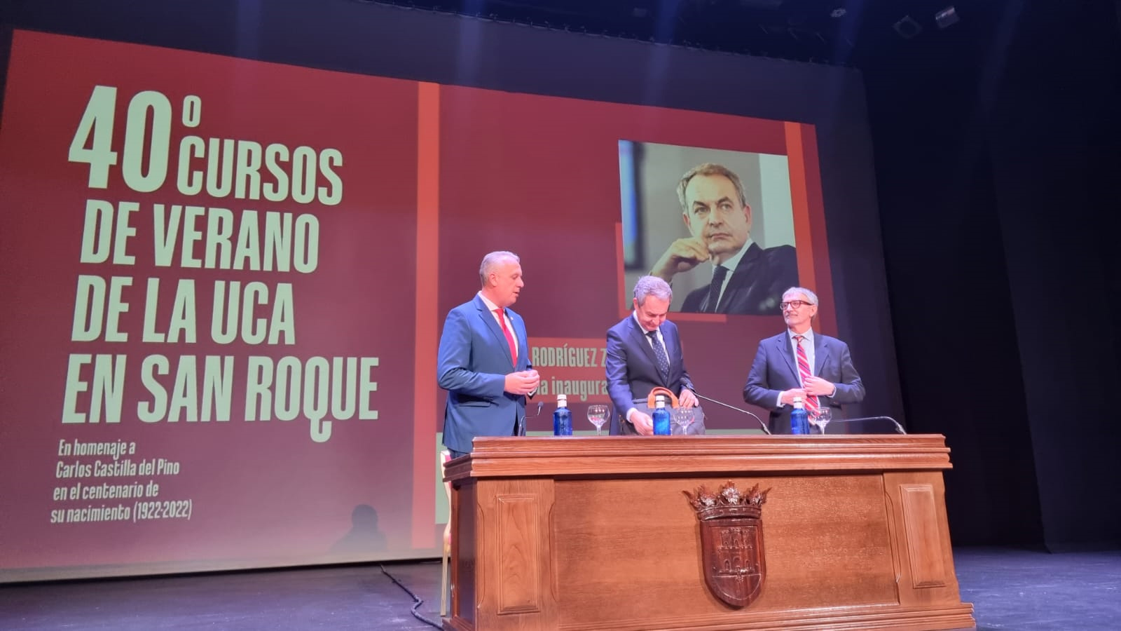 El expresidente del Gobierno de España, José Luis Rodríguez Zapatero, ha impartido hoy la conferencia inaugural de los XL Cursos de Verano de la UCA en San Roque dedicada a la actualidad internacional. El rector de la Universidad de Cádiz, Francisco Piniella, y el alcalde de San Roque, Juan Carlos Ruiz Boix, le han acompañado, ante un numeroso público, en el Teatro Juan Luis Galiardo.