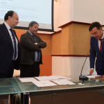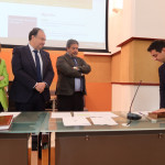 El rector de la Universidad de Cádiz, Casimiro Mantell, junto con el secretario General, Manuel Rozados, y la gerente de la UCA, Mariví Martínez, ha presidido hoy, en el salón de Grados de la Facultad de Ciencias Económicas y Empresariales, la toma de posesión de cargos académicos y personal técnico de administración y servicios.