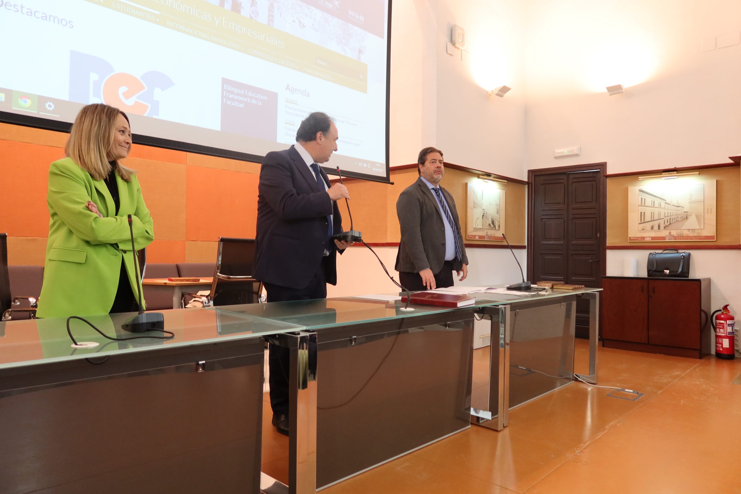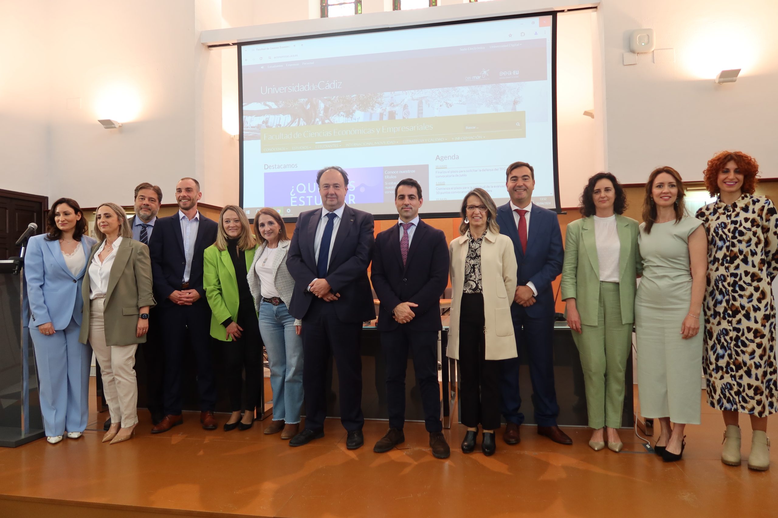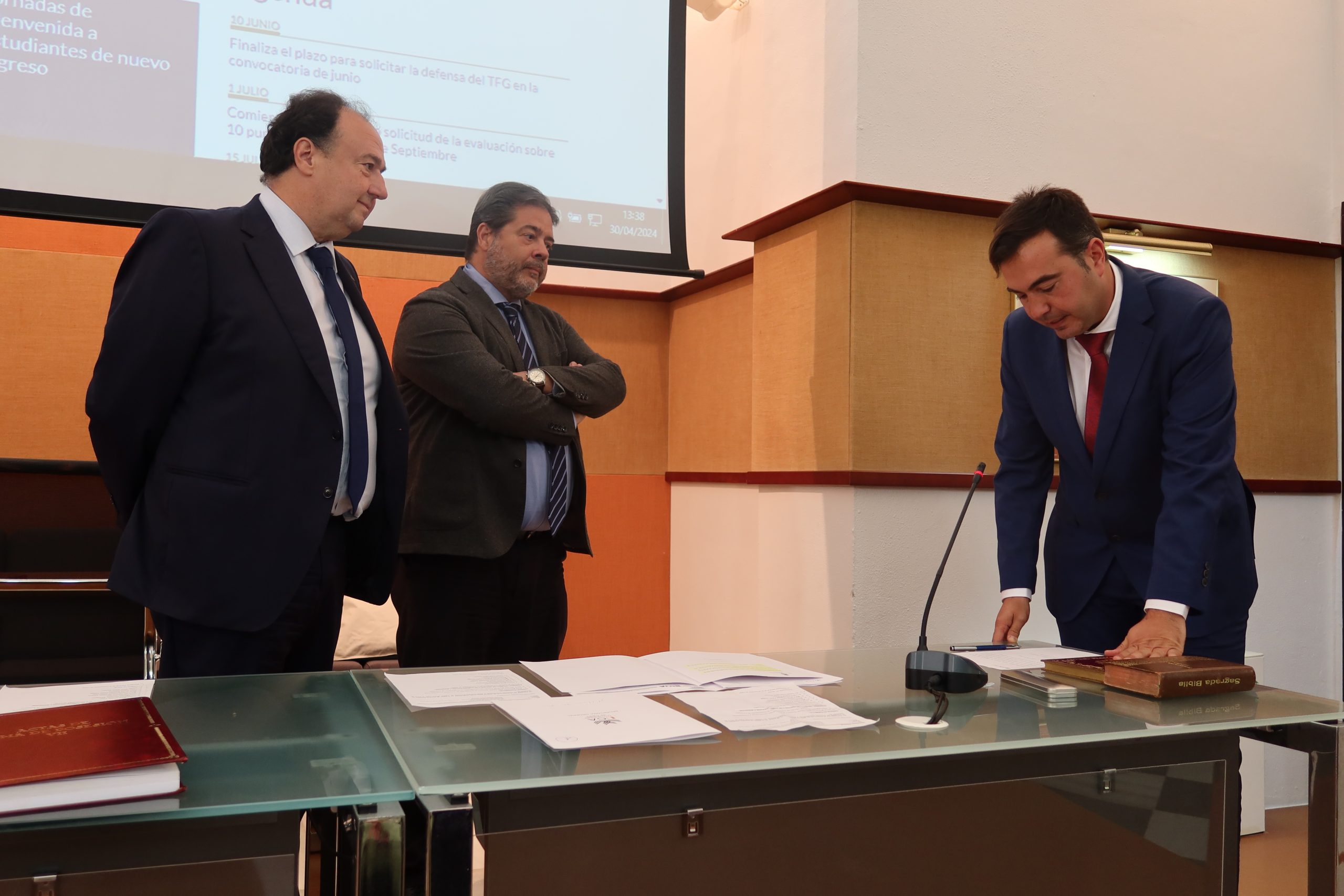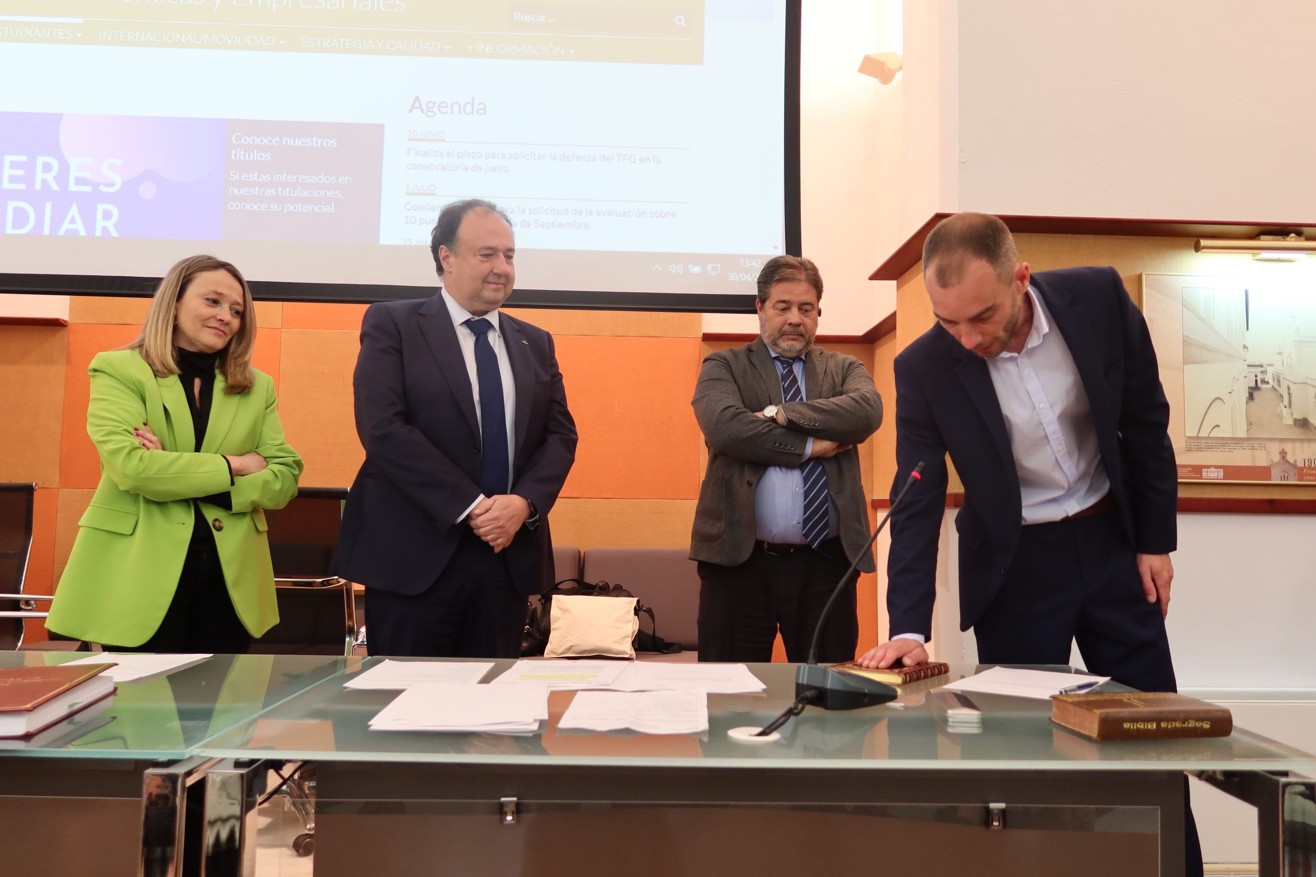 El rector de la Universidad de Cádiz, Casimiro Mantell, junto con el secretario General, Manuel Rozados, y la gerente de la UCA, Mariví Martínez, ha presidido hoy, en el salón de Grados de la Facultad de Ciencias Económicas y Empresariales, la toma de posesión de cargos académicos y personal técnico de administración y servicios.