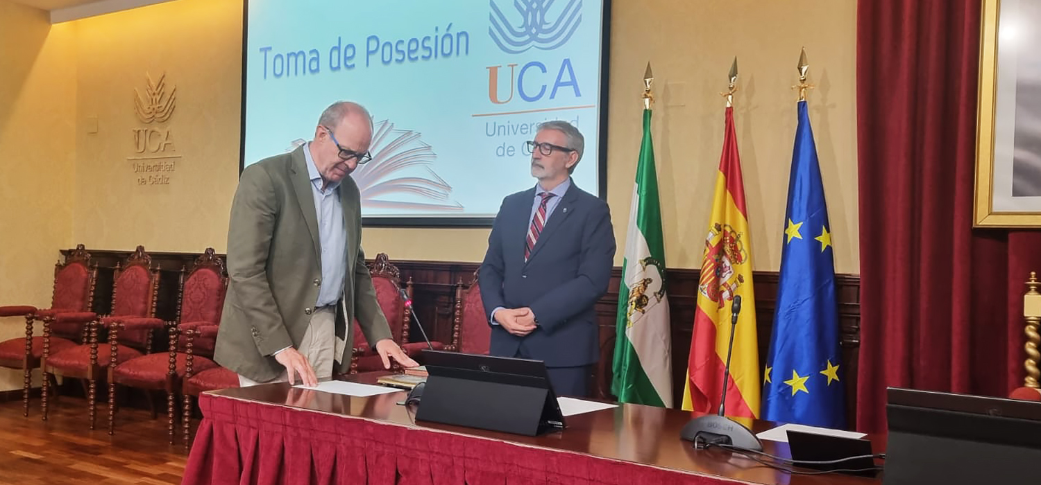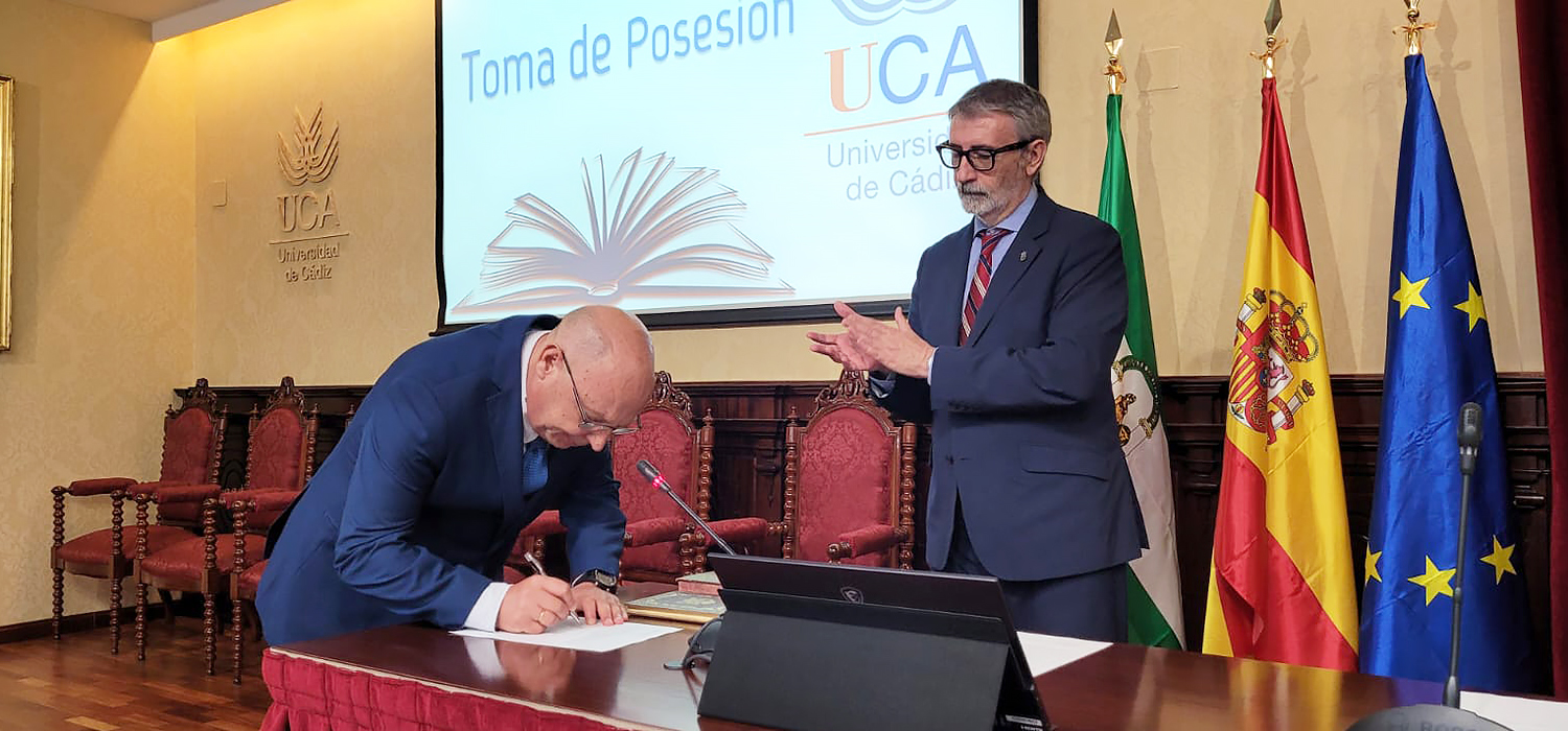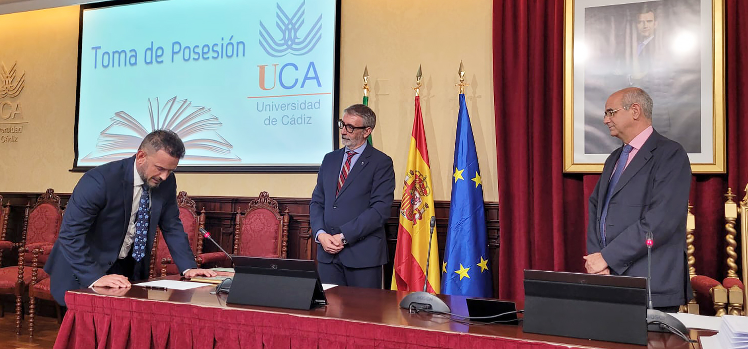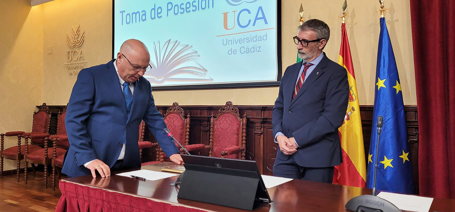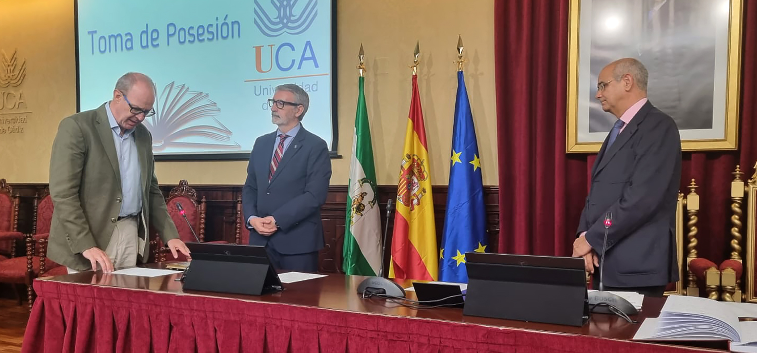 El rector de la Universidad de Cádiz, Francisco Piniella, en compañía del secretario General, José Justo Megías, ha presidido hoy la toma de posesión del nuevo vicerrector del Campus Bahía de Algeciras de la UCA