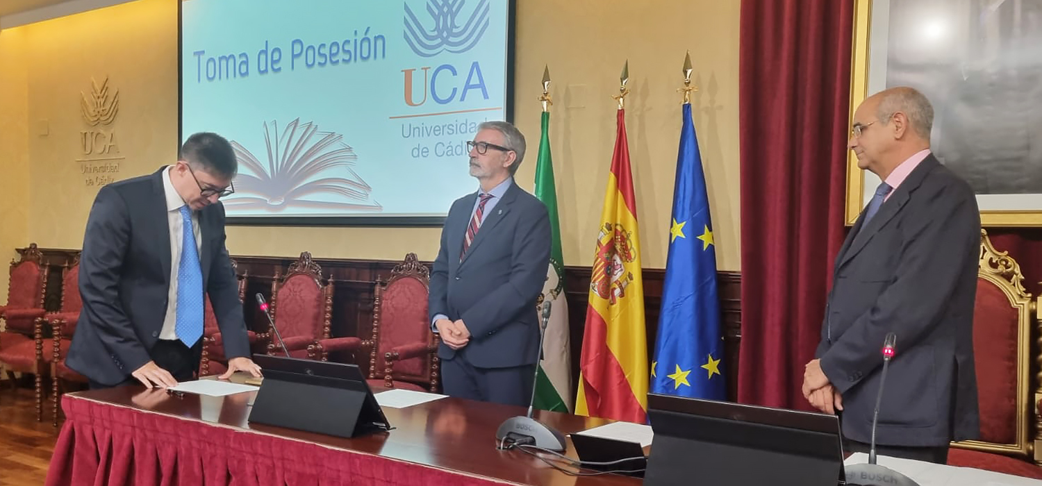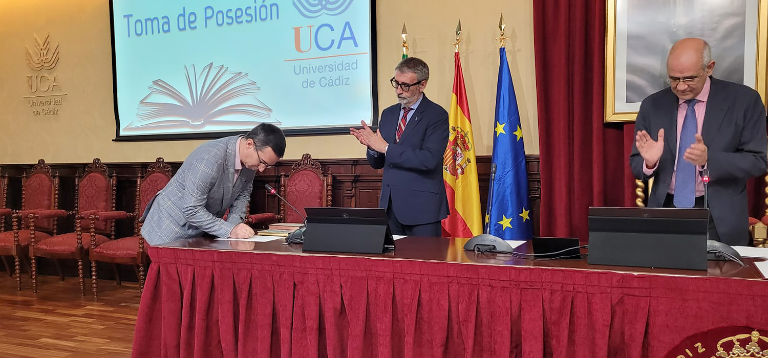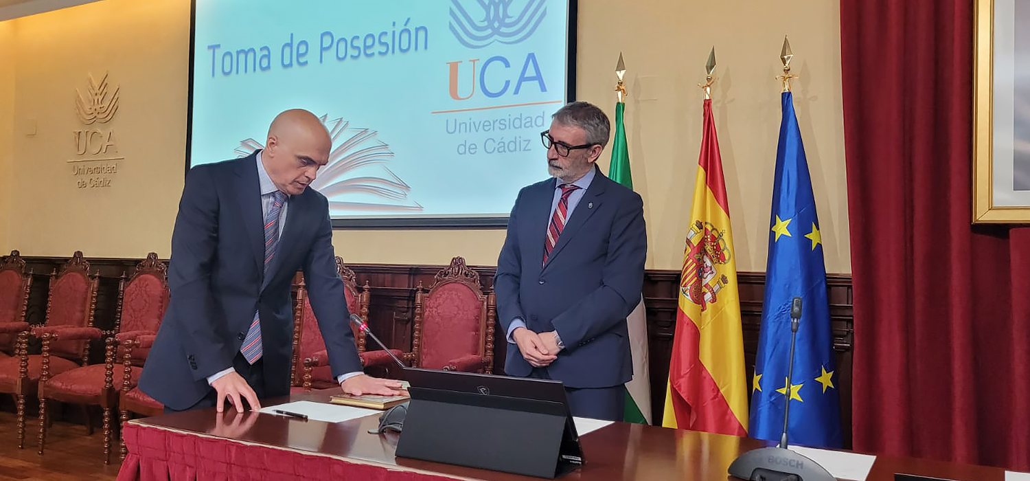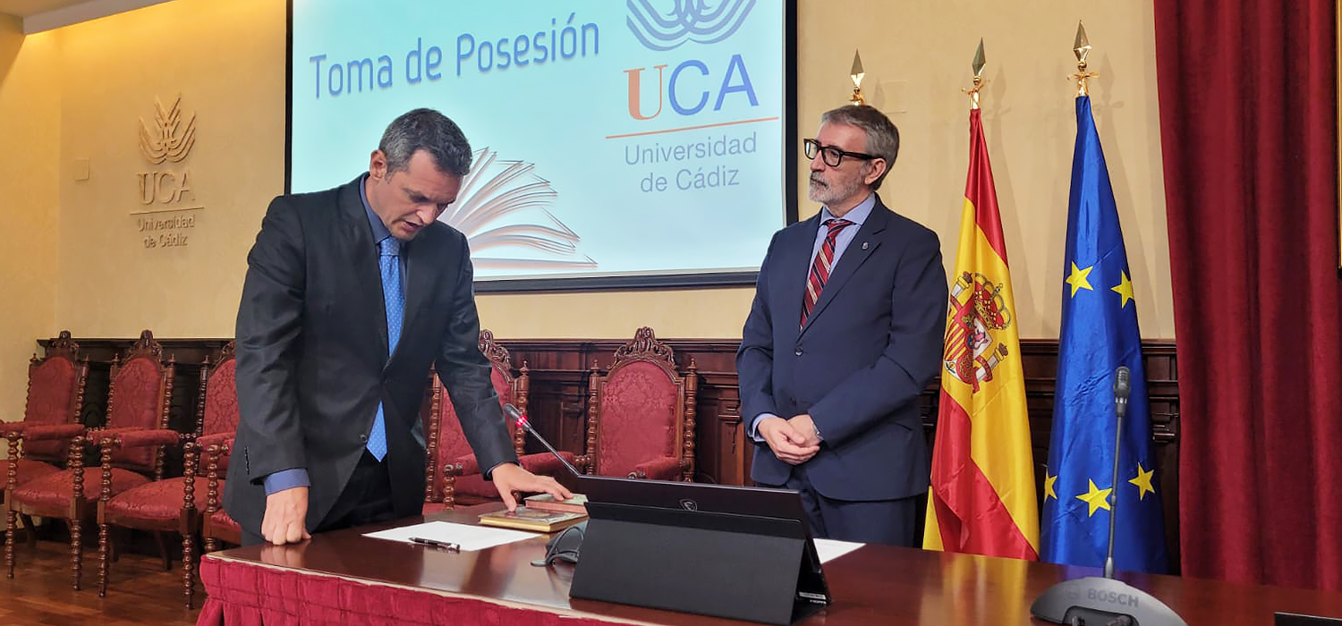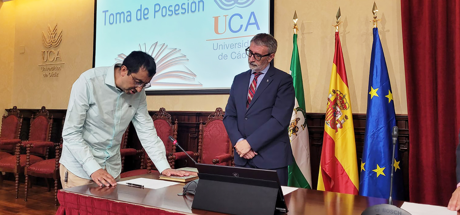 El rector de la Universidad de Cádiz, Francisco Piniella, en compañía del secretario General, José Justo Megías, ha presidido hoy la toma de posesión del nuevo vicerrector del Campus Bahía de Algeciras de la UCA