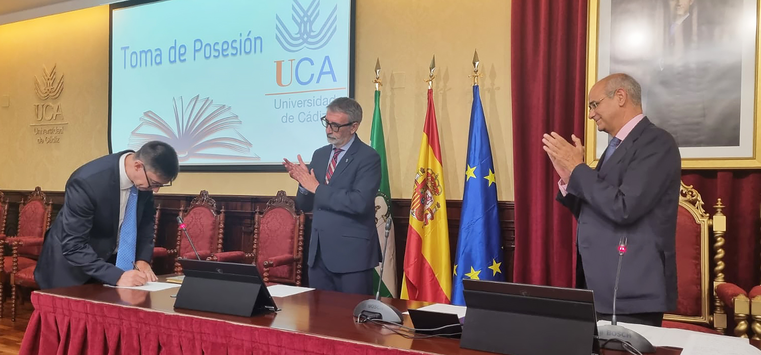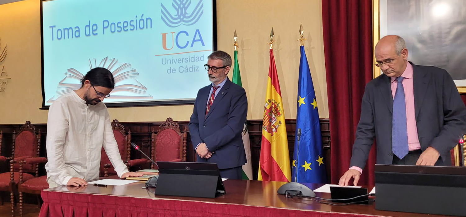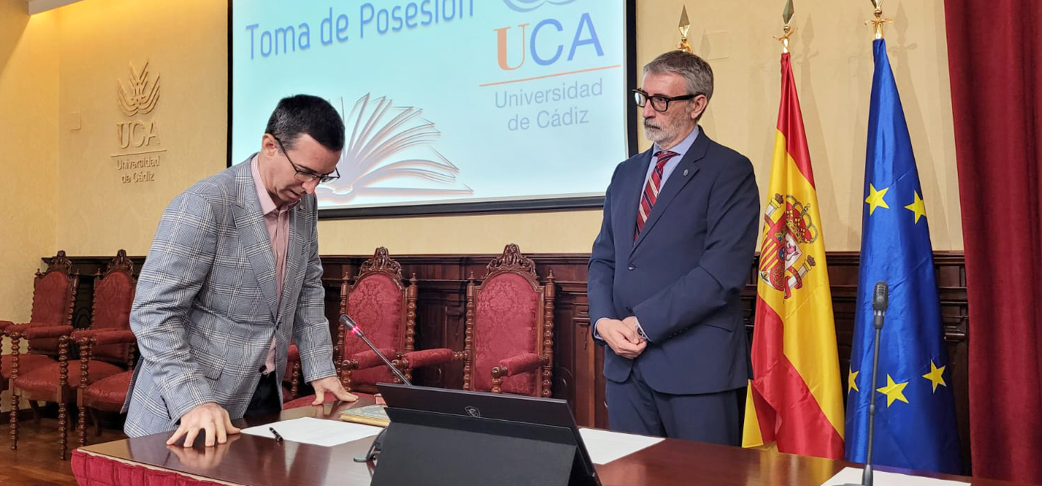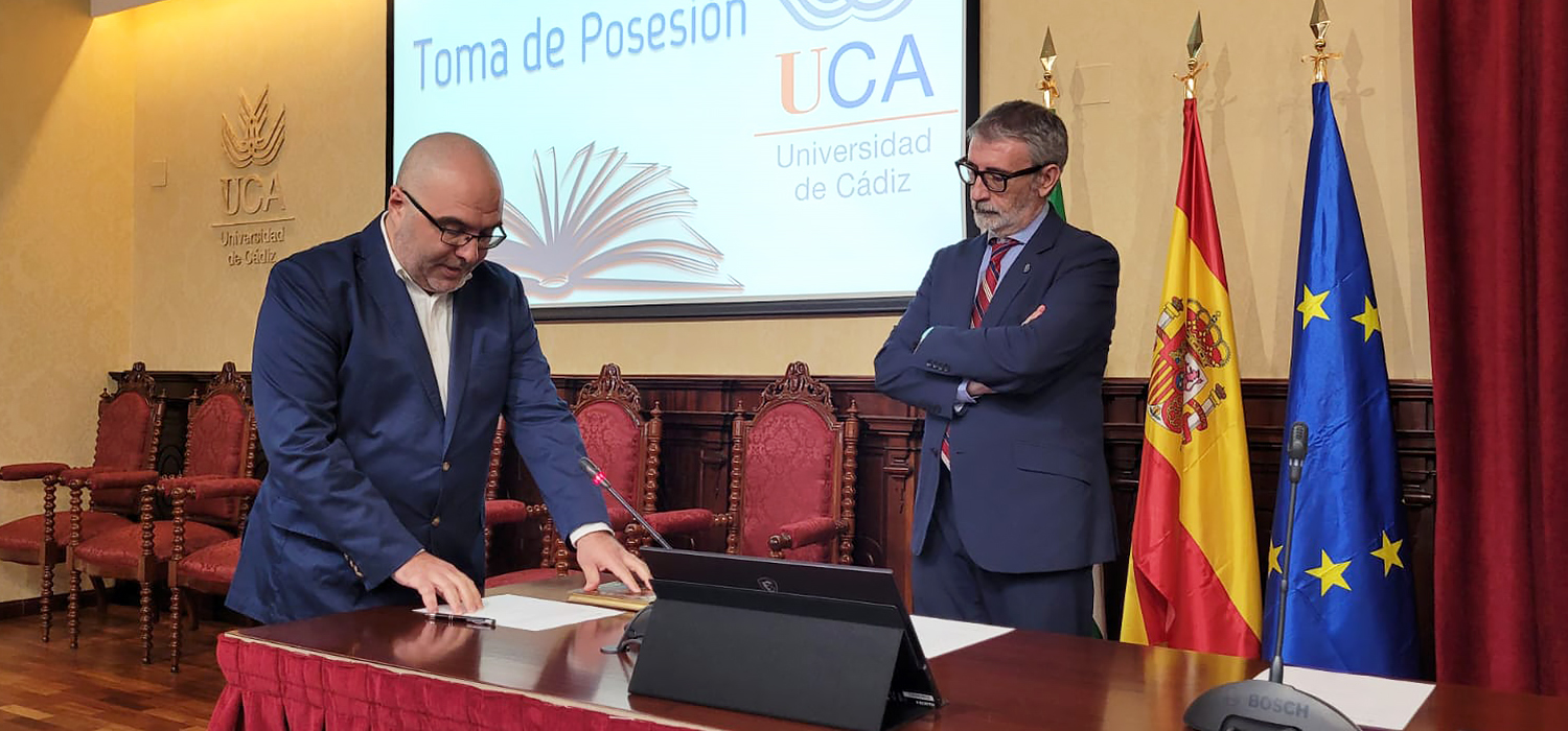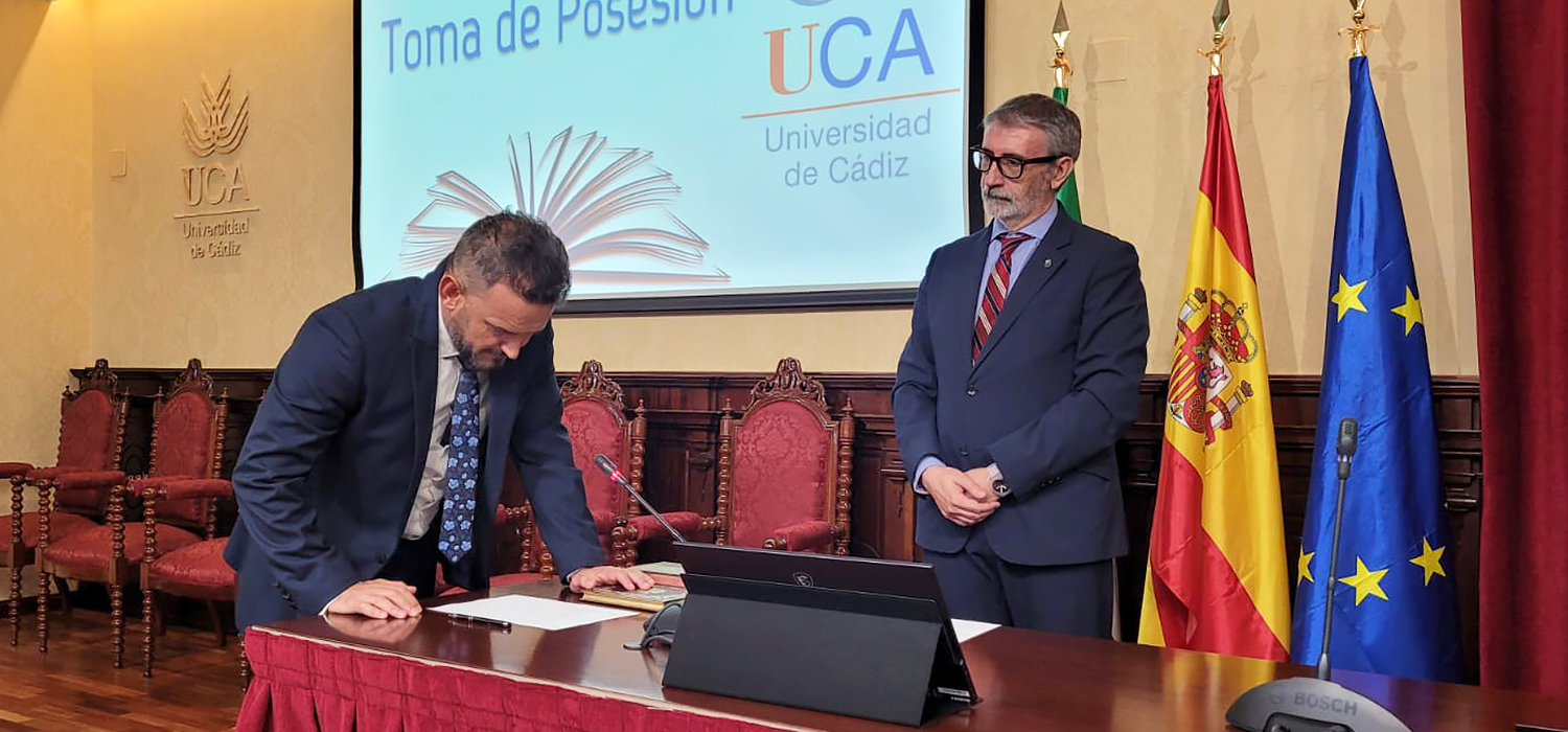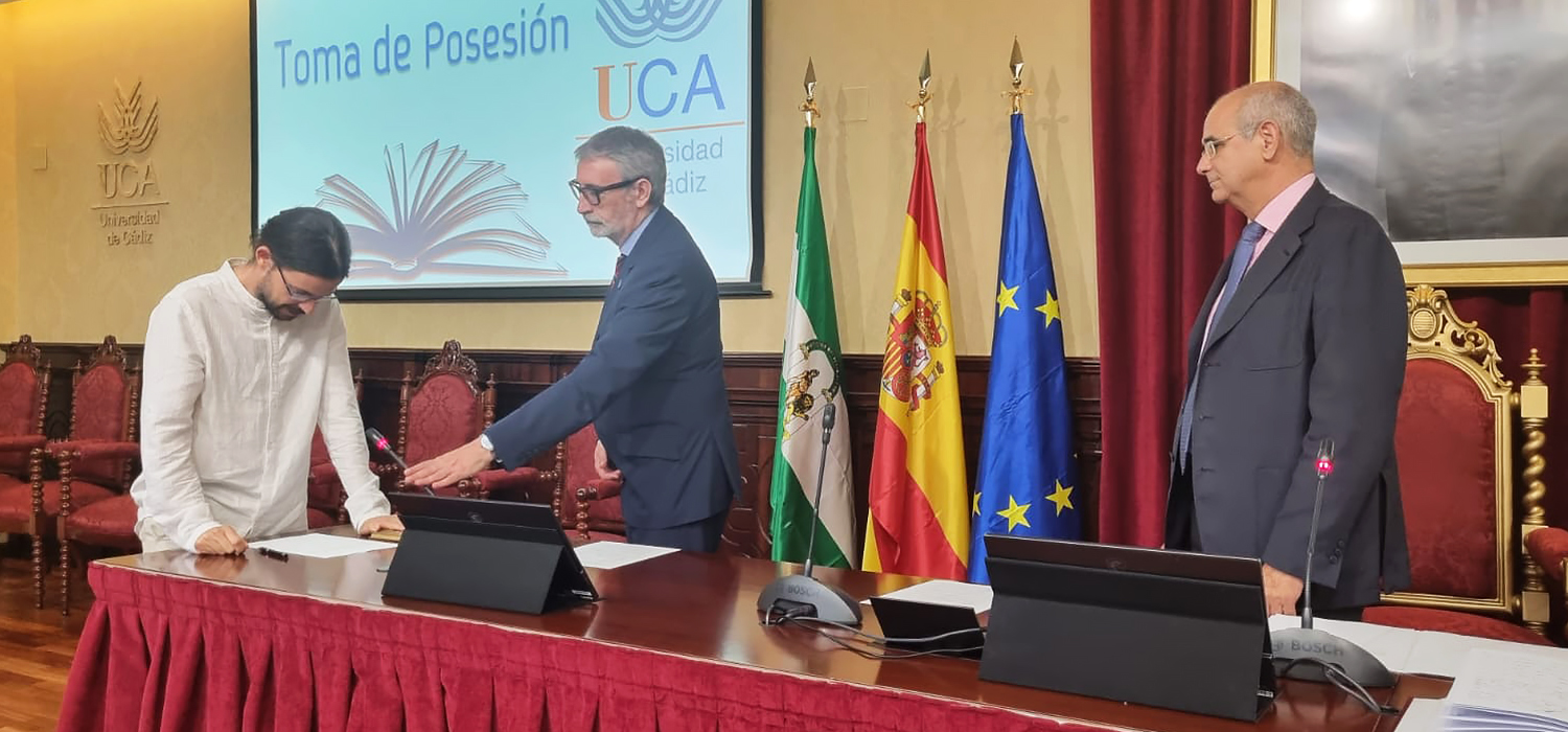 El rector de la Universidad de Cádiz, Francisco Piniella, en compañía del secretario General, José Justo Megías, ha presidido hoy la toma de posesión del nuevo vicerrector del Campus Bahía de Algeciras de la UCA