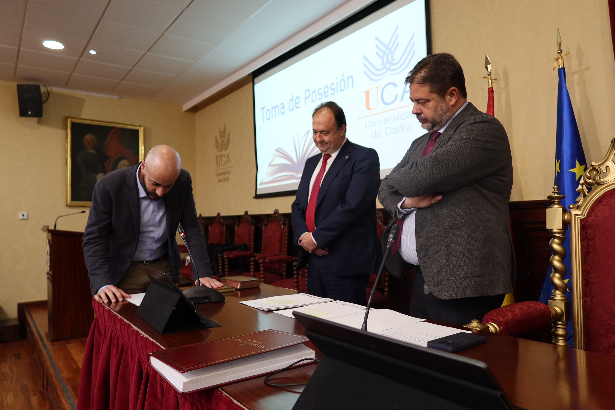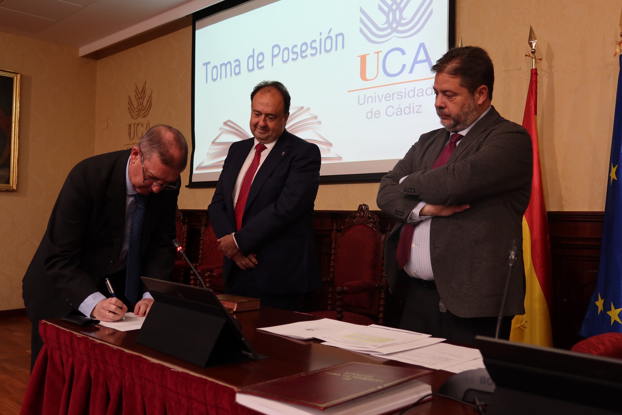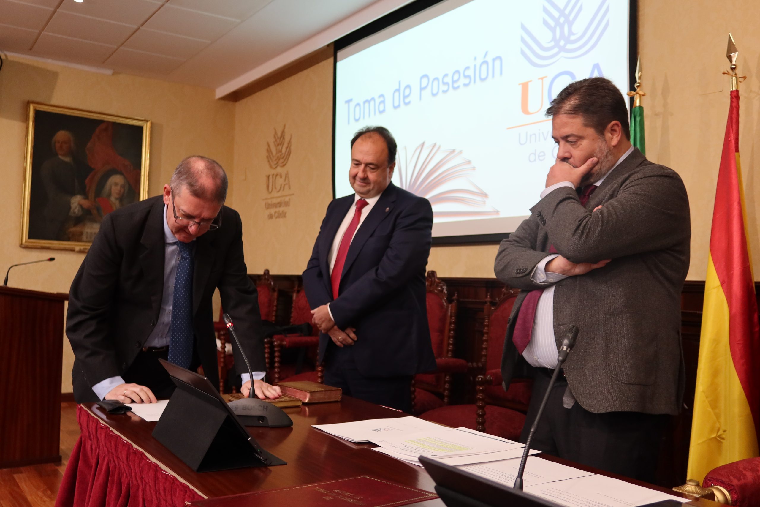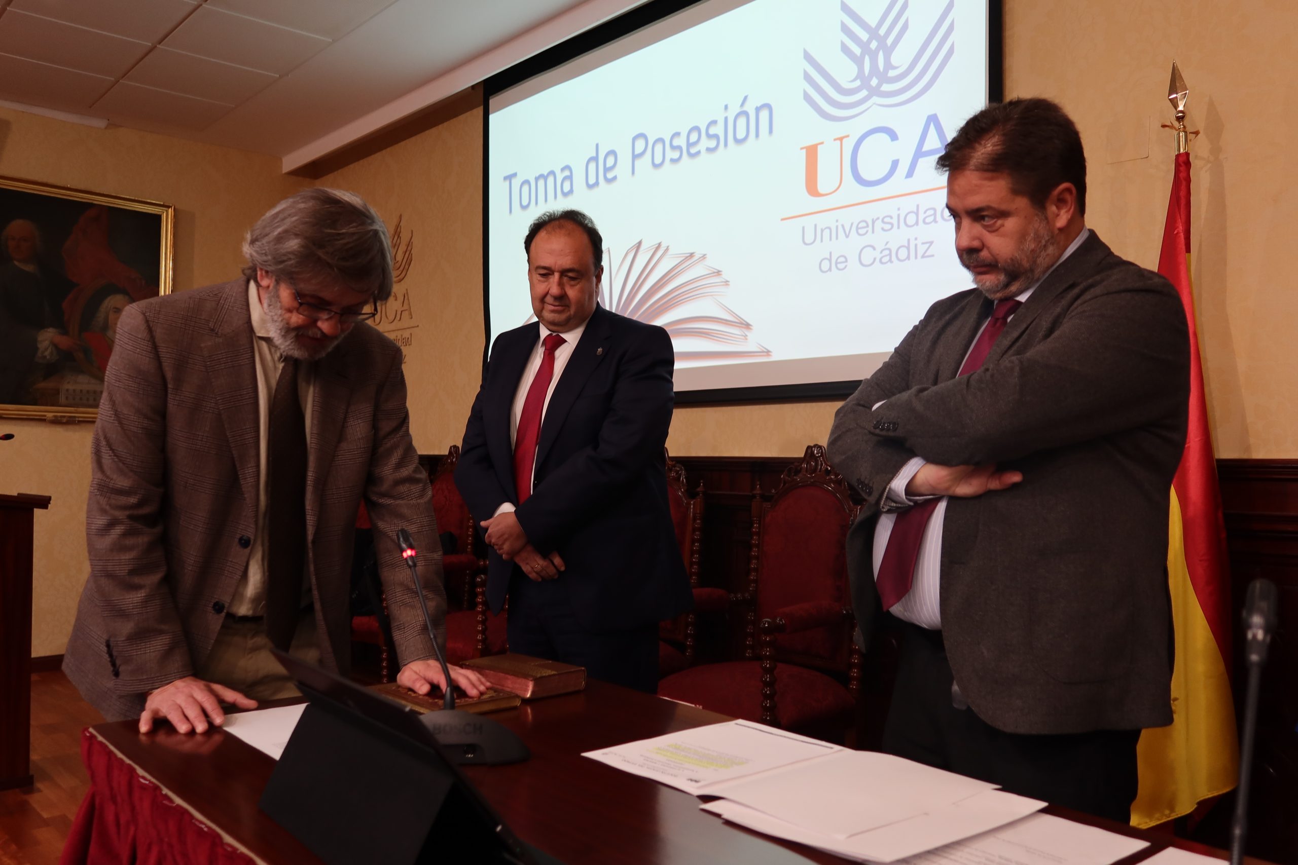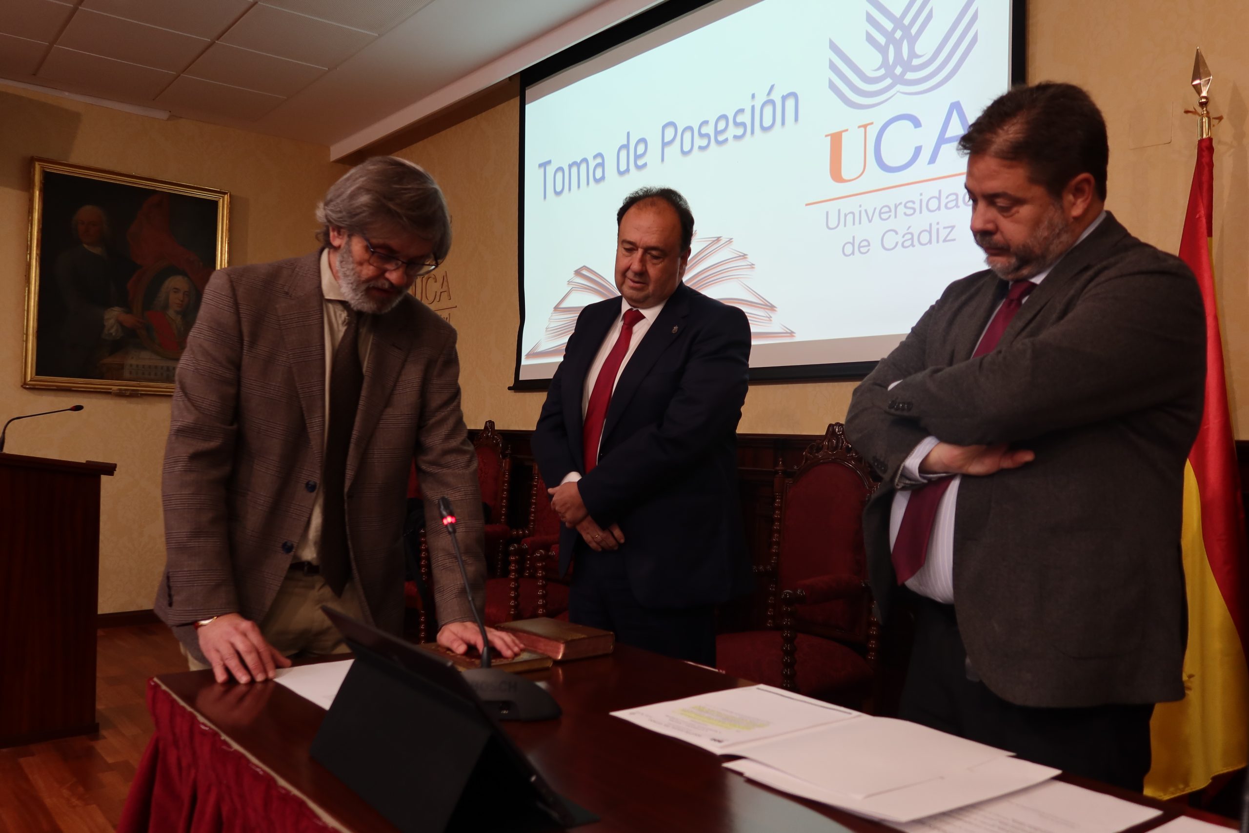El rector de la Universidad de Cádiz, Casimiro Mantell, junto con el secretario General de la UCA, Manuel Rozados, ha presidido hoy, en el salón de Grados de la Facultad de Medicina, la toma de posesión de un cargo académico y tres catedráticos.