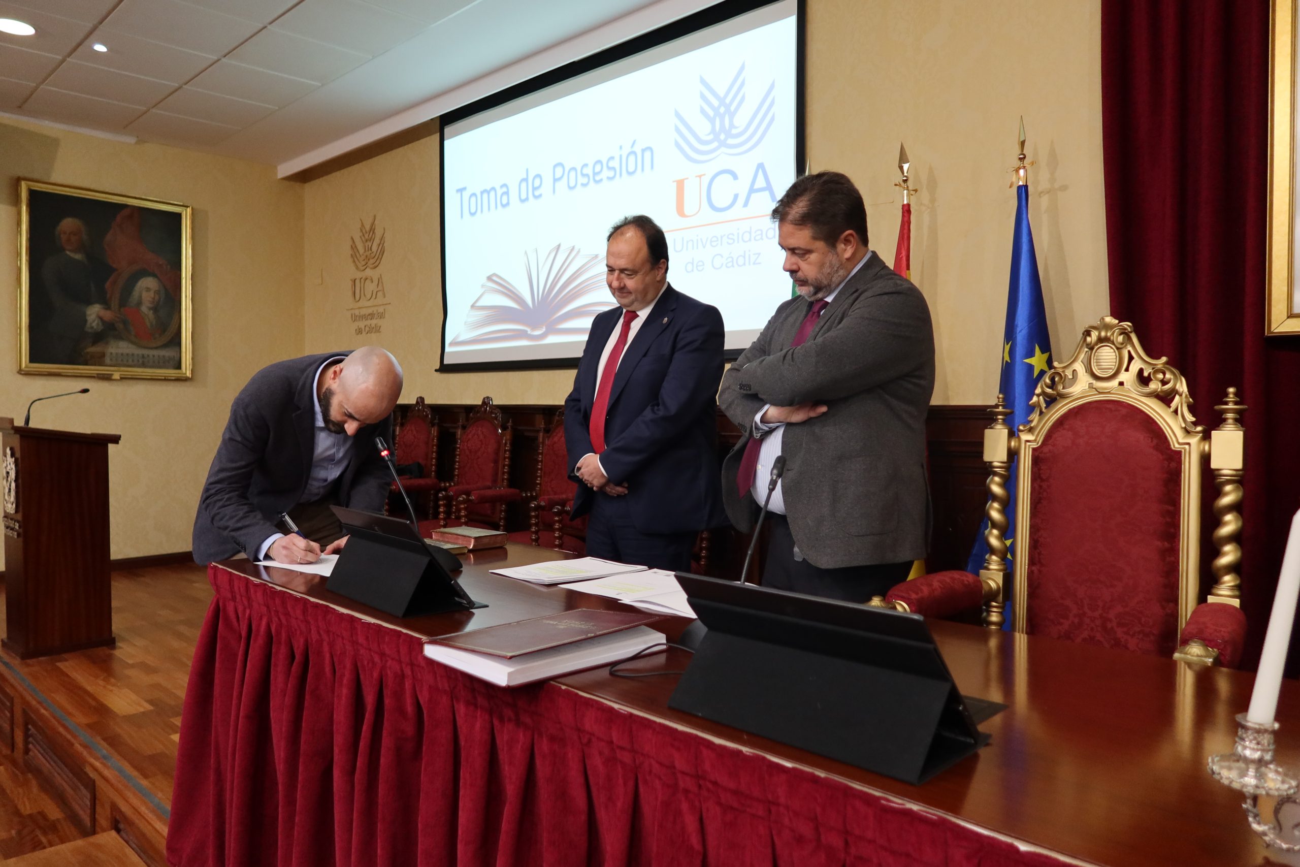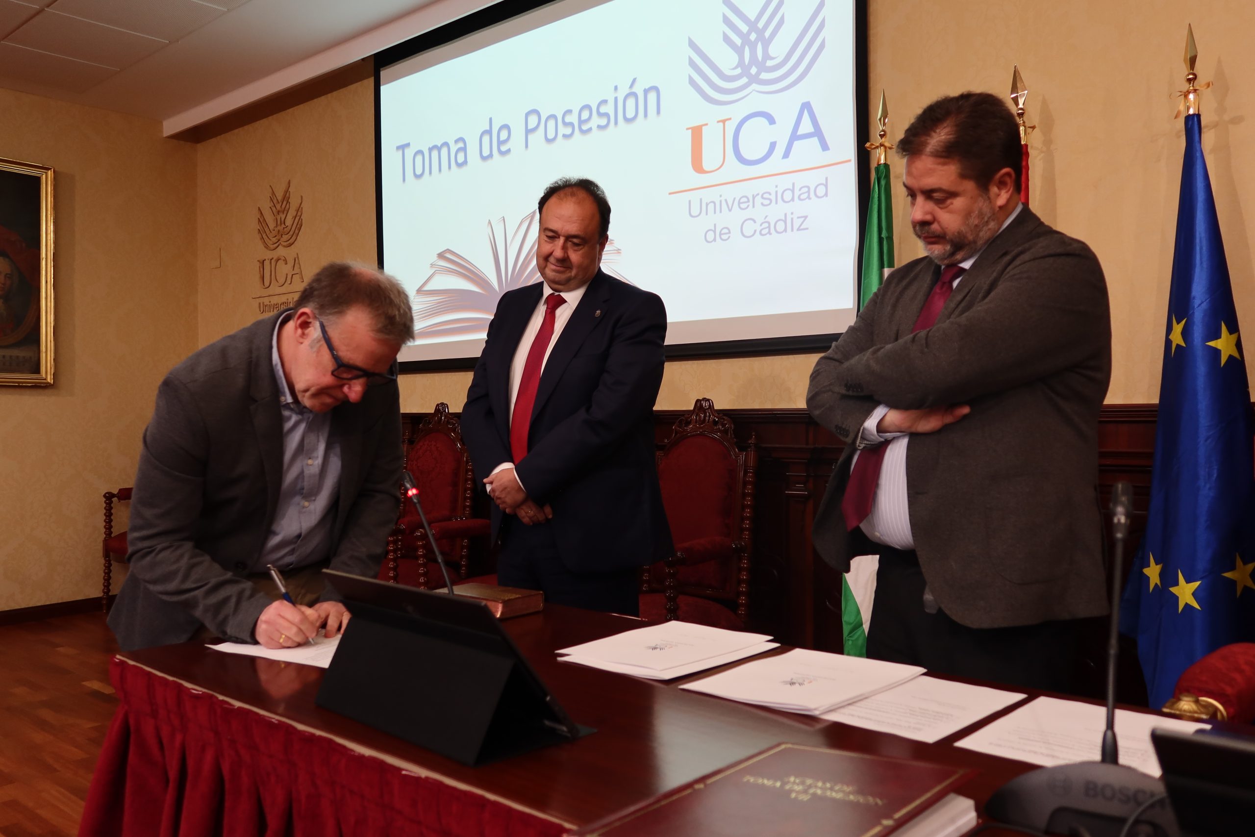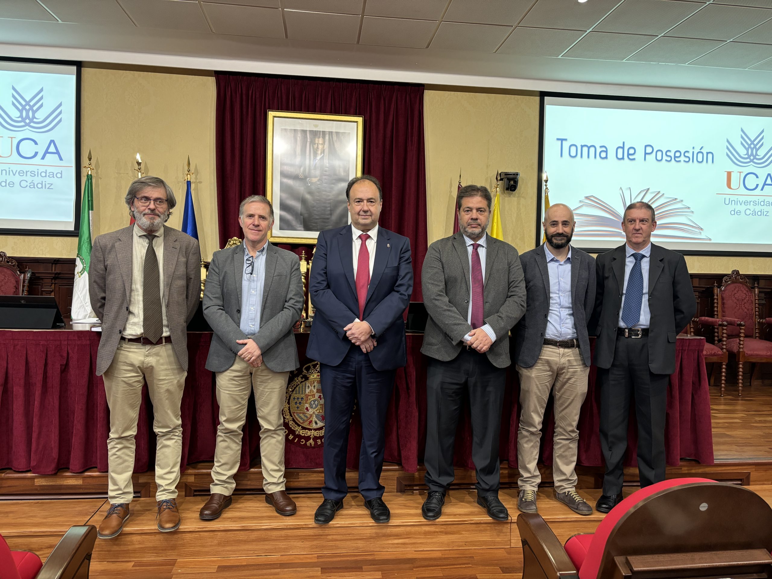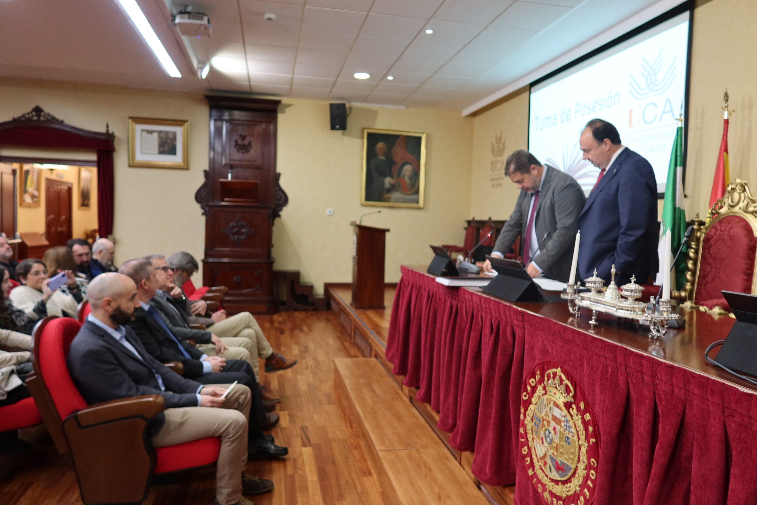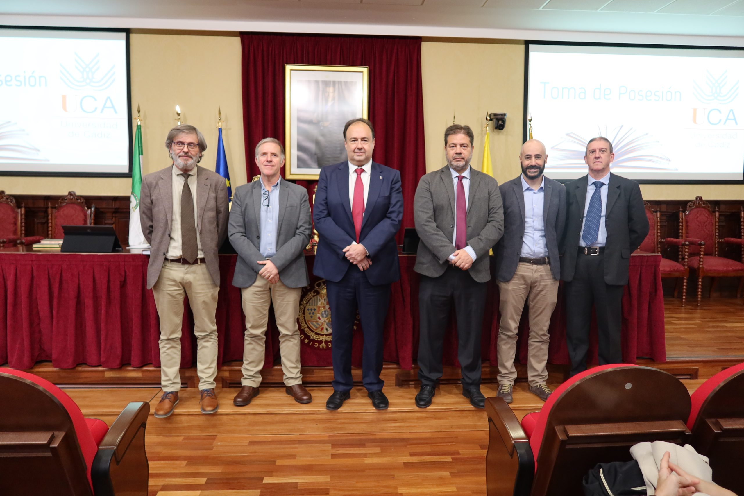 El rector de la Universidad de Cádiz, Casimiro Mantell, junto con el secretario General de la UCA, Manuel Rozados, ha presidido hoy, en el salón de Grados de la Facultad de Medicina, la toma de posesión de un cargo académico y tres catedráticos.