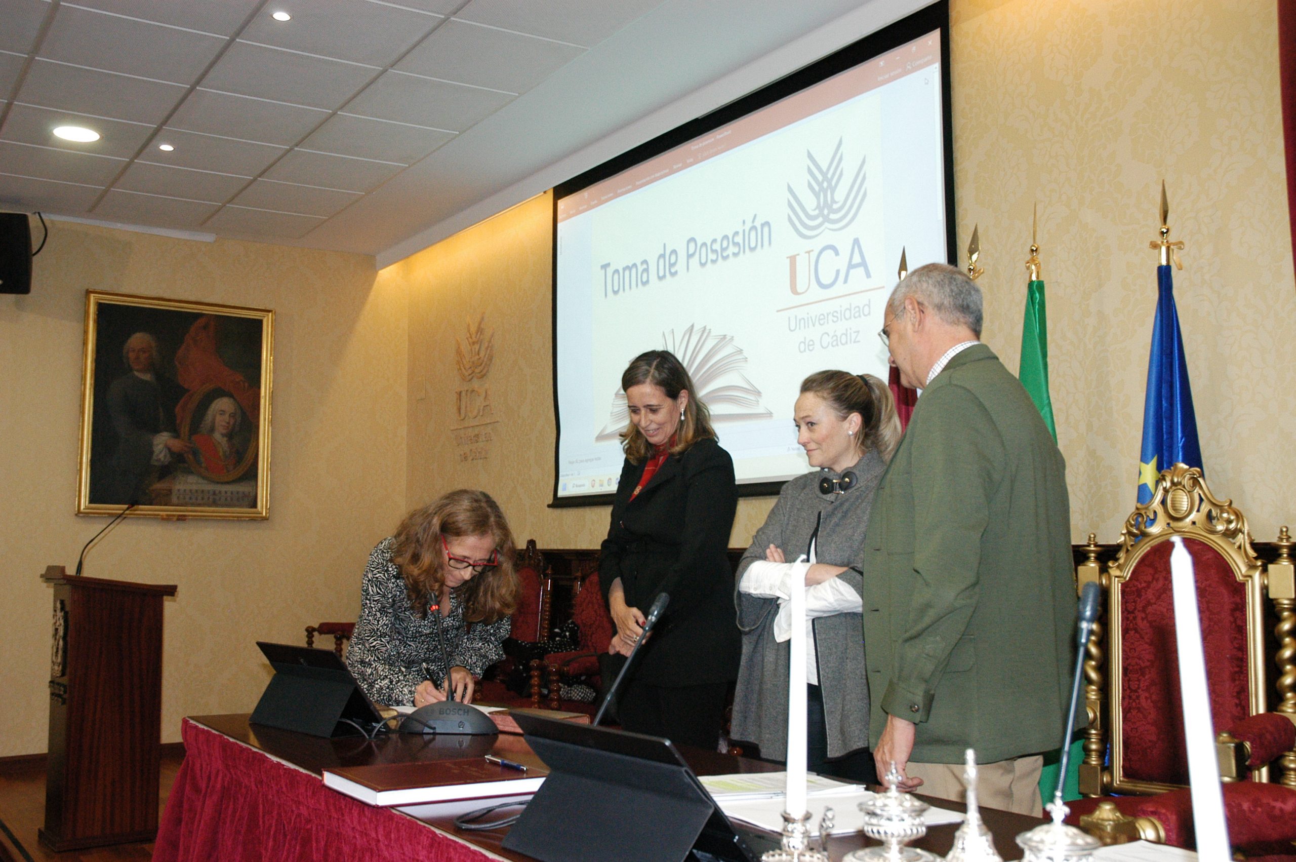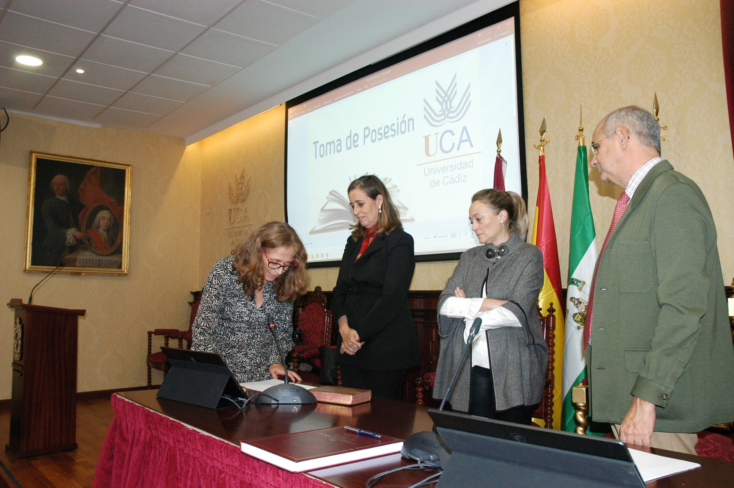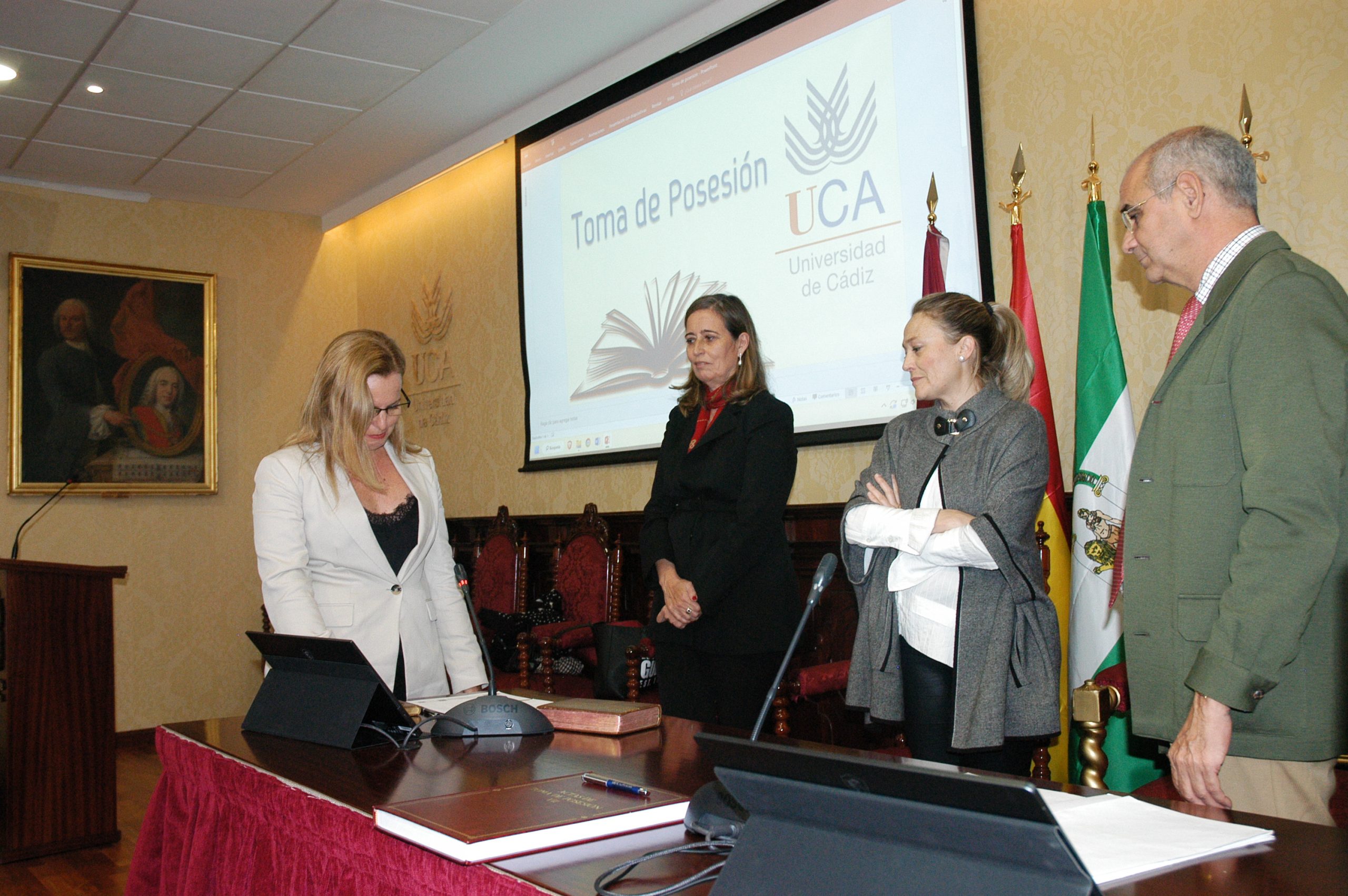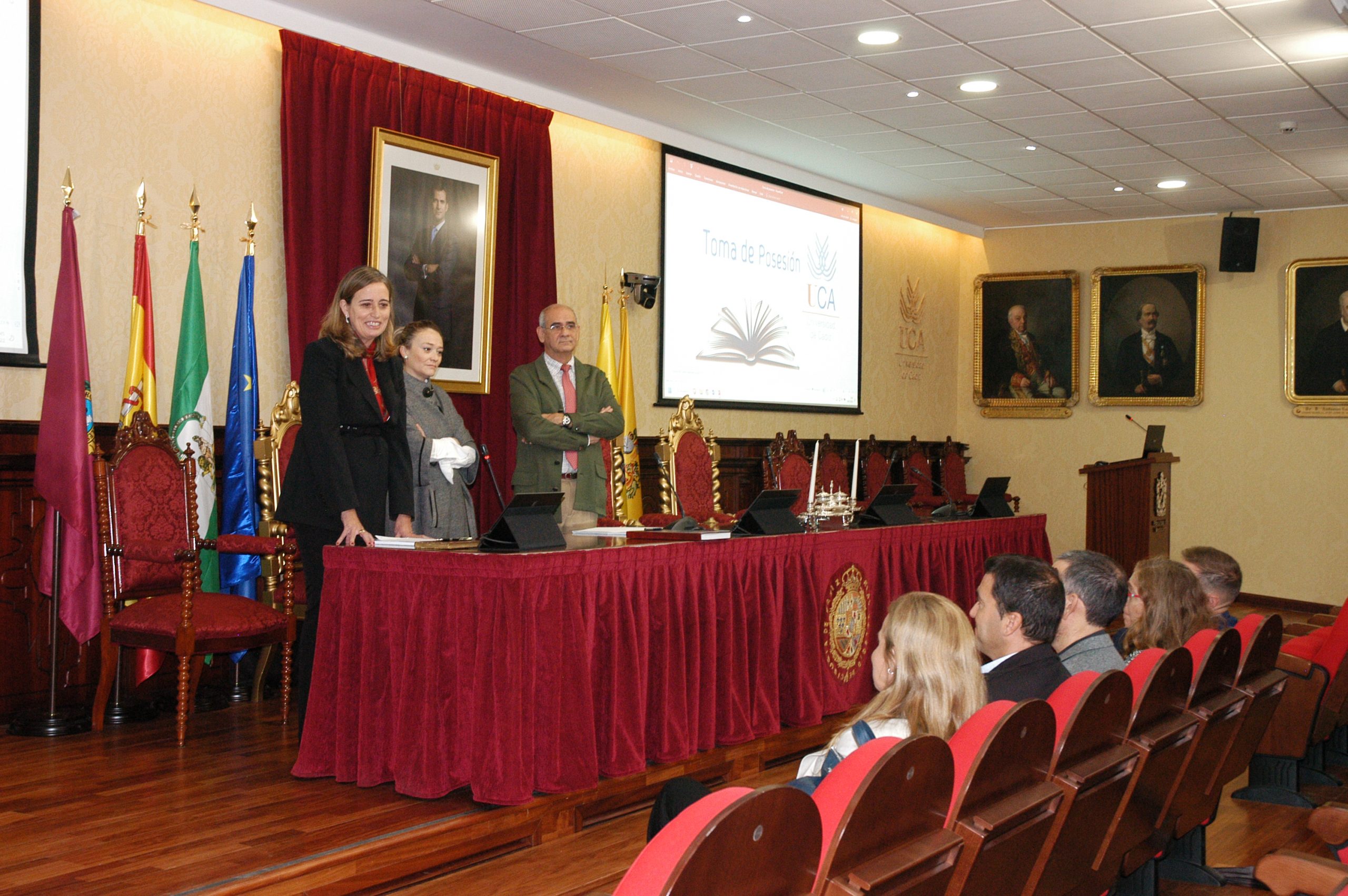 La vicerrectora de Política Científica y Tecnológica de la Universidad de Cádiz, Mª Jesús Mosquera, junto a la gerente, Mariví Martínez, y el secretario General, José Justo Megías, ha presidido hoy la toma de posesión de funcionarios, cargo académico y catedráticos de Universidad en el salón de Grados de la Facultad de Medicina.