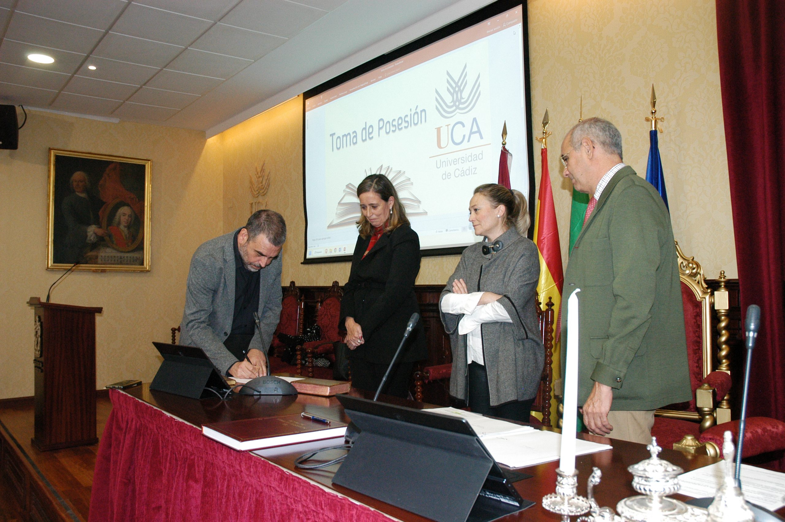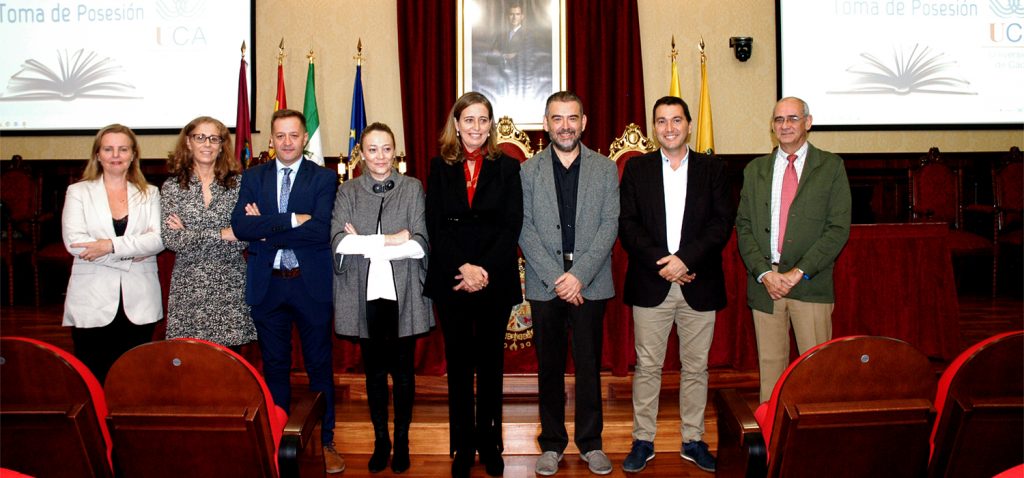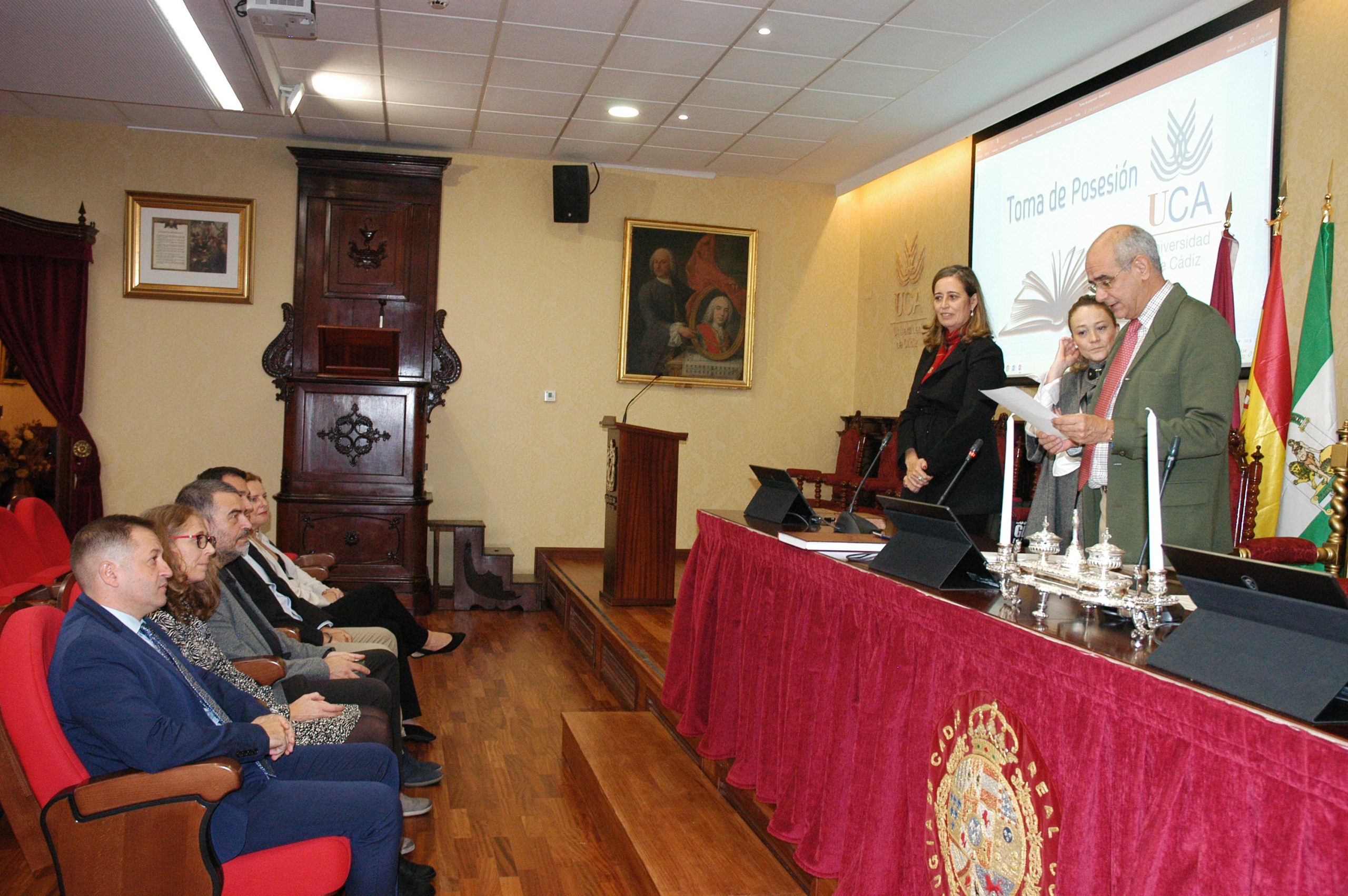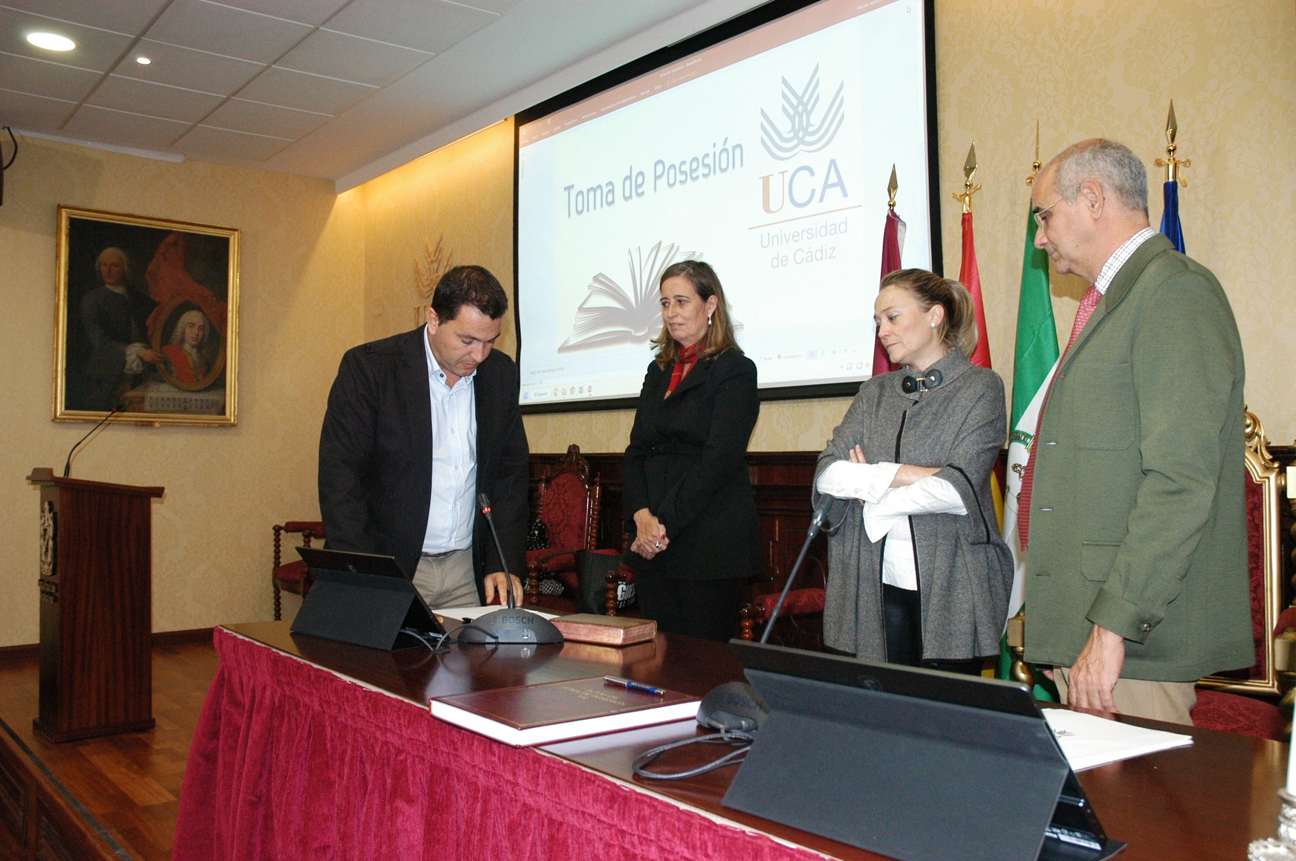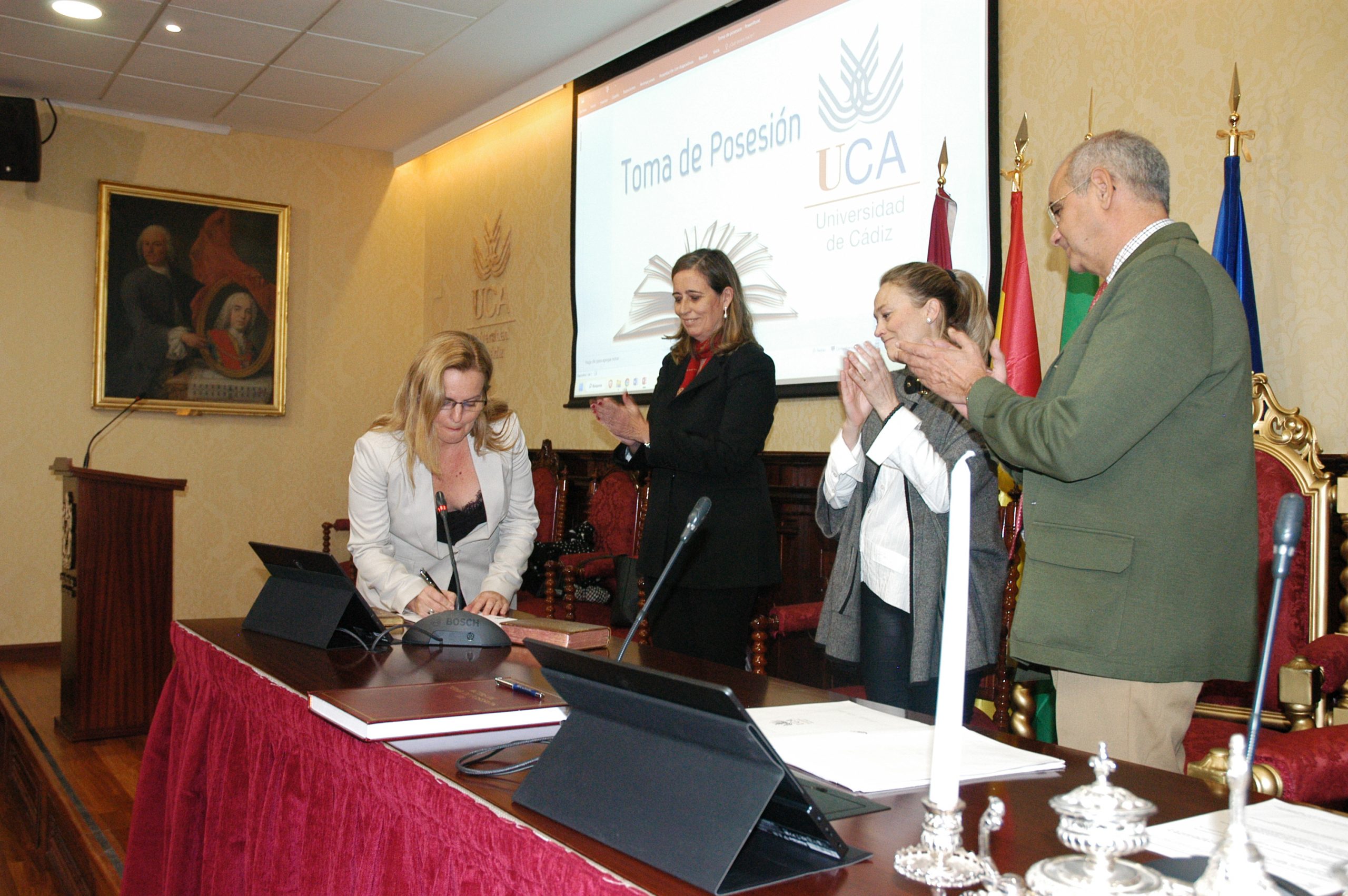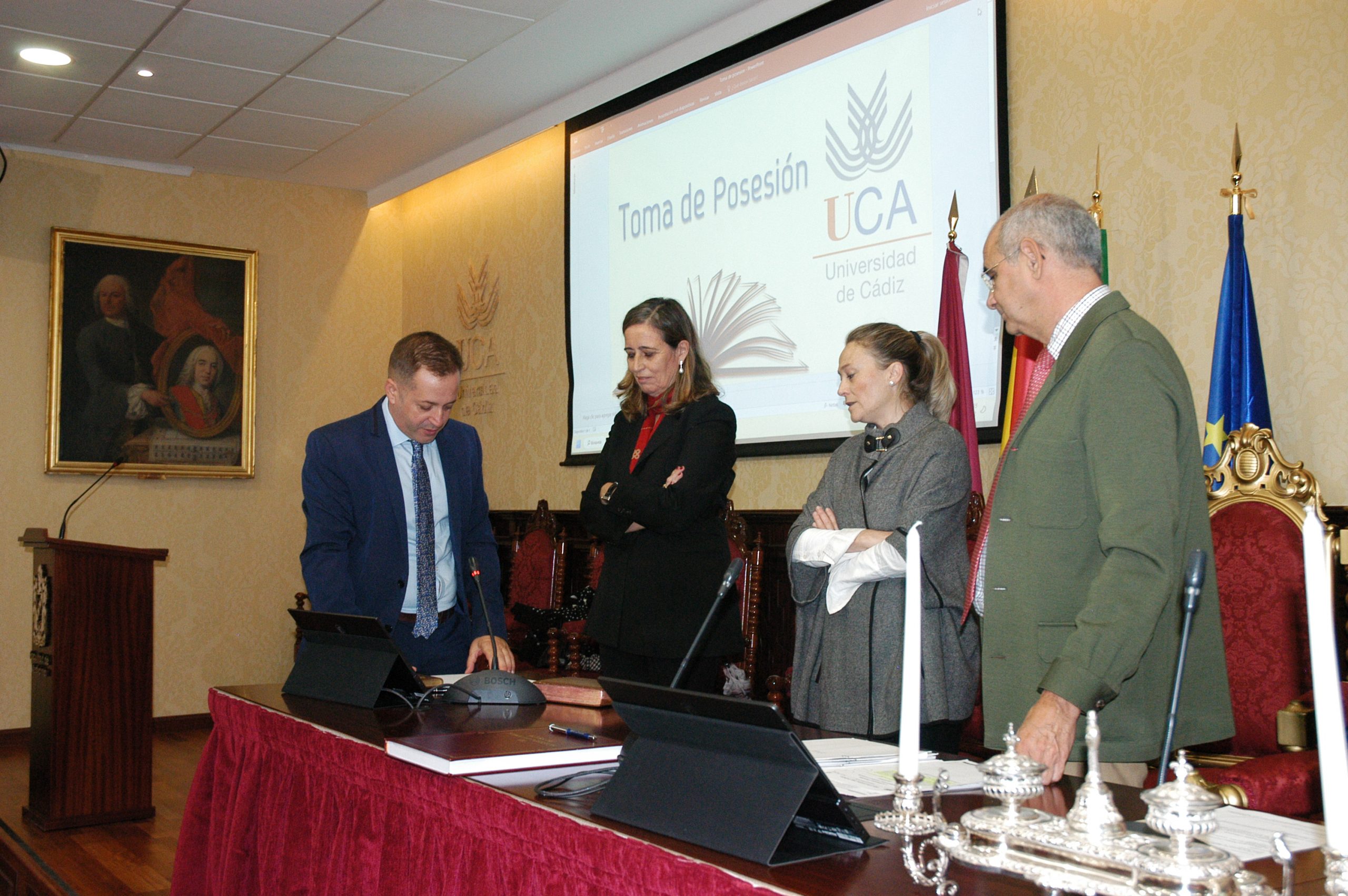 La vicerrectora de Política Científica y Tecnológica de la Universidad de Cádiz, Mª Jesús Mosquera, junto a la gerente, Mariví Martínez, y el secretario General, José Justo Megías, ha presidido hoy la toma de posesión de funcionarios, cargo académico y catedráticos de Universidad en el salón de Grados de la Facultad de Medicina.