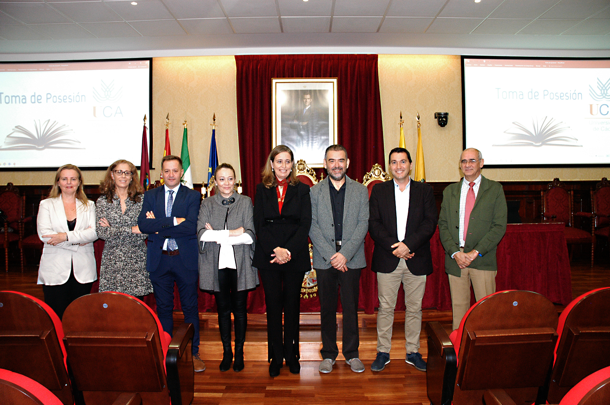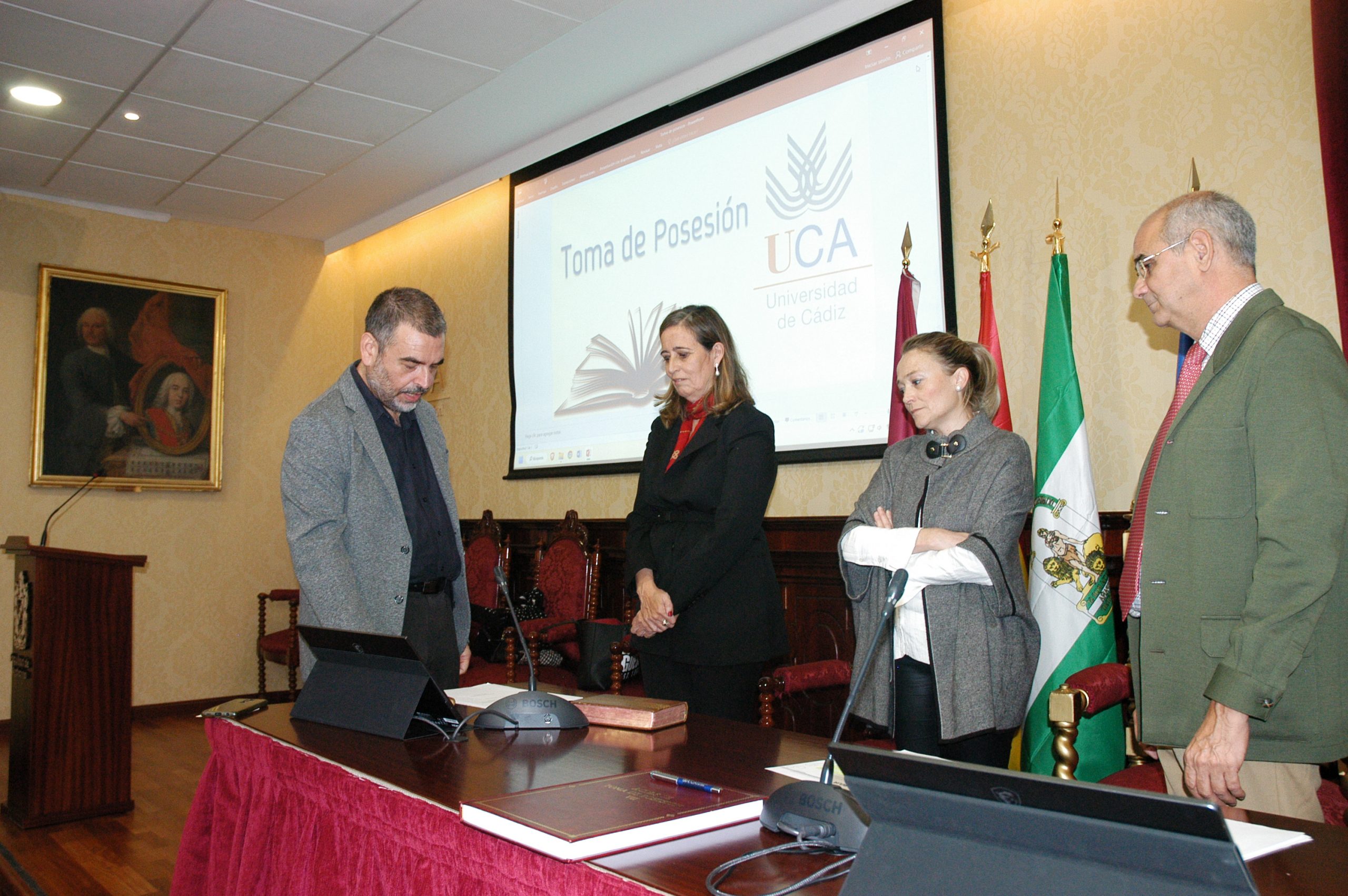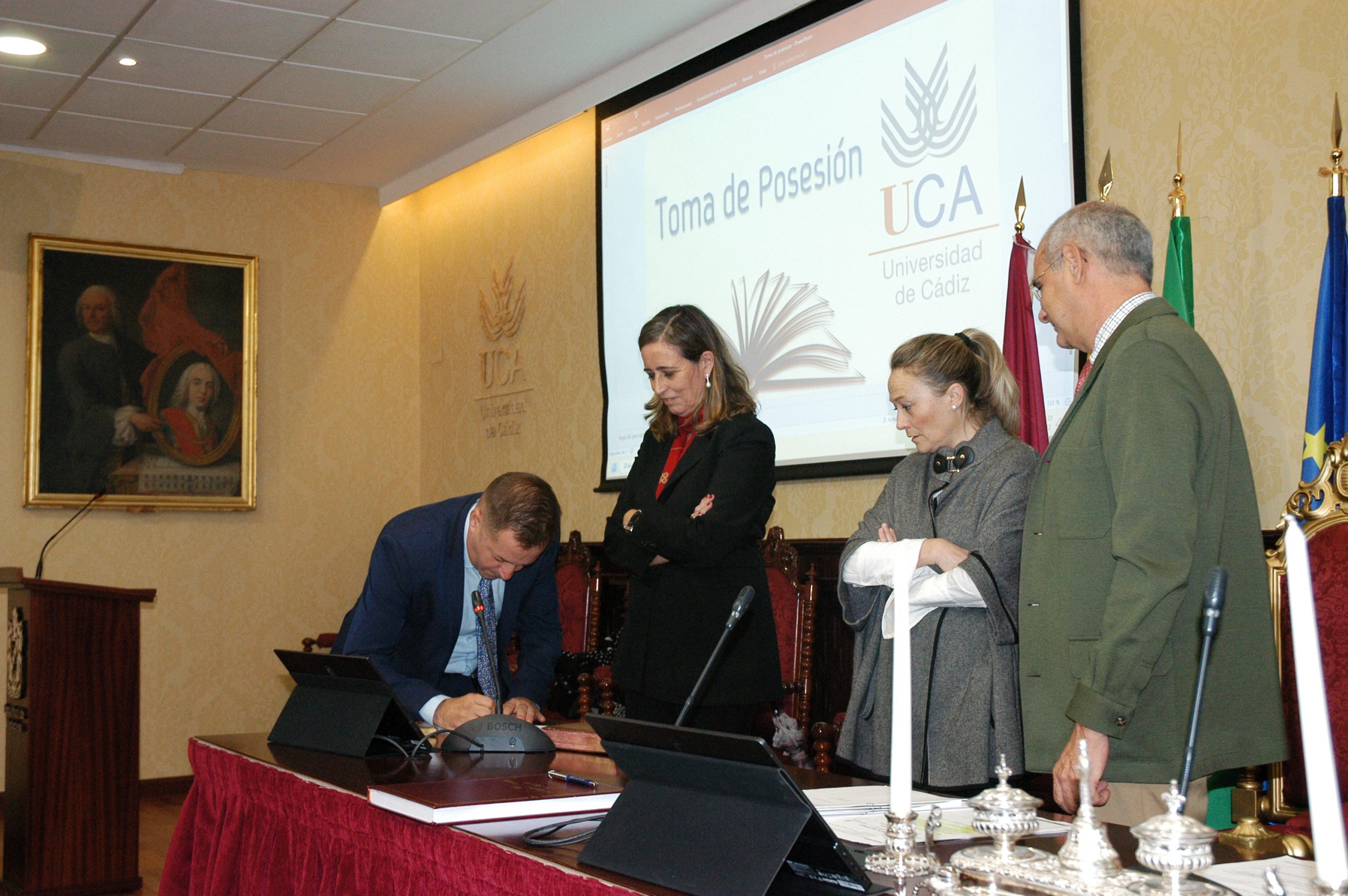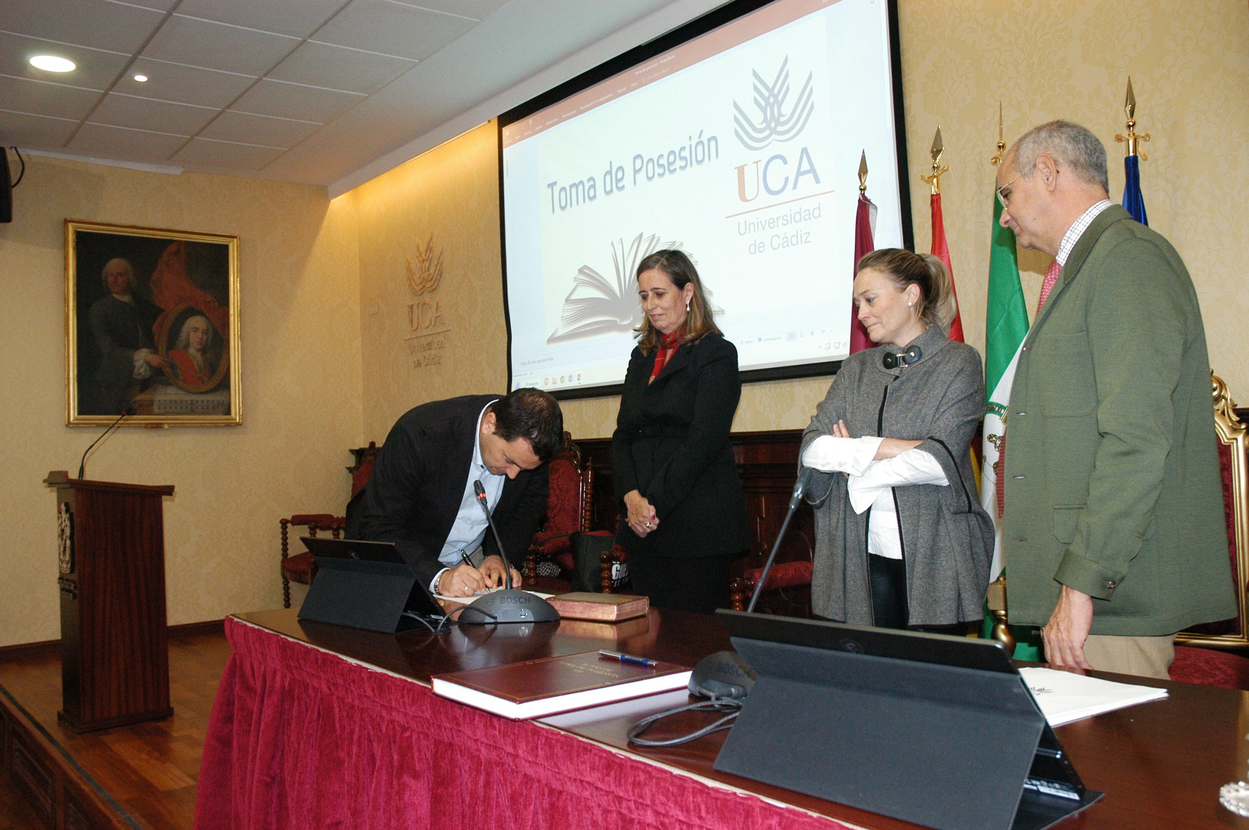 La vicerrectora de Política Científica y Tecnológica de la Universidad de Cádiz, Mª Jesús Mosquera, junto a la gerente, Mariví Martínez, y el secretario General, José Justo Megías, ha presidido hoy la toma de posesión de funcionarios, cargo académico y catedráticos de Universidad en el salón de Grados de la Facultad de Medicina.