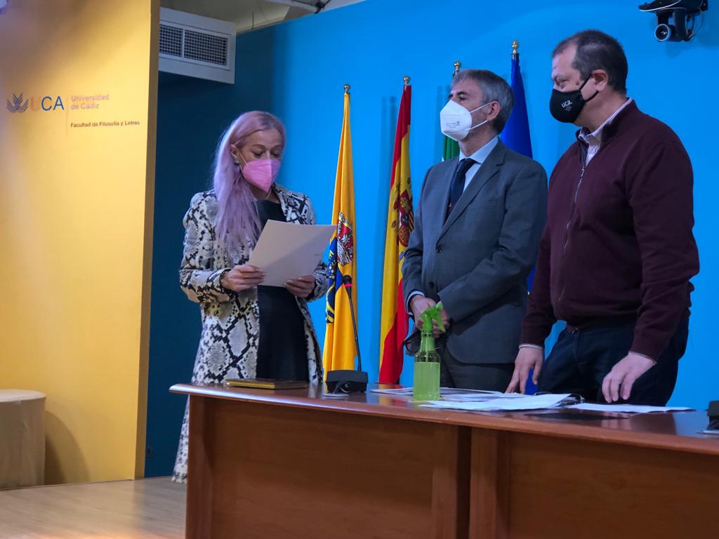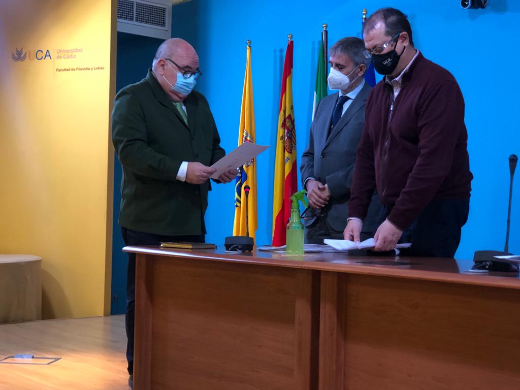 El rector de la Universidad de Cádiz, Francisco Piniella, junto con el secretario General, Severiano Fernández, y la gerente de la UCA, Mariví Martínez, ha presidido hoy, en el aula Magna de la Facultad de Filosofía y Letras, la toma de posesión de dos catedráticos, nueve profesores-as titulares, tres funcionarias de Gestión Universitaria y un cargo académico.