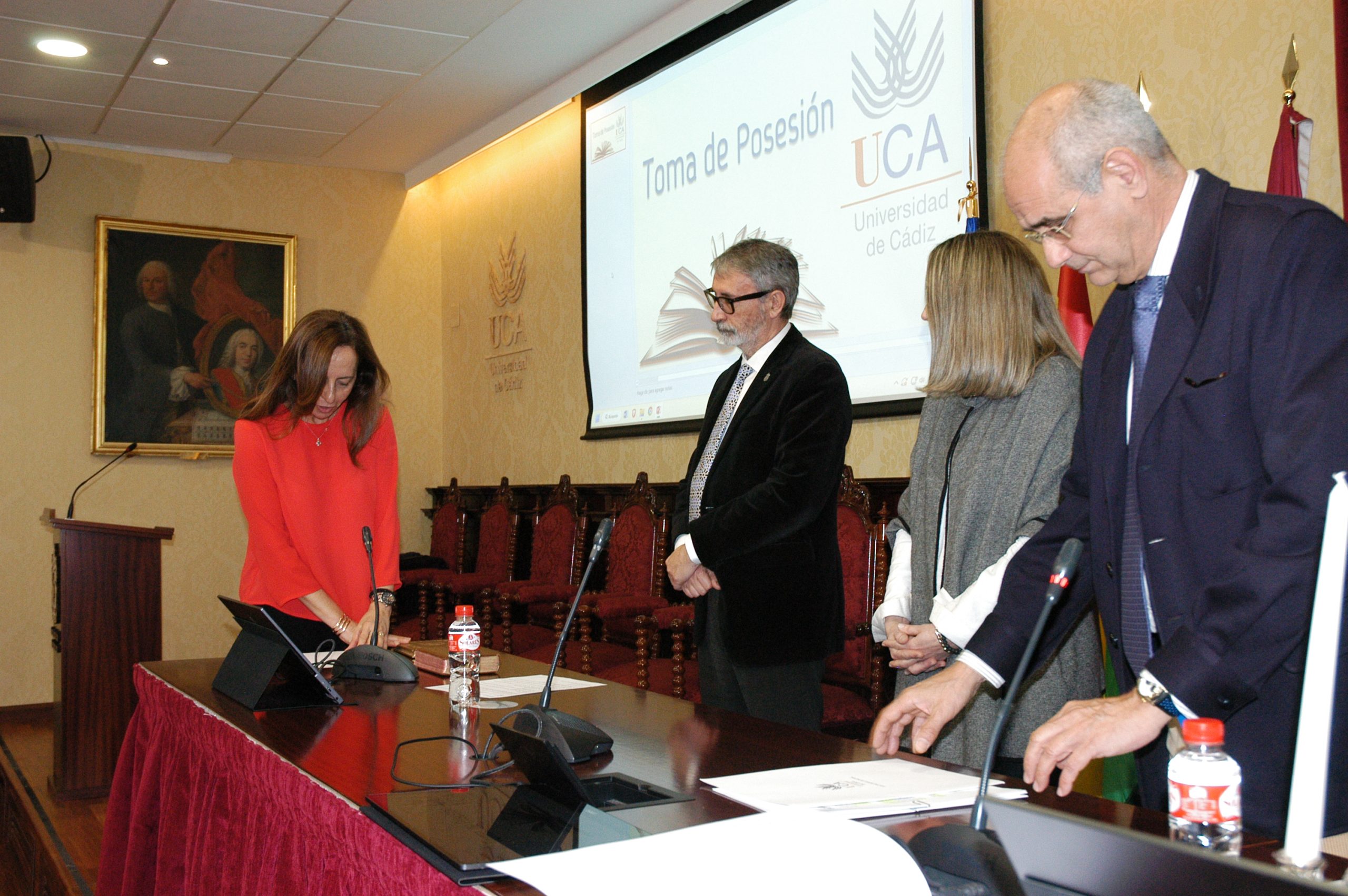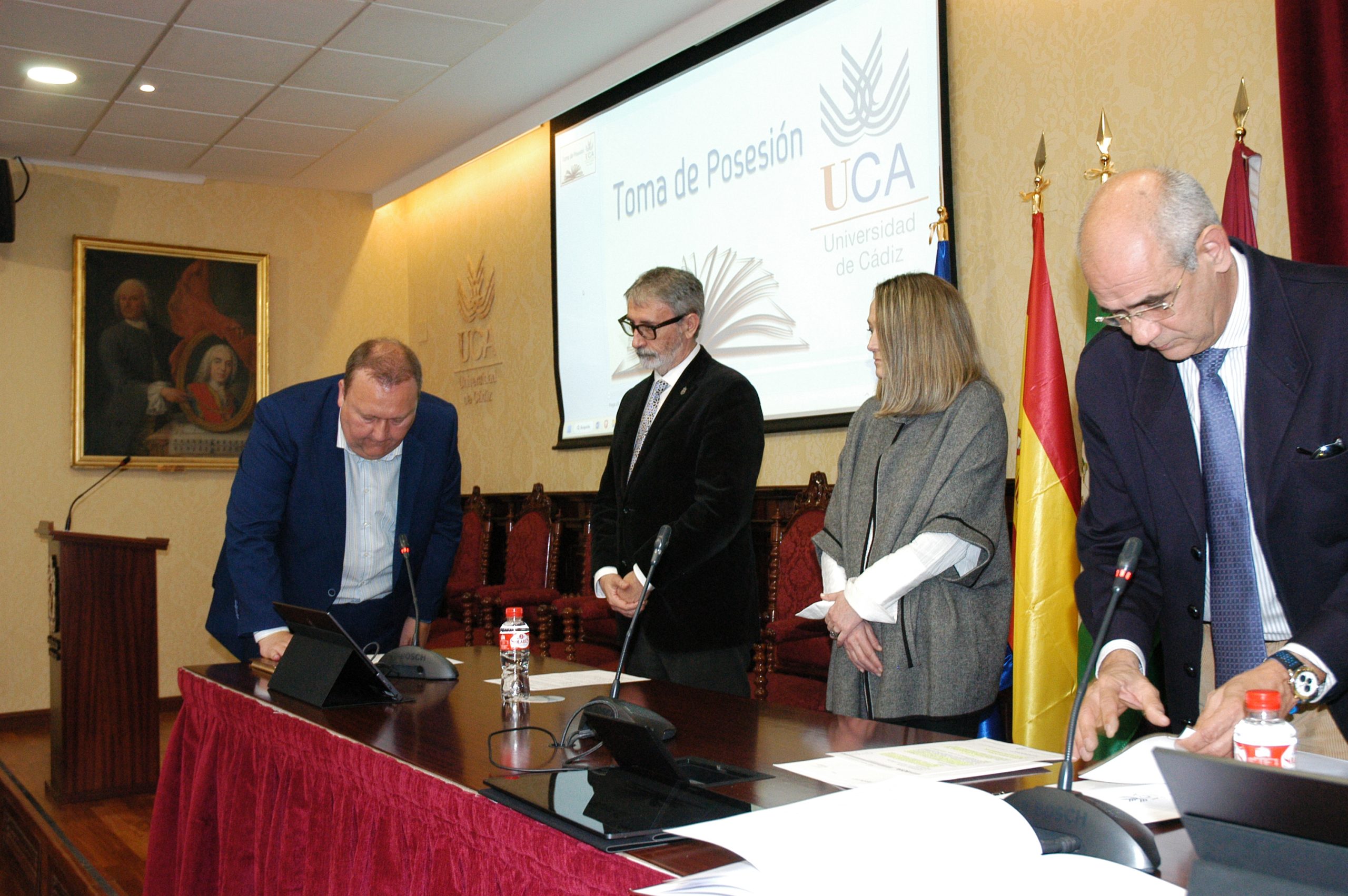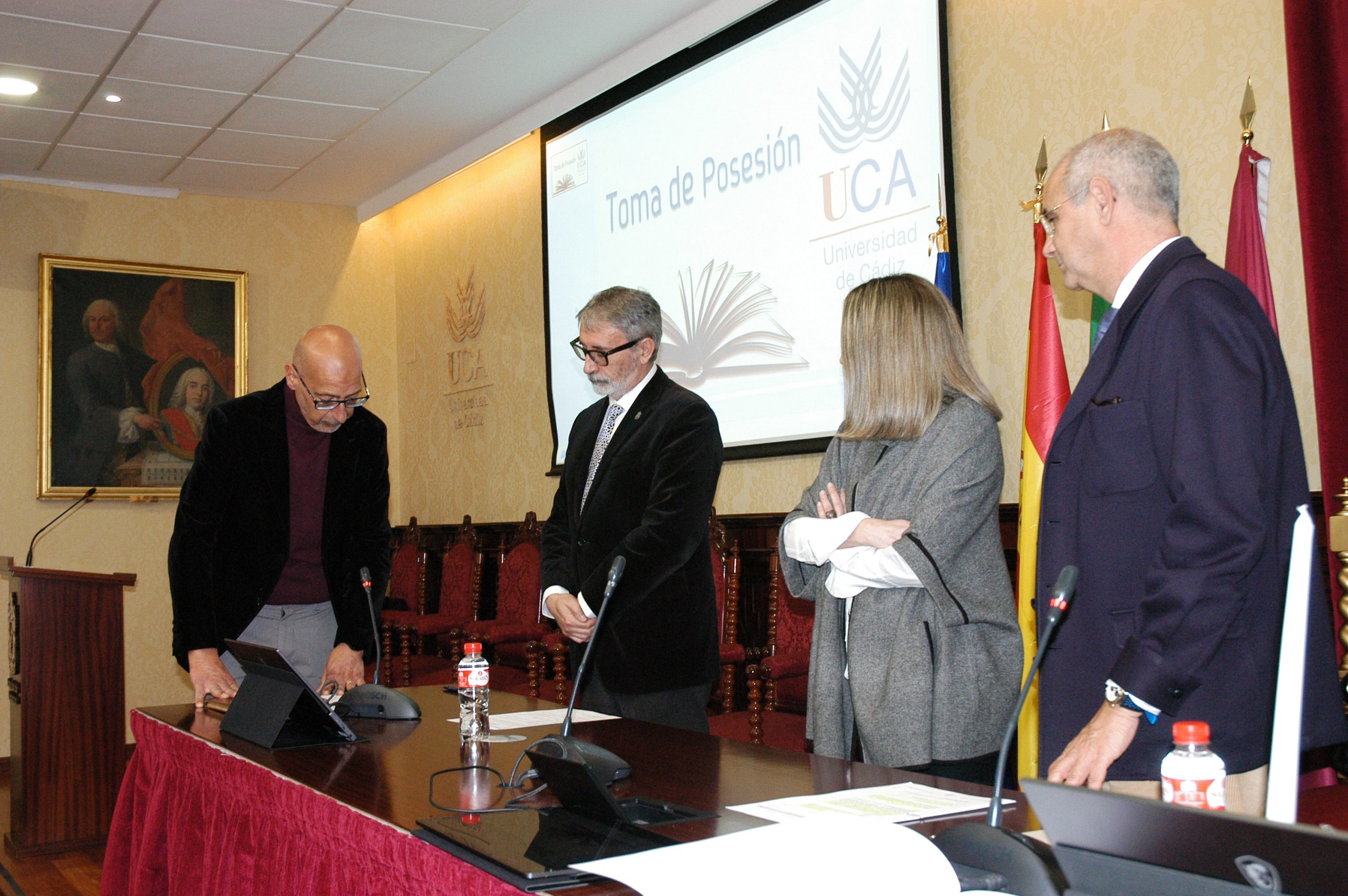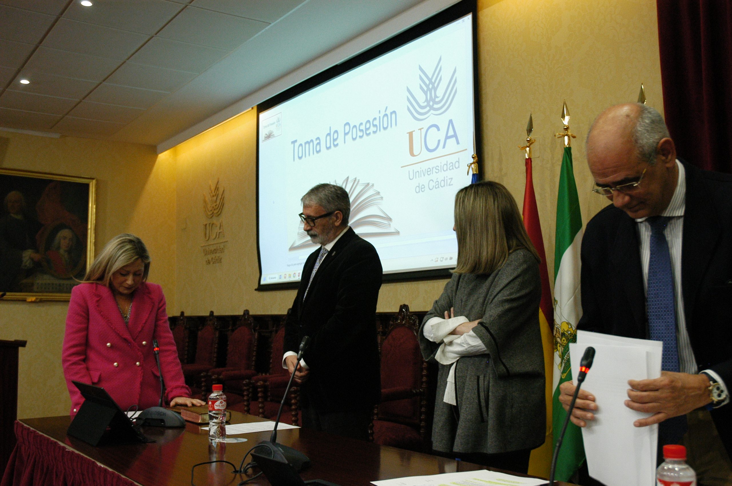 El rector de la Universidad de Cádiz, Francisco Piniella, en compañía del secretario General, José Justo Megías, y la gerente, Mariví Martínez, ha presidido hoy la toma de posesión de dos catedráticas y cuatro funcionarios del Personal de Administración y Servicios en el salón de Grados de la Facultad de Medicina.
