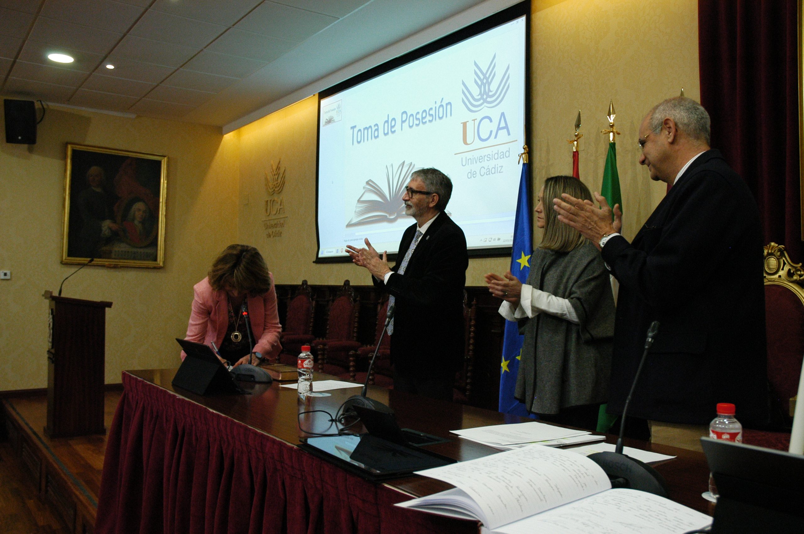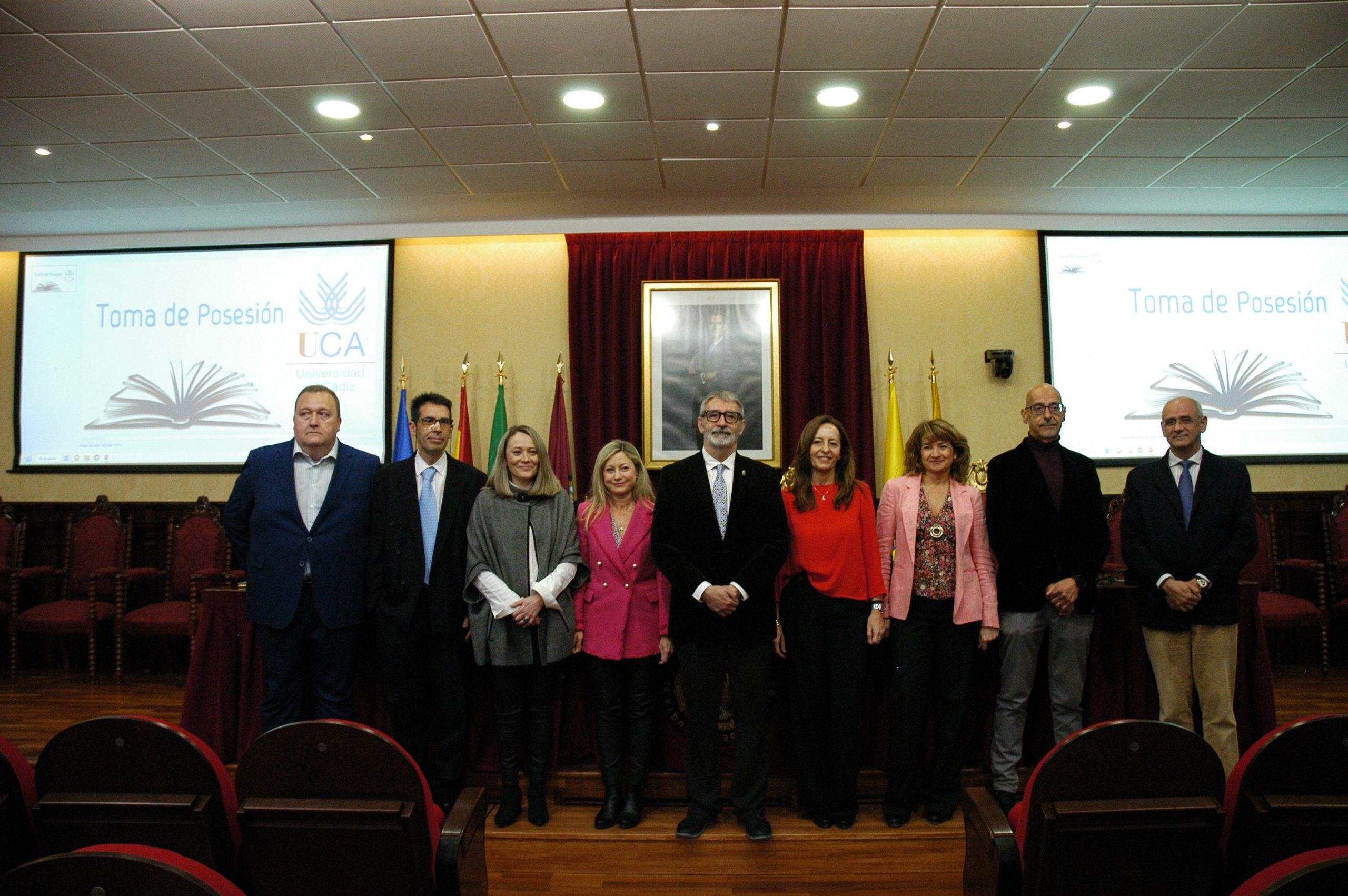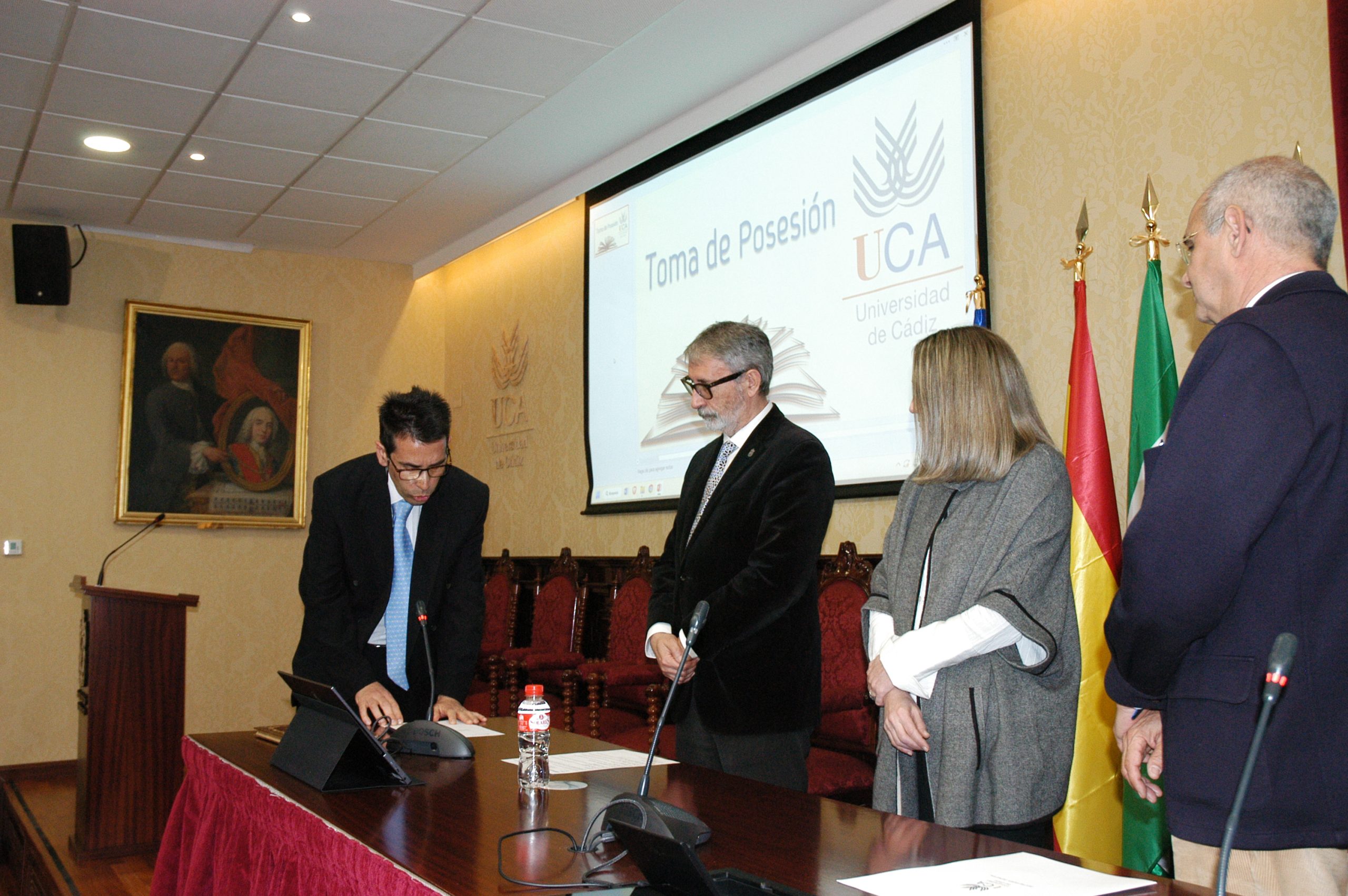 El rector de la Universidad de Cádiz, Francisco Piniella, en compañía del secretario General, José Justo Megías, y la gerente, Mariví Martínez, ha presidido hoy la toma de posesión de dos catedráticas y cuatro funcionarios del Personal de Administración y Servicios en el salón de Grados de la Facultad de Medicina.