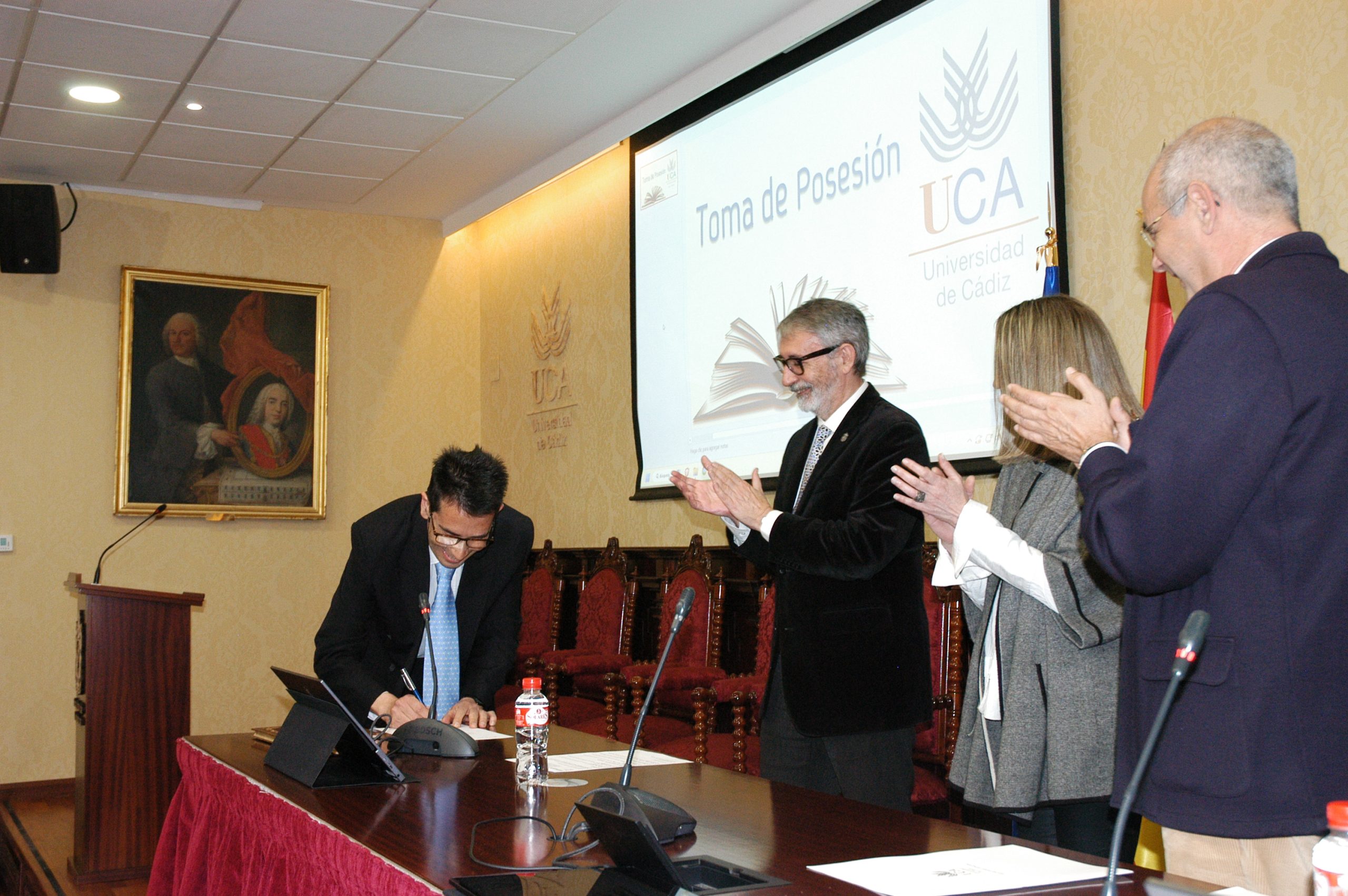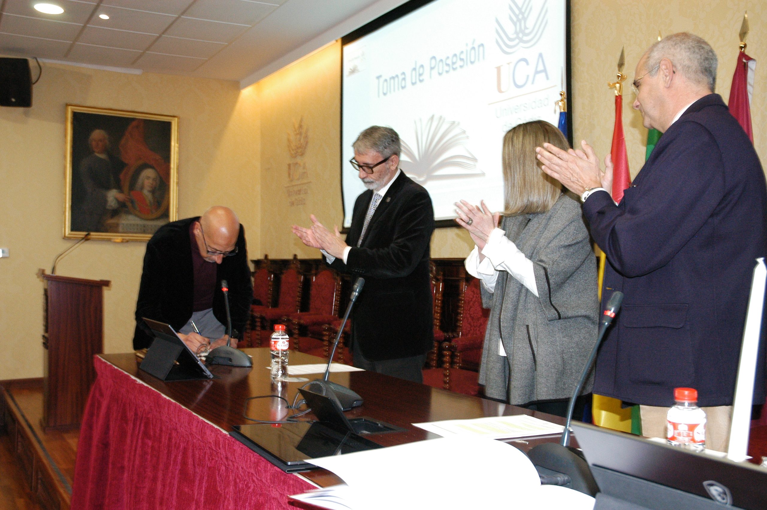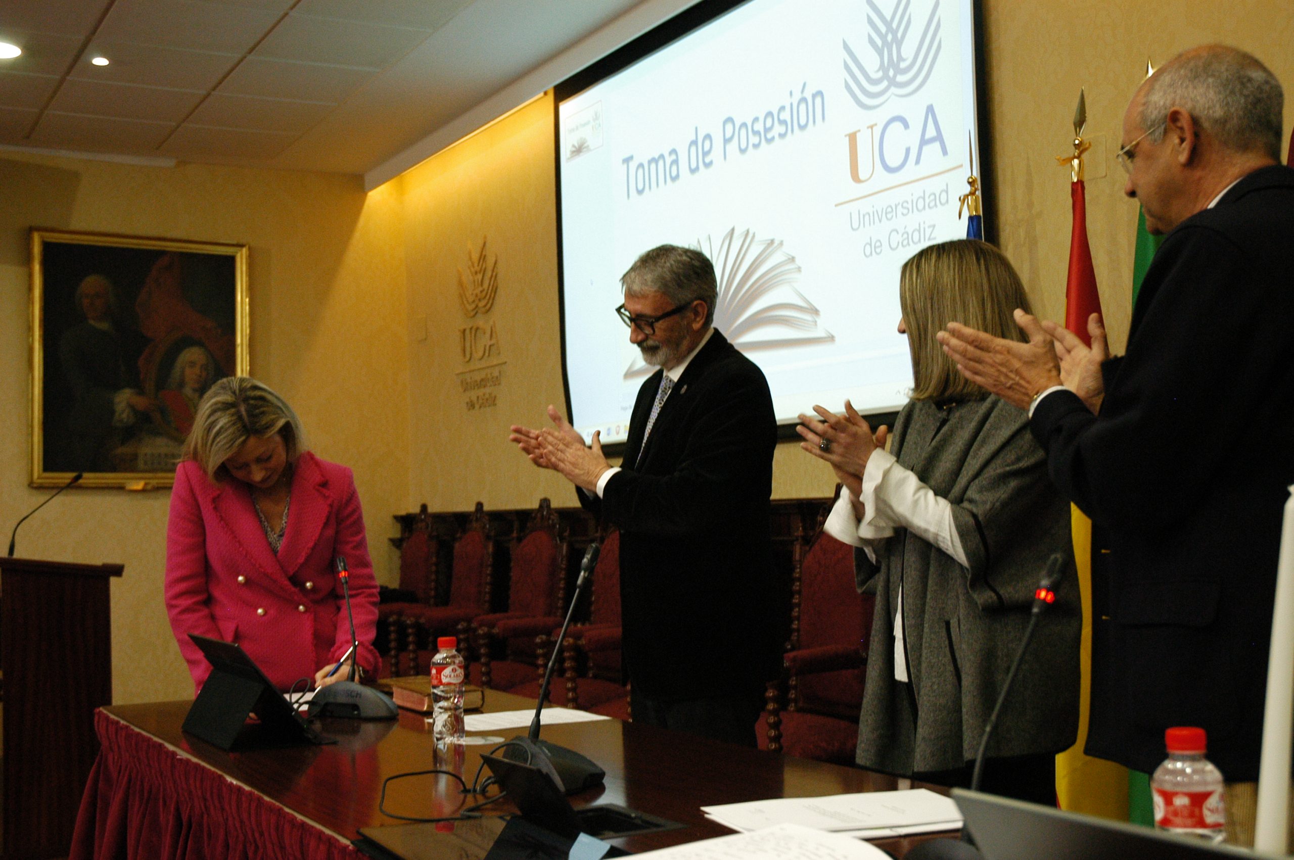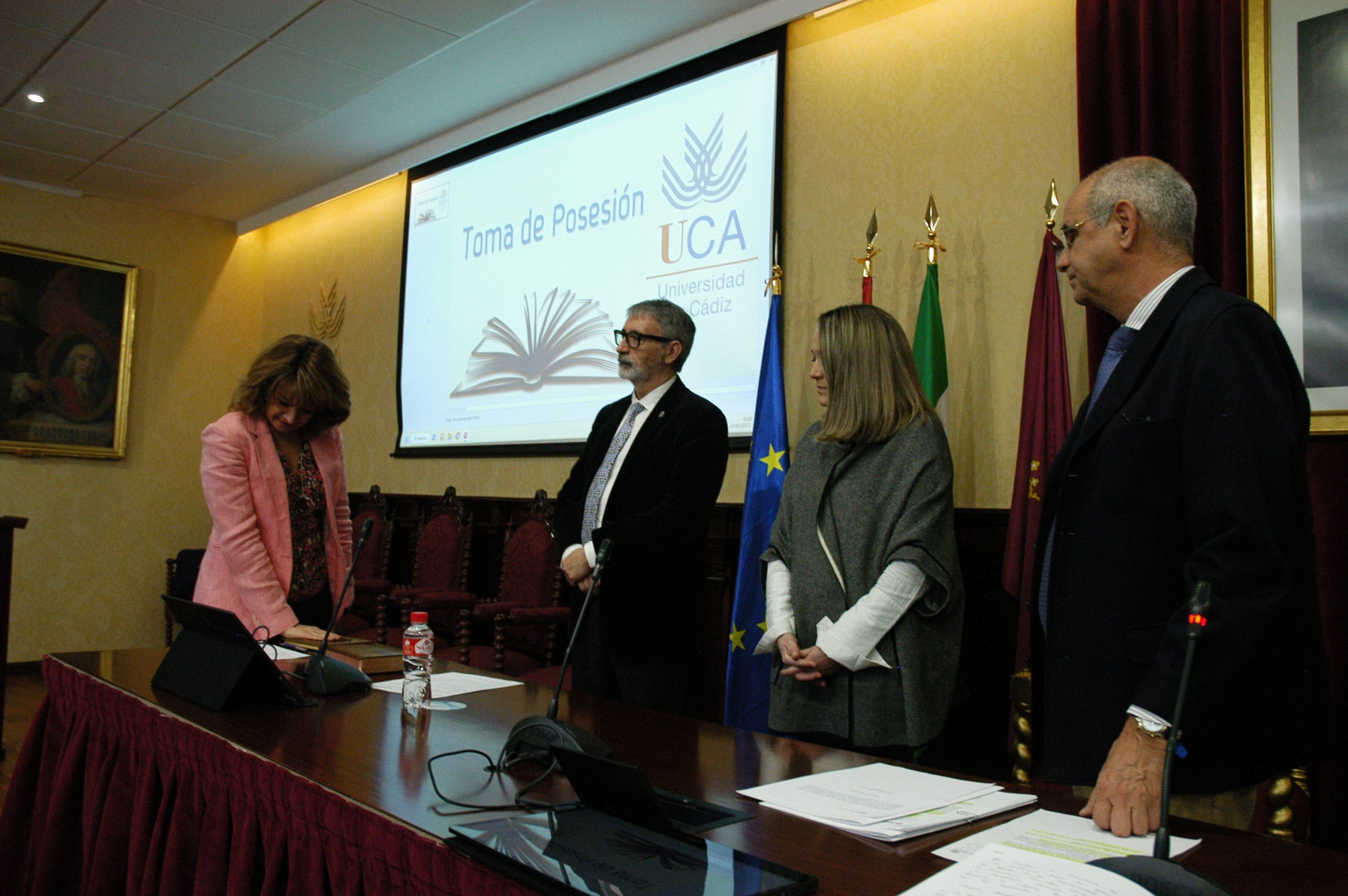 El rector de la Universidad de Cádiz, Francisco Piniella, en compañía del secretario General, José Justo Megías, y la gerente, Mariví Martínez, ha presidido hoy la toma de posesión de dos catedráticas y cuatro funcionarios del Personal de Administración y Servicios en el salón de Grados de la Facultad de Medicina.
