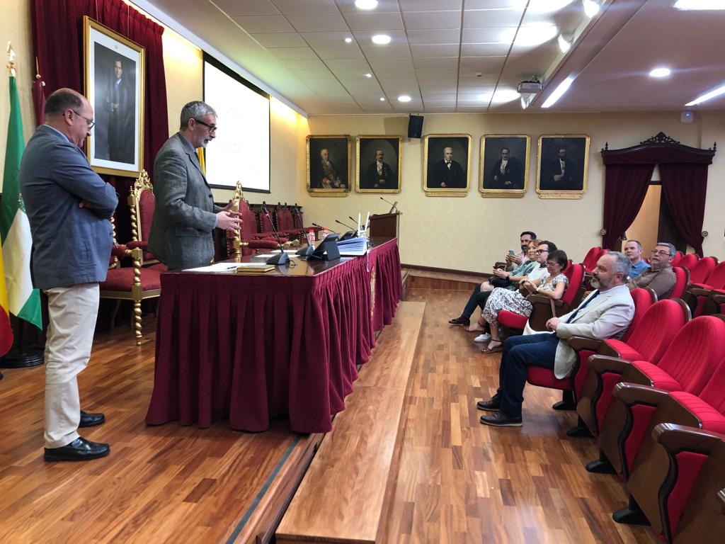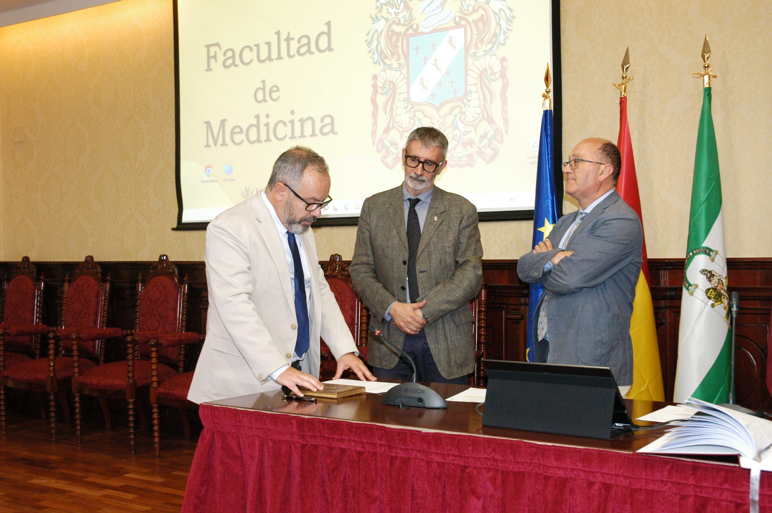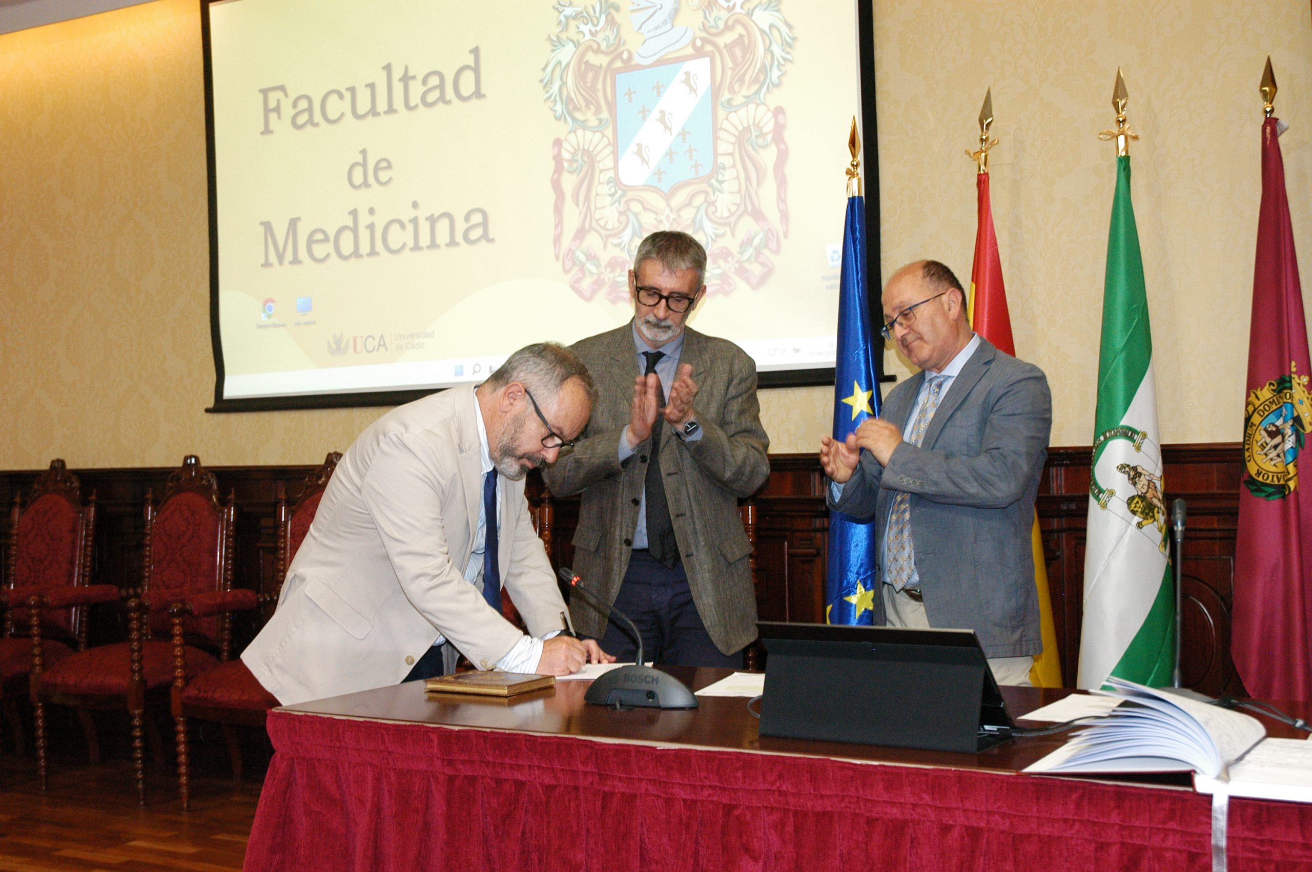 El rector de la Universidad de Cádiz, Francisco Piniella, junto con el secretario General en funciones, Manuel Gómez, ha presidido hoy la toma de posesión del profesor y actual vicerrector de Cultura de la Universidad de Cádiz, José María Pérez Monguió, como catedrático de Universidad en el área de Derecho Administrativo. El acto se ha celebrado en el salón de Grados de la Facultad de Medicina en Cádiz.