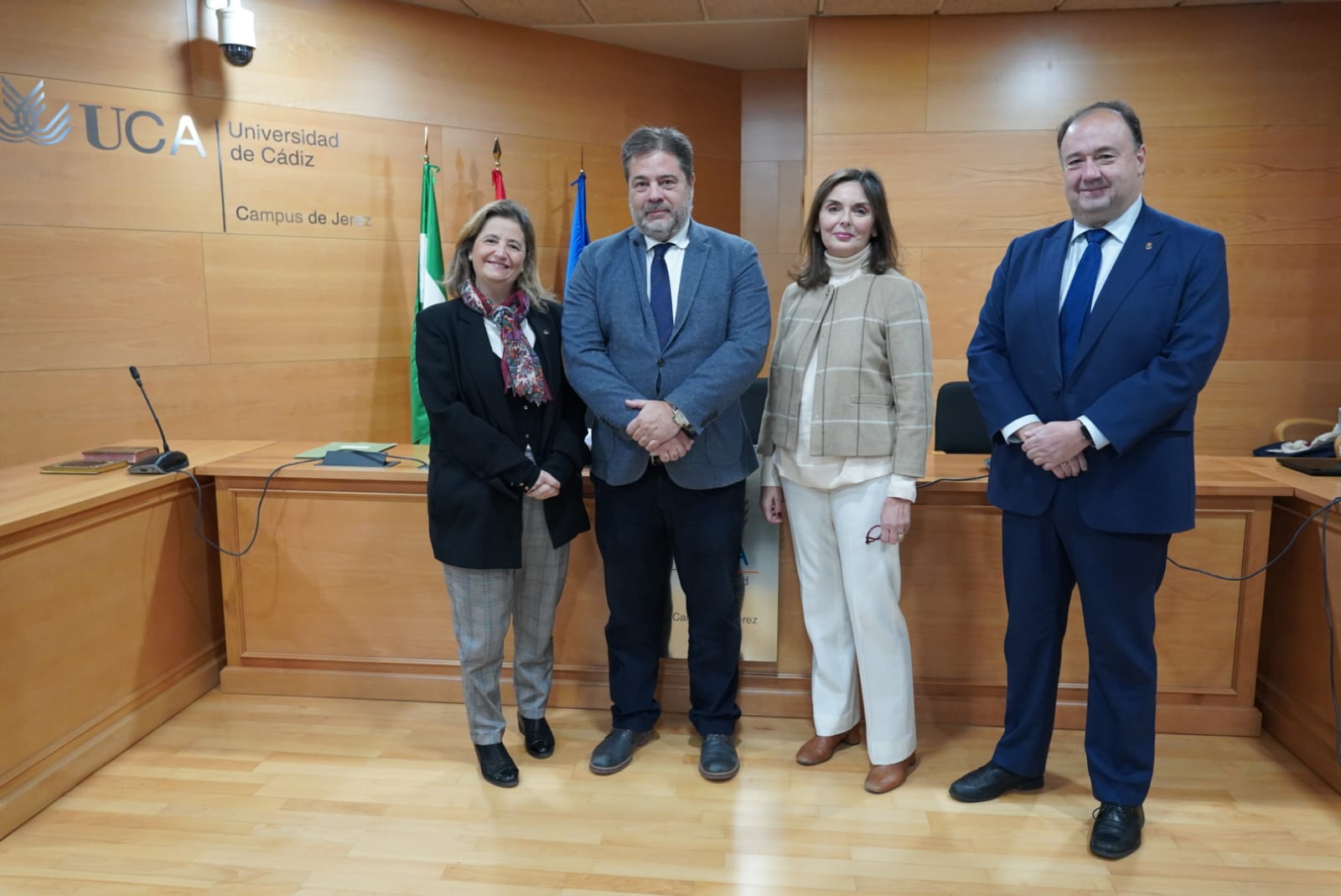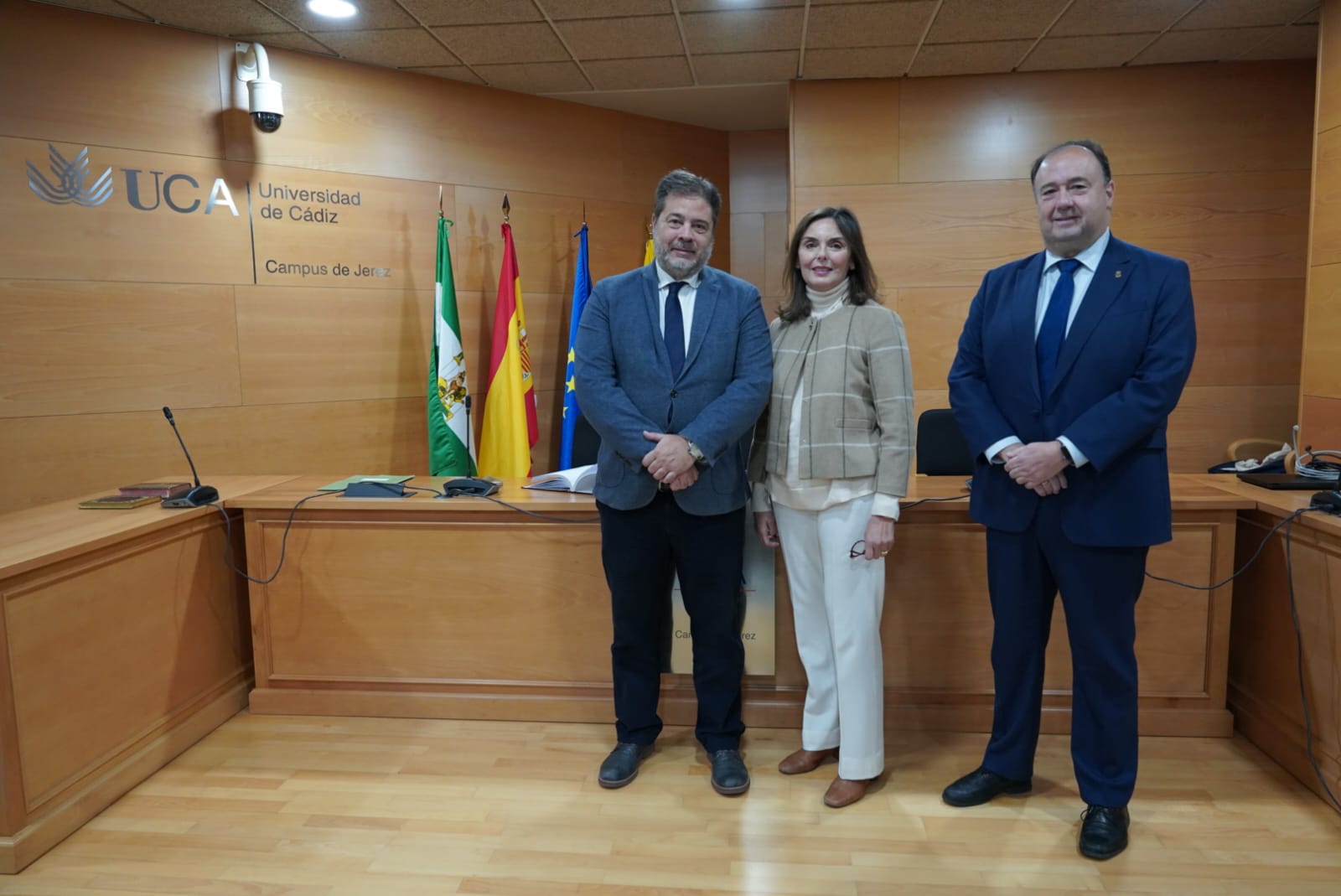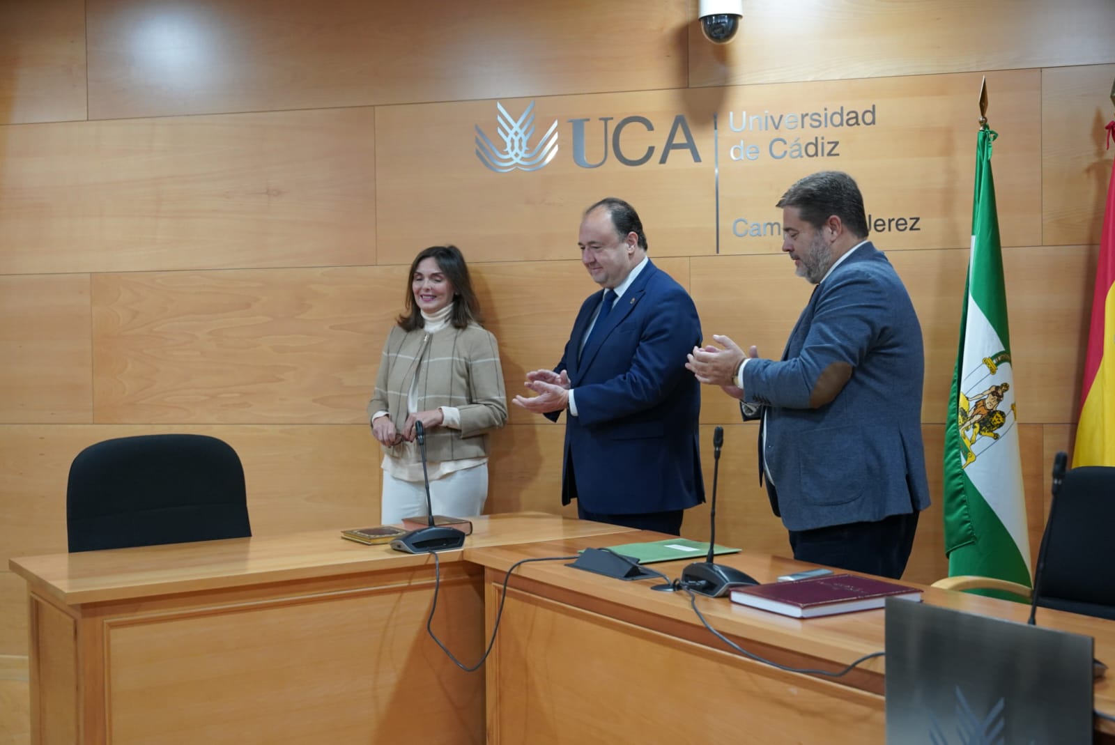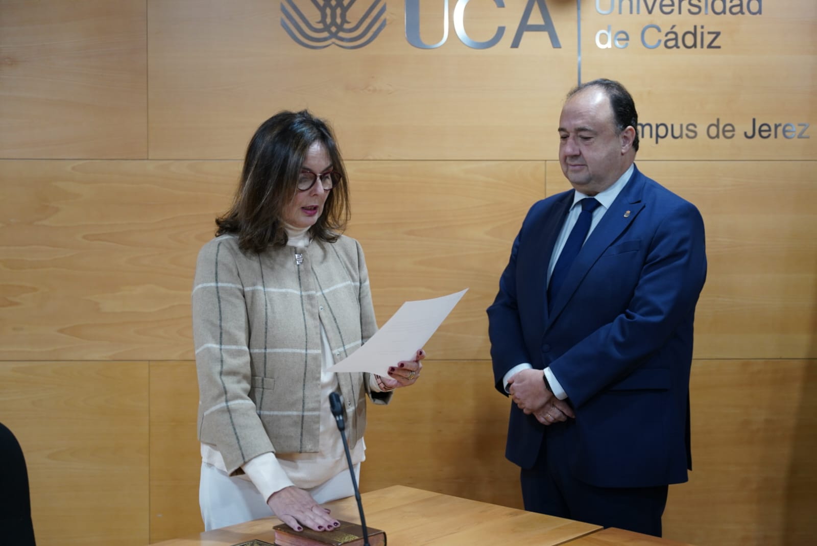 El rector de la Universidad de Cádiz, Casimiro Mantell, junto con el secretario General de la UCA, Manuel Rozados, ha presidido hoy, en el Campus de Jerez, la toma de posesión de la decana de la Facultad de Derecho, Isabel Villar Fuentes.