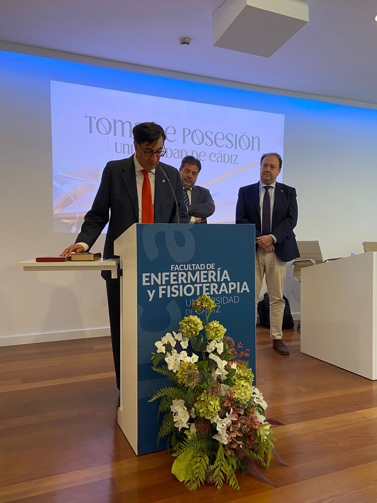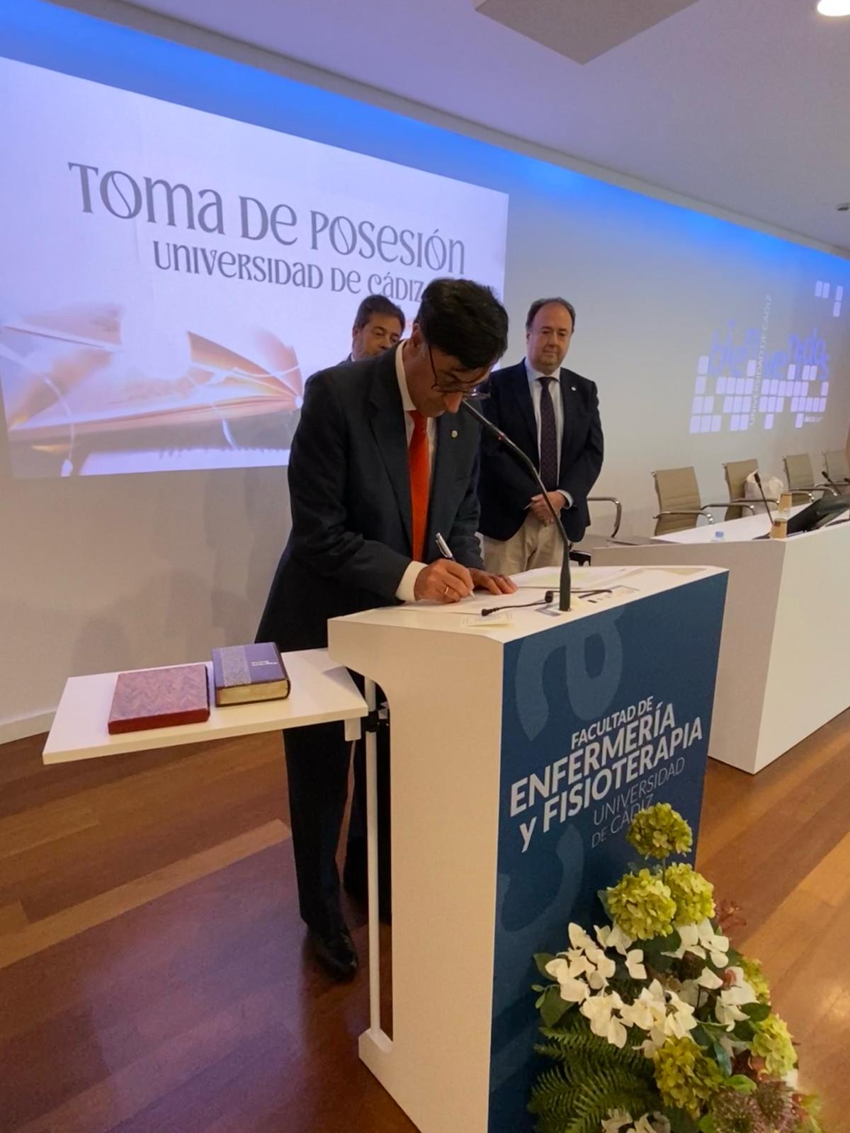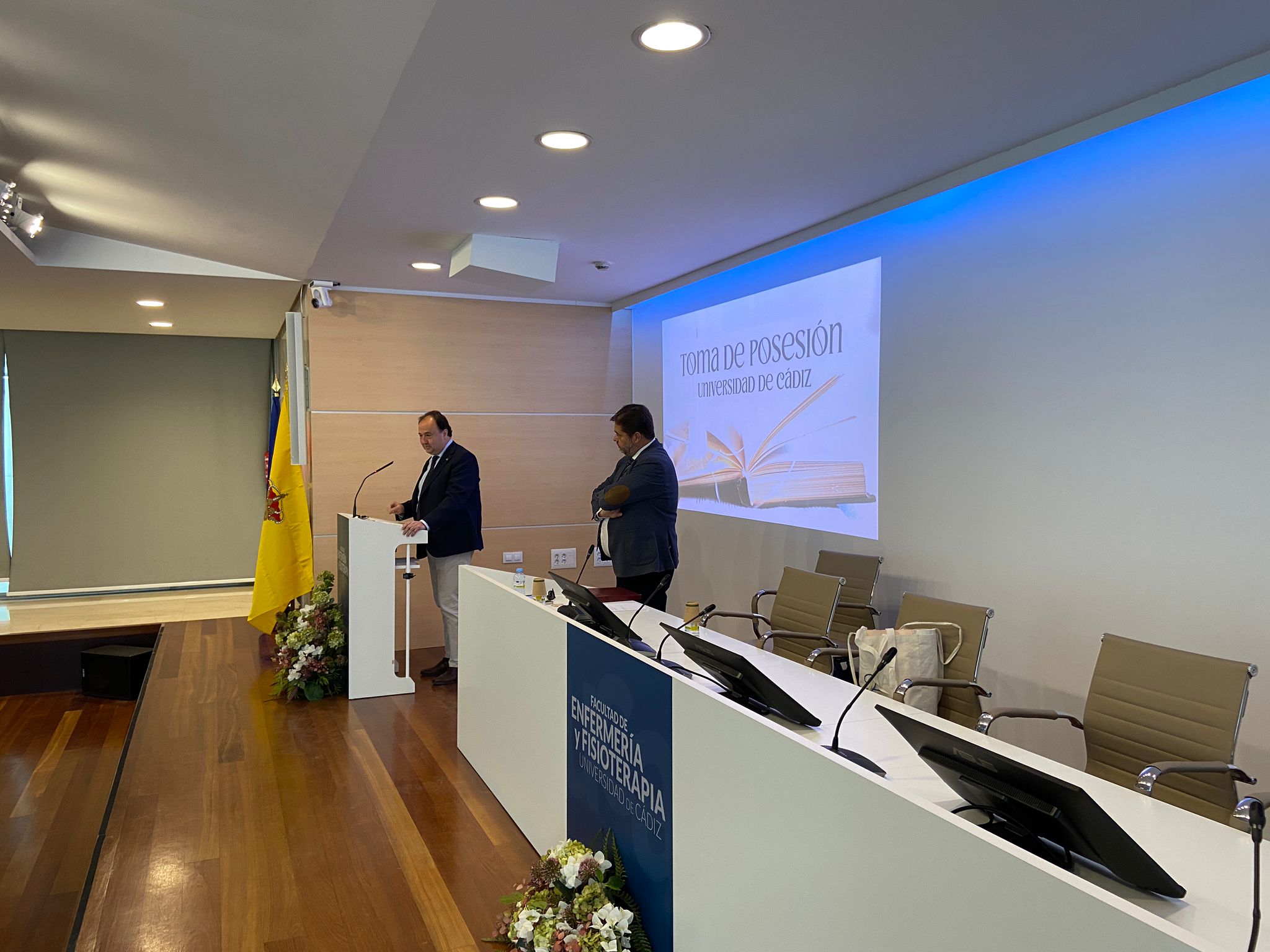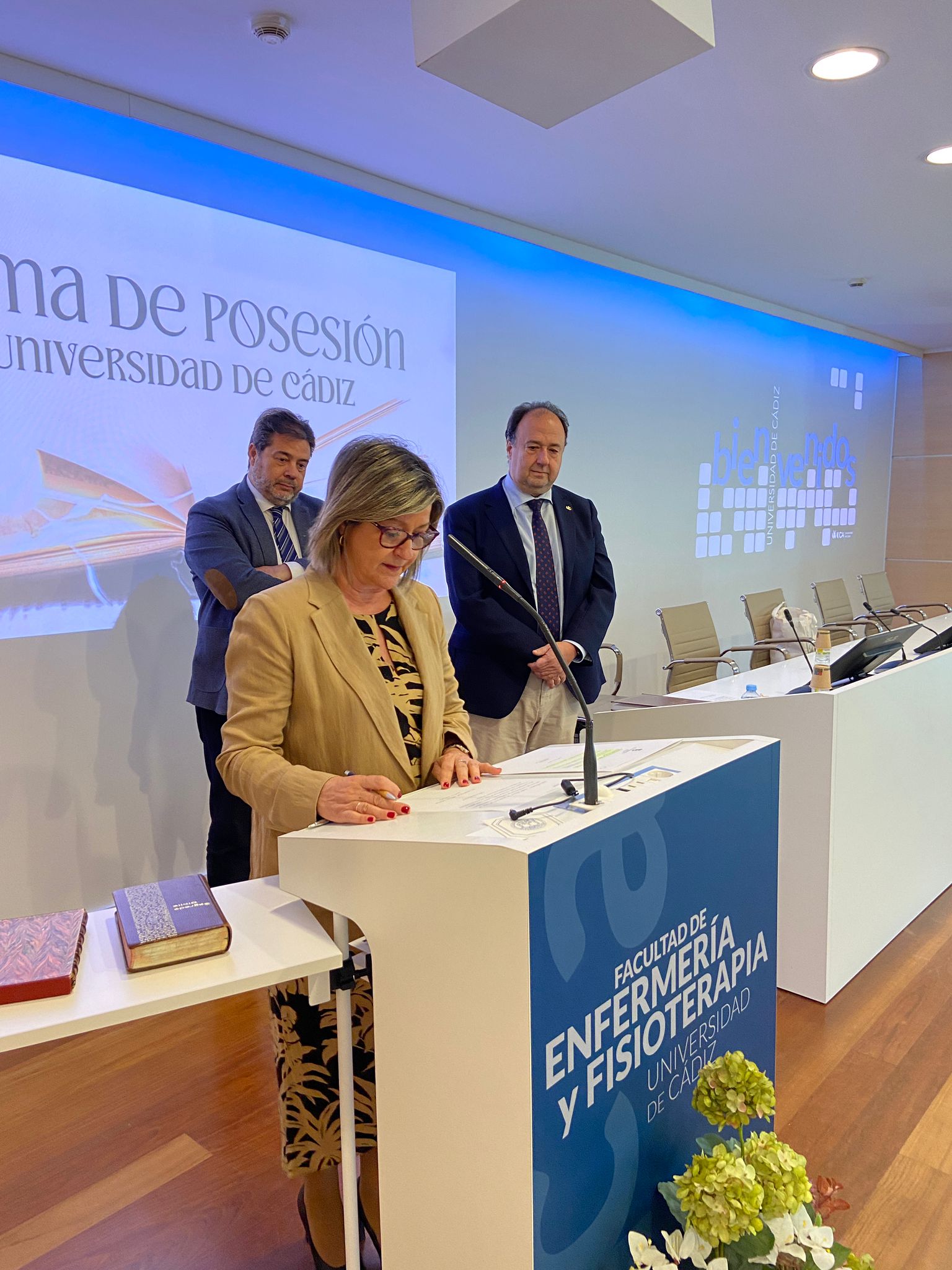 El rector de la Universidad de Cádiz, Casimiro Mantell, en compañía del secretario General, Manuel Rozados, ha presidido hoy la toma de posesión de María José Abellán, que ha jurado/prometido su cargo como decana de la Facultad de Enfermería y Fisioterapia en el salón de actos de esta misma Facultad en el Campus de Cádiz.