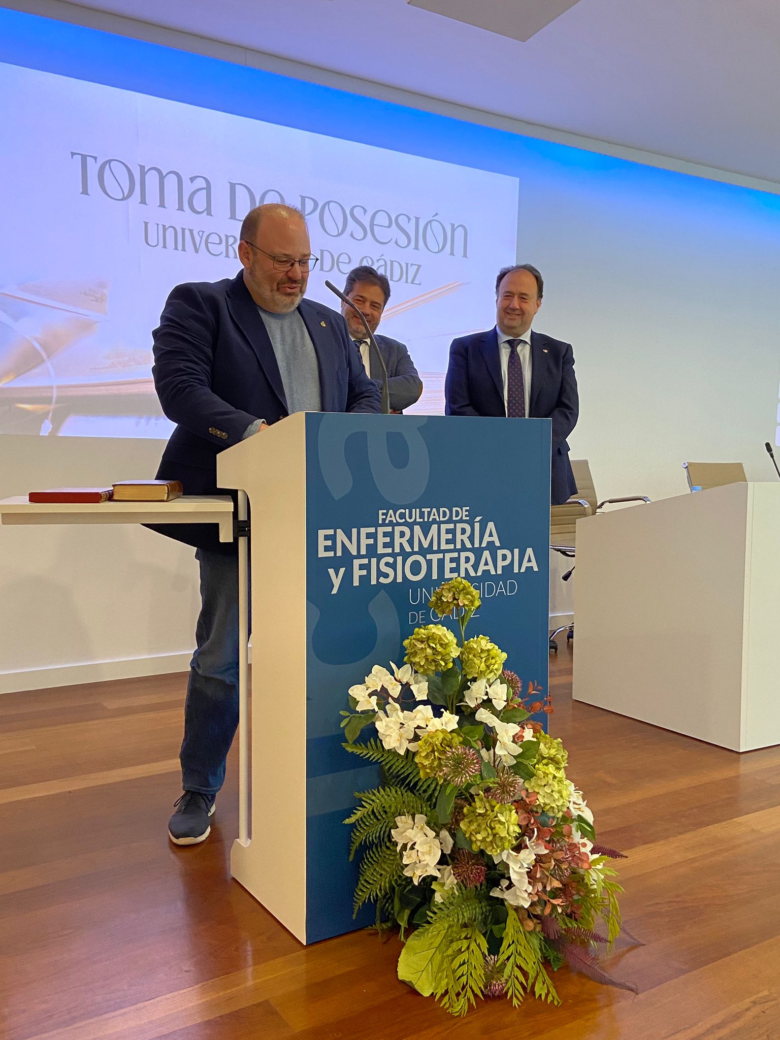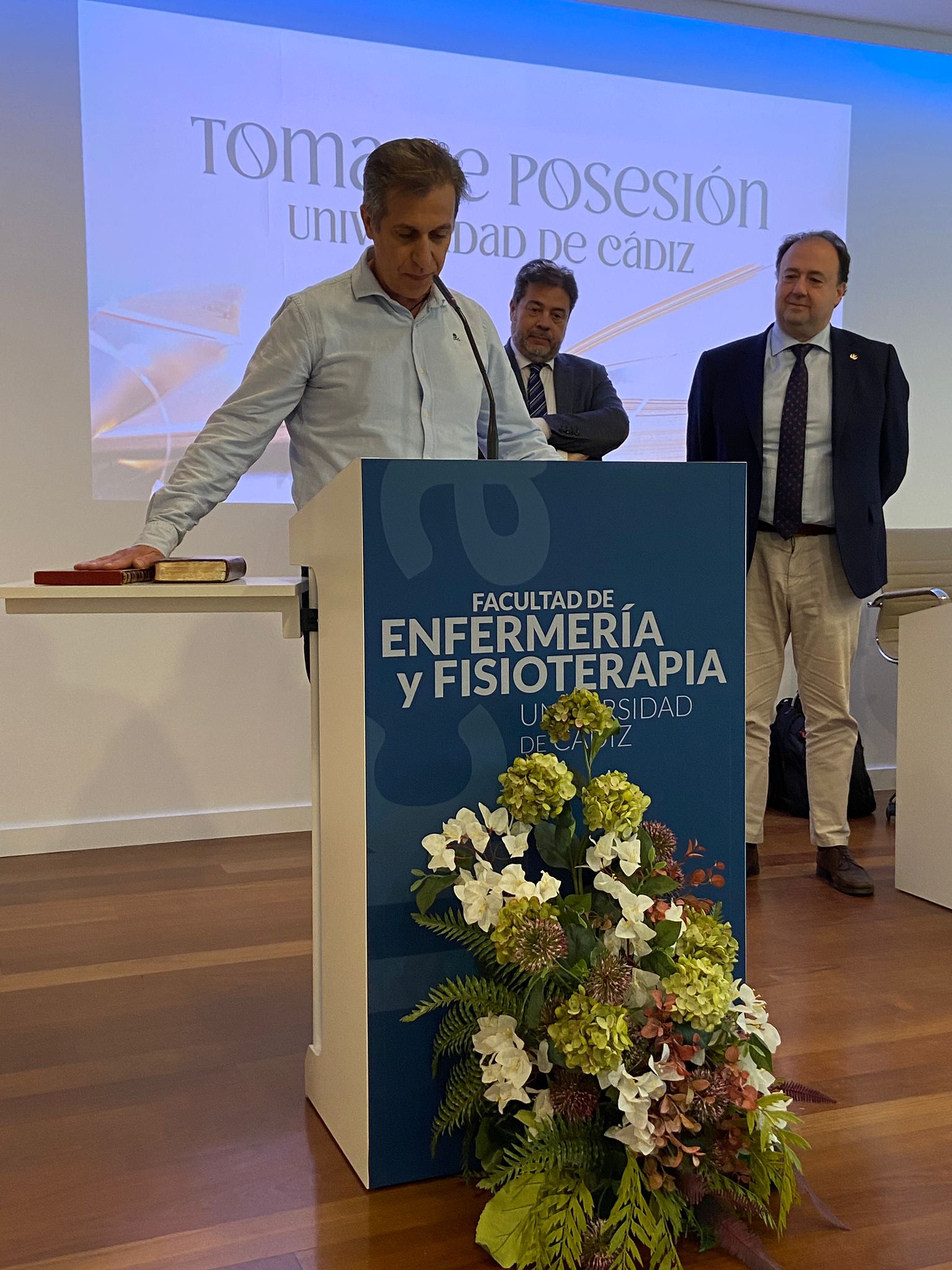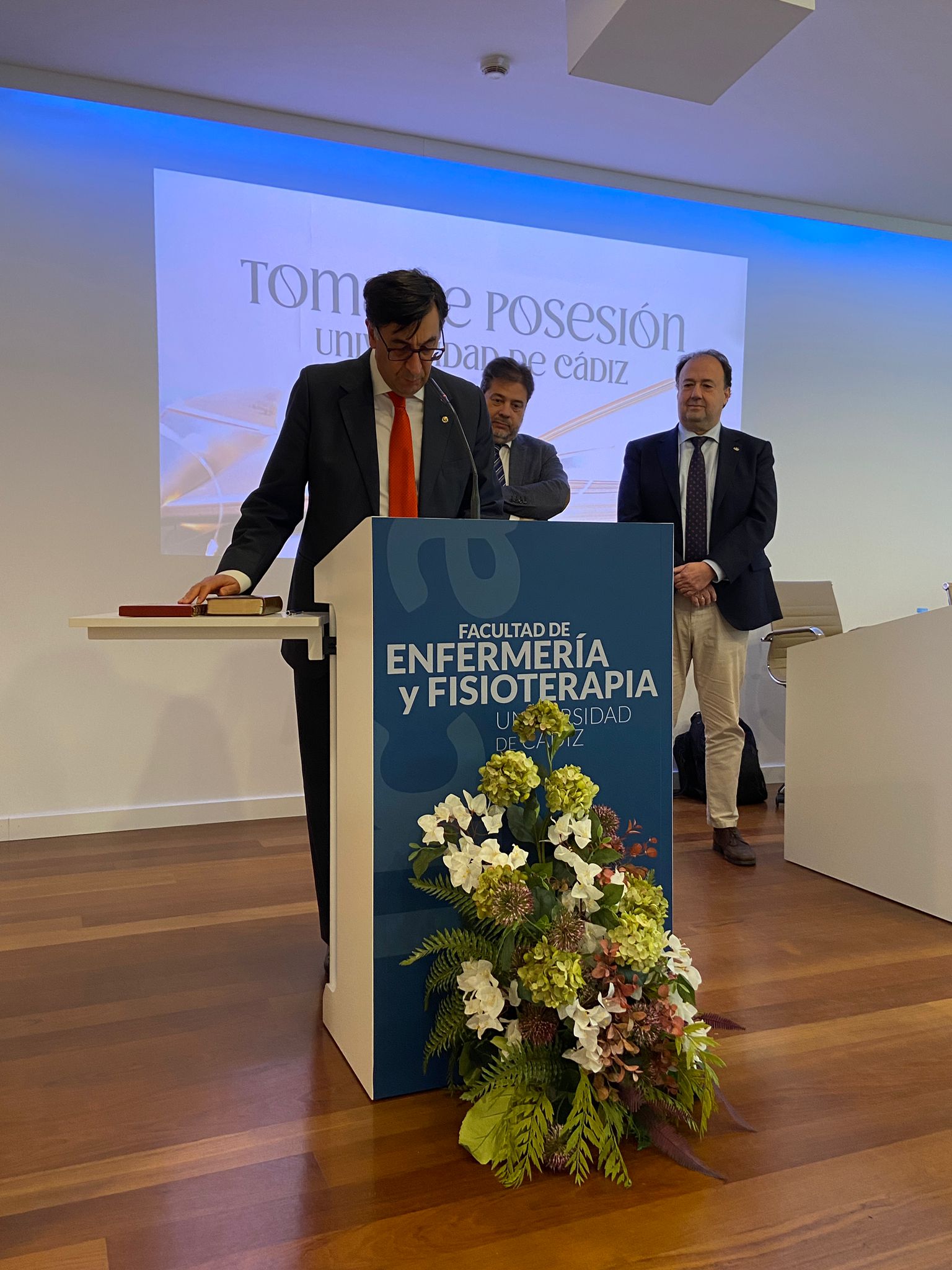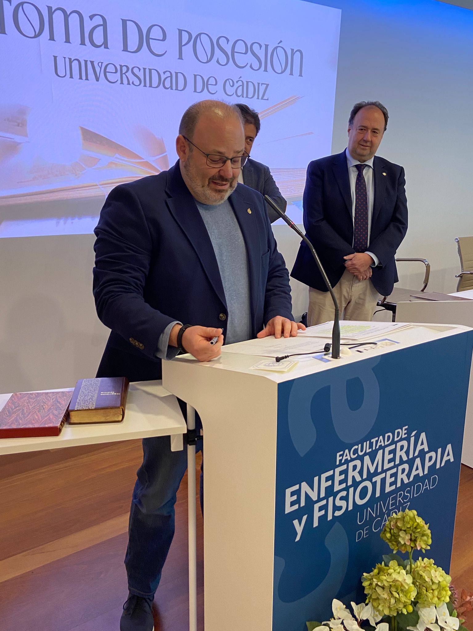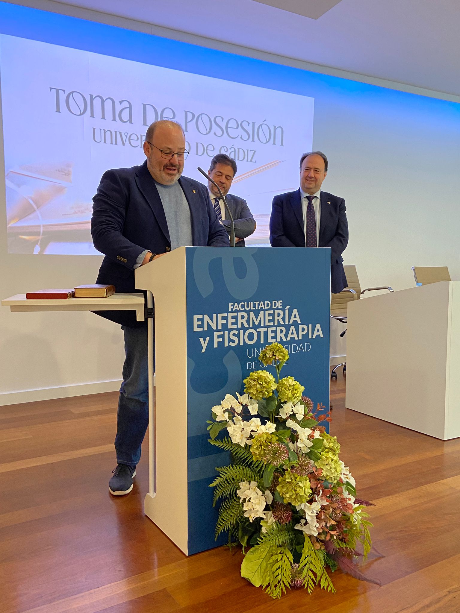 El rector de la Universidad de Cádiz, Casimiro Mantell, en compañía del secretario General, Manuel Rozados, ha presidido hoy la toma de posesión de María José Abellán, que ha jurado/prometido su cargo como decana de la Facultad de Enfermería y Fisioterapia en el salón de actos de esta misma Facultad en el Campus de Cádiz.
