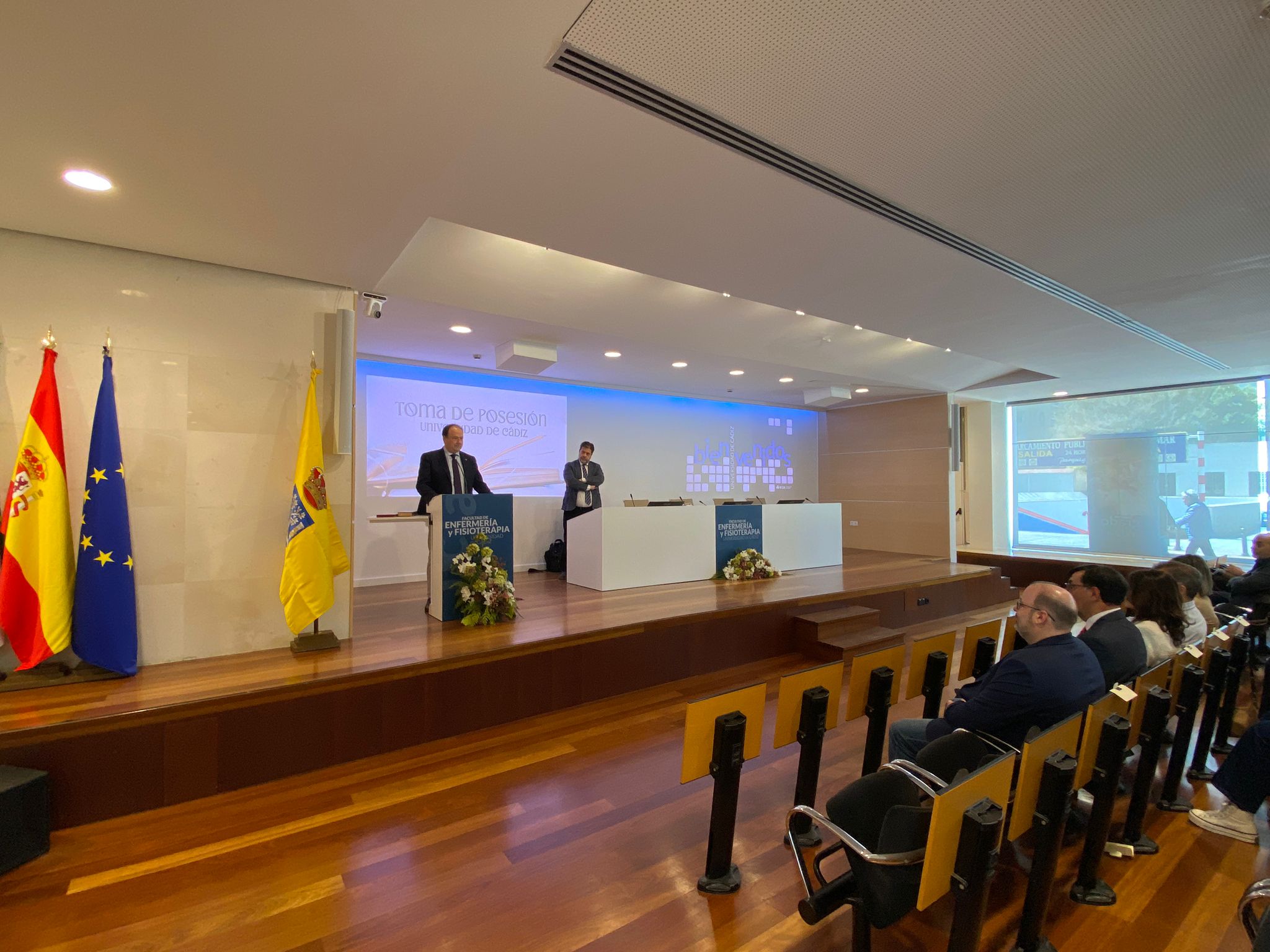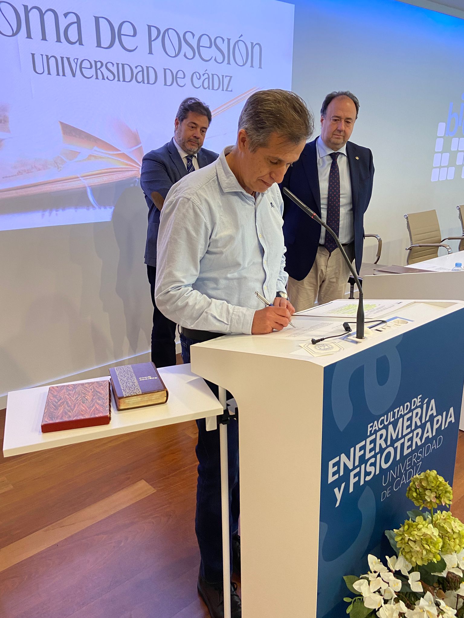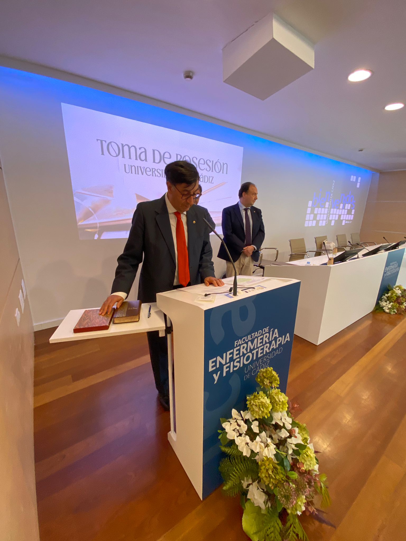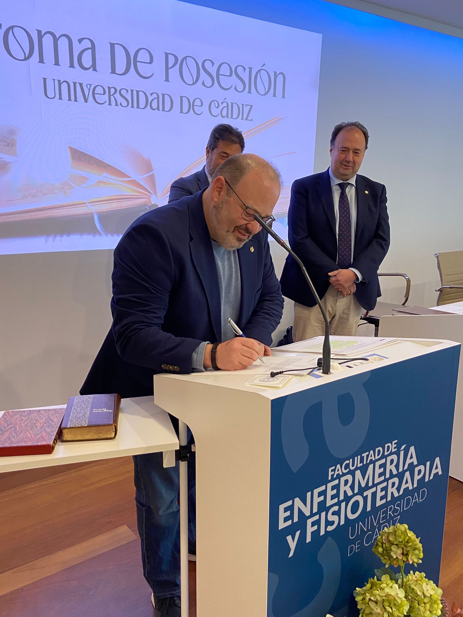 El rector de la Universidad de Cádiz, Casimiro Mantell, en compañía del secretario General, Manuel Rozados, ha presidido hoy la toma de posesión de María José Abellán, que ha jurado/prometido su cargo como decana de la Facultad de Enfermería y Fisioterapia en el salón de actos de esta misma Facultad en el Campus de Cádiz.