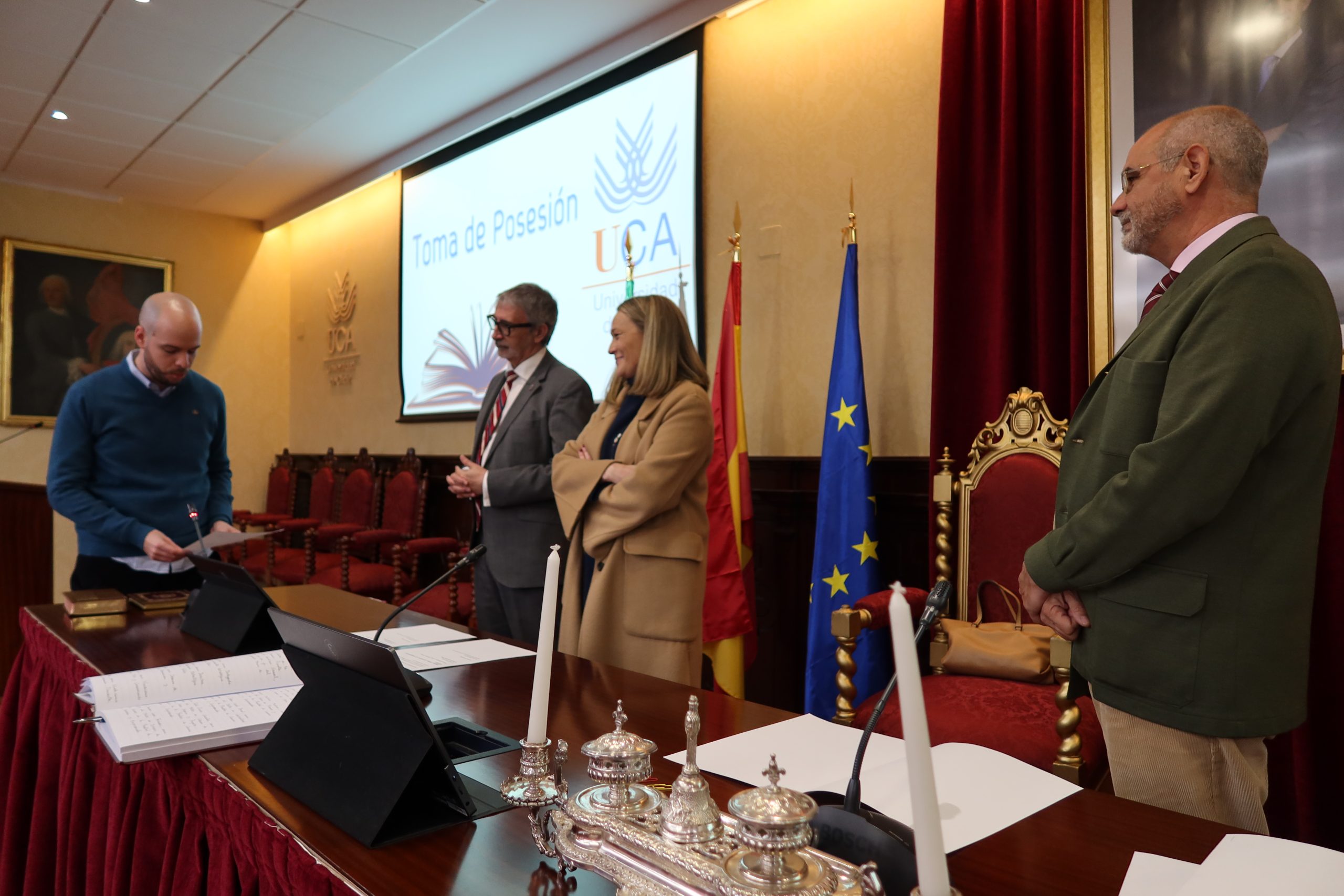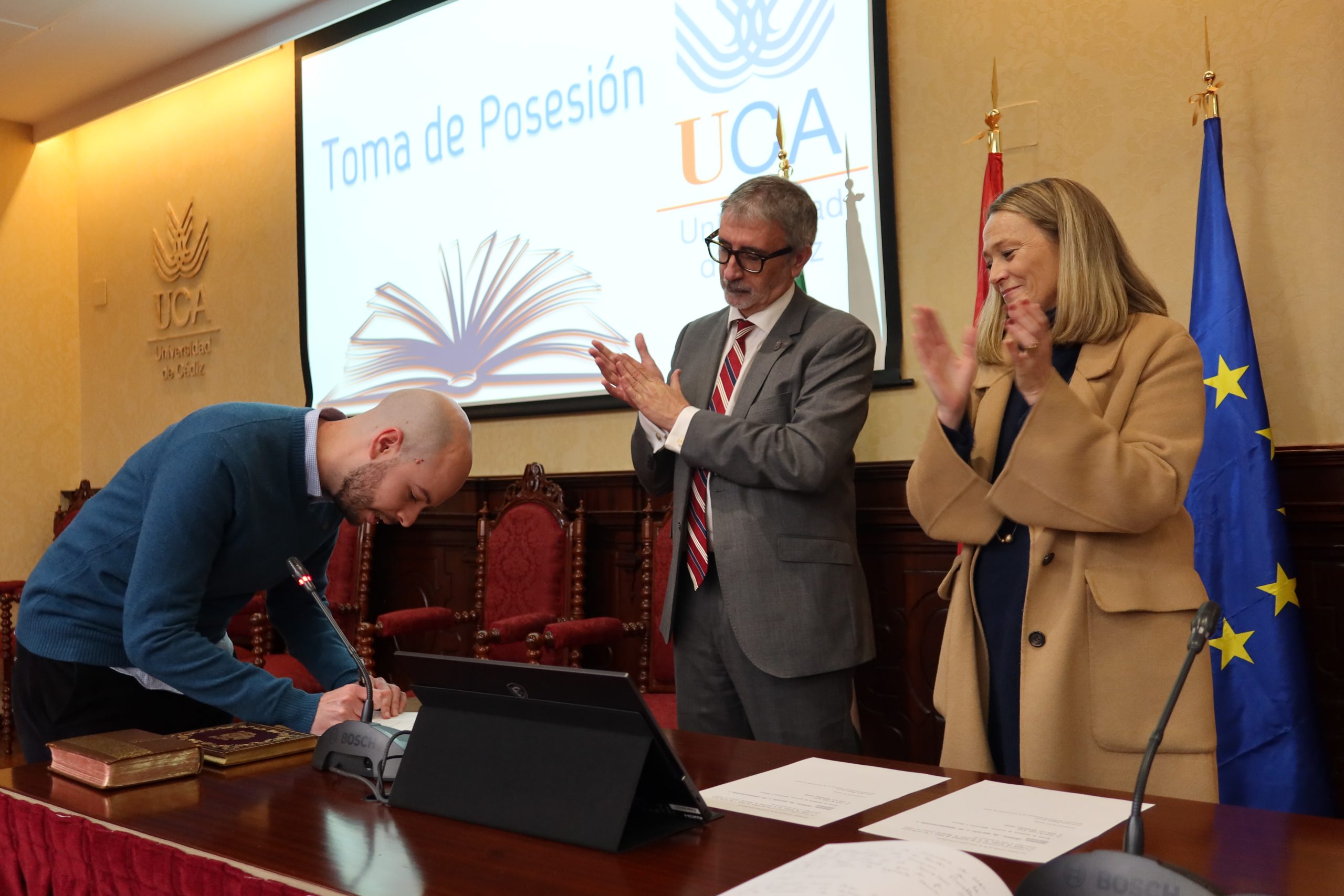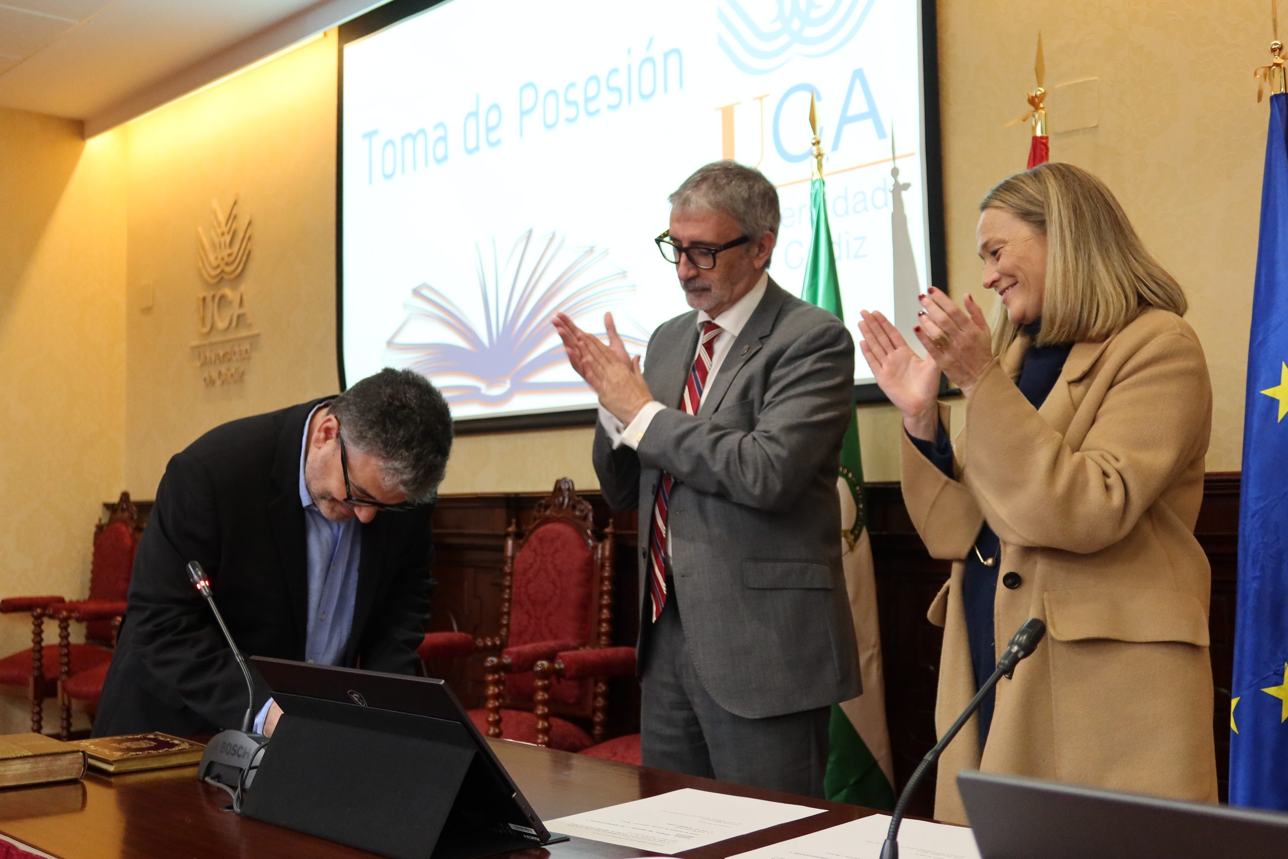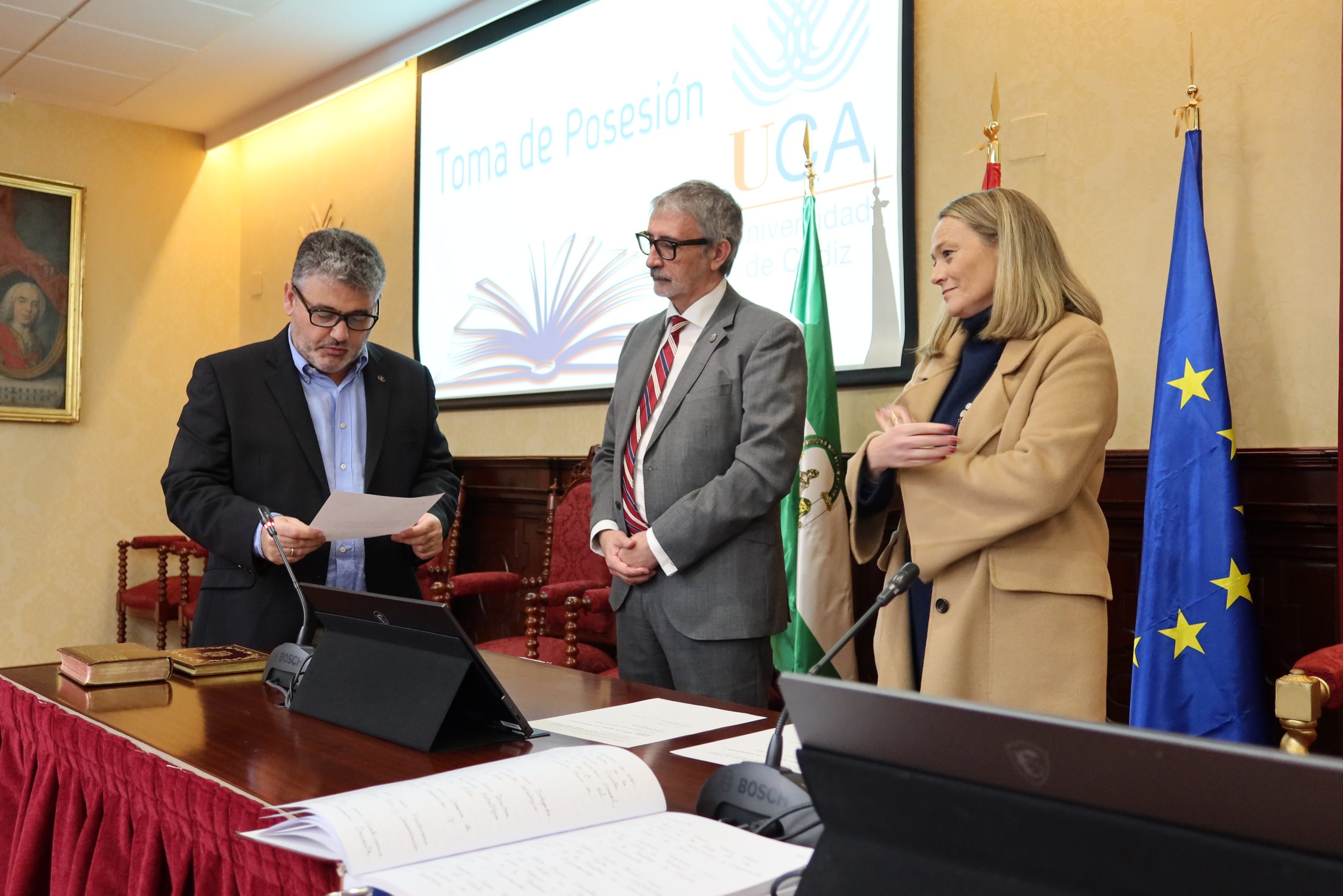 El rector en funciones de la Universidad de Cádiz, Francisco Piniella, junto con el secretario General en funciones de la UCA, José Justo Megías, y la gerente en funciones de la UCA, Mariví Martínez, ha presidido hoy, en el salón de Grados de la Facultad de Medicina, la toma de posesión de personal de Biblioteca, Archivo y Publicaciones de la Universidad de Cádiz.